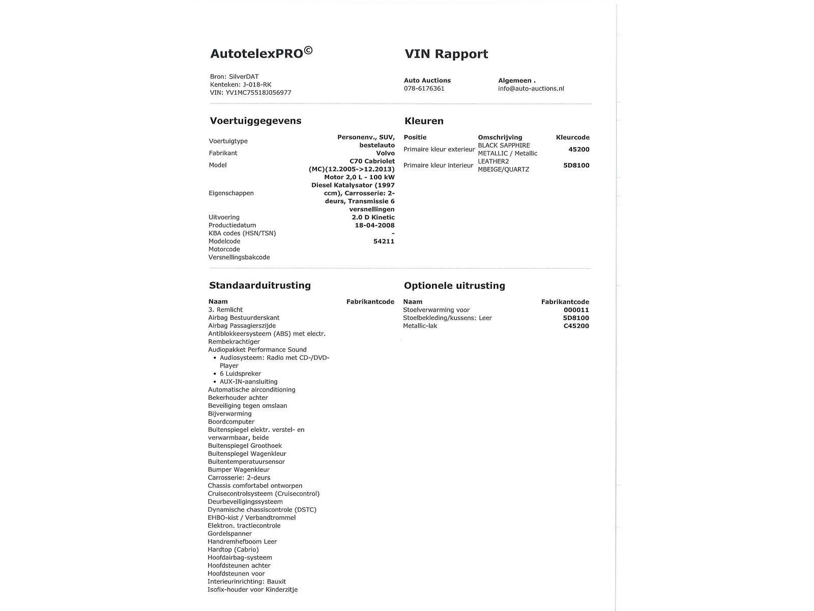 Voor vragen kunt u mailen naar info@auto-auctions.nl De cabrio dak Werkt wel Nee Kenteken: J-018-RK Merk: Volvo Model: C70 Convertible Type: 2.0D Kinetic Afgelezen kilometerstand: 273483km Cilinderinhoud: 1997cc Vermogen (kW): 100kW Brandstof: diesel Chassisnummer: YV1MC75518J056977 NAP status: Geen oordeel Datum eerste toelating: 2008-05-19 Datum eerste toelating (NL): 2020-09-29 APK vervaldatum: 2026-06-11 Vermogen (pk): 136hp Aantal zitplaatsen: 4 Maximaal trekgewicht ongeremd: 750kg Maximaal trekgewicht geremd: 1500kg Kleur: zwart Transmissie: Handgeschakeld Emissieklasse: 4 Aantal deuren: 2 Aantal sleutels: 1 Ledig gewicht: 1606kg Bruto BPM (NL): 12483€ Rest BPM: 189€ Aantal cilinders: 4 Carrosserie: cabriolet Onderhoudshistorie: Volledig Aanwezig Carfax Link: https://was.carfax.eu/v0/api/ccdid/5100016408/svc/201/vinreg/J018RK/checksum/eyJhbGciOiJIUzI1NiIsInR5cCI6IkpXVCJ9.eyJleHAiOjE3NTY2NDYzNDF9.cFhTDu_xQxOgh3Ol_FzgC0JbPu4jAopNgljfNyQ_sIg Start en rijdt: Ja