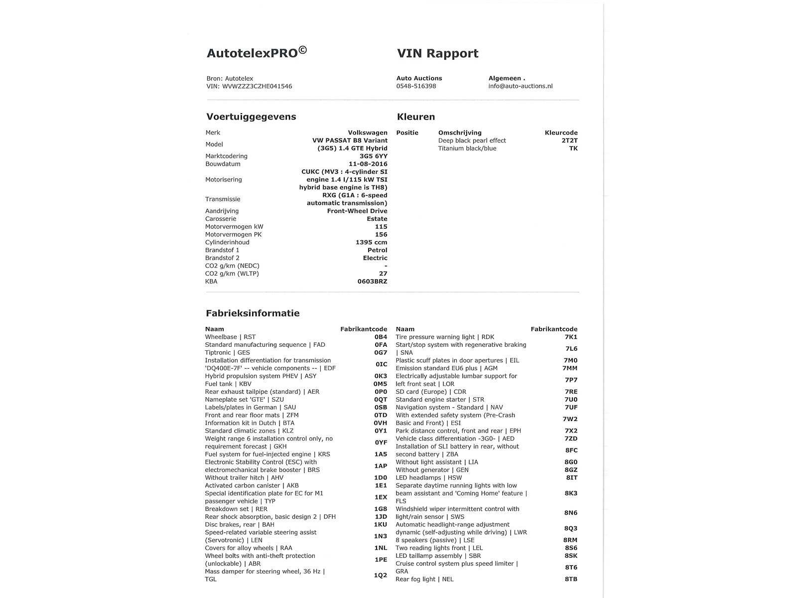 Voor vragen kunt u mailen naar info@auto-auctions.nl No Kenteken: KG-254-L Merk: Volkswagen Model: Passat Variant Type: 1.4 TSI GTE Afgelezen kilometerstand: 243191km Cilinderinhoud: 1395cc Vermogen (kW): 115kW Brandstof: Hybride Benzine Chassisnummer: WVWZZZ3CZHE041546 Laadvermogen: 0kg NAP status: Logisch Datum eerste toelating: 2016-08-31 Datum eerste toelating (NL): 2016-08-31 APK vervaldatum: 2026-08-31 Vermogen (pk): 155hp Aantal zitplaatsen: 5 Kleur: zwart Transmissie: Automaat Emissieklasse: 6 Aantal deuren: 5 Ledig gewicht: 1635kg Bruto BPM (NL): 397€ Aantal cilinders: 4 Carrosserie: stationwagen Onderhoudshistorie: Volledig Aanwezig Carfax Link: https://was.carfax.eu/v0/api/ccdid/5100016408/svc/201/vinreg/KG254L/checksum/eyJhbGciOiJIUzI1NiIsInR5cCI6IkpXVCJ9.eyJleHAiOjE3NjU3MjMxNTR9.pXNEhedefdnn7uvA5Xggp1HtOAzm_abKAe9Y6JsuD6s