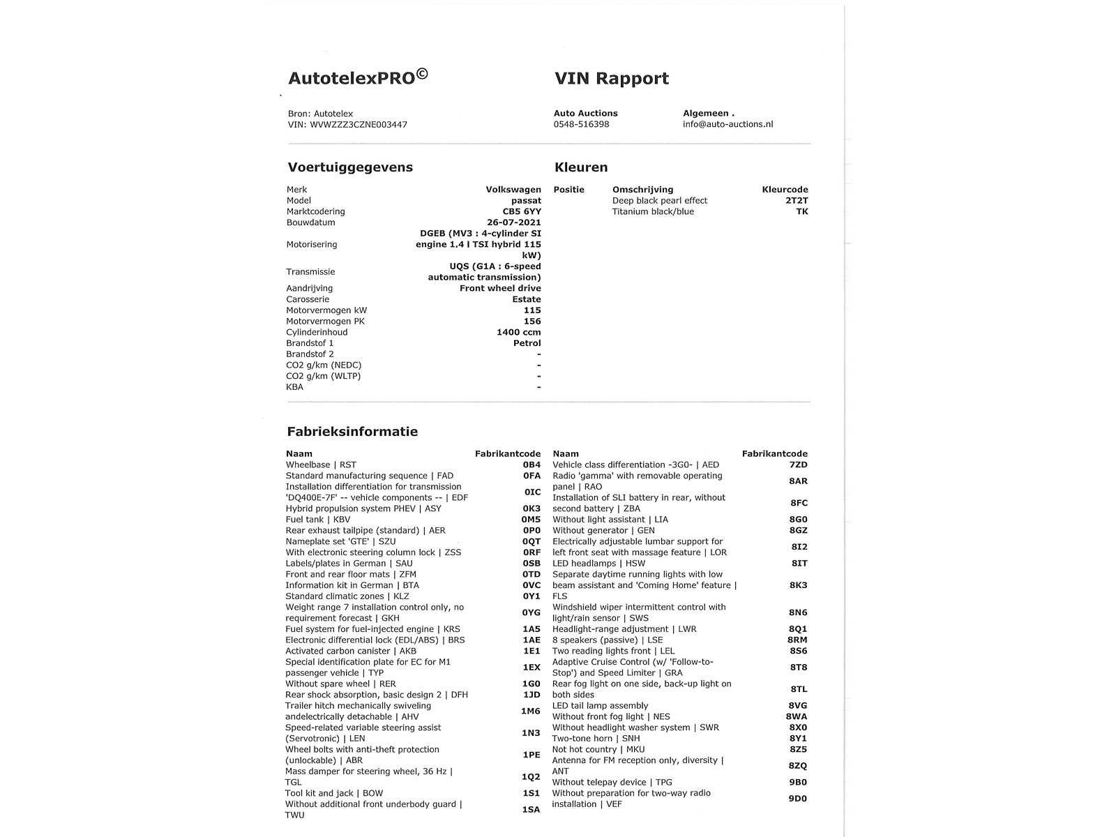 Duitse kenteken papieren. Indien gewenst kunnen wij het gehele import proces voor u verzorgen, RDW invoer, BPM taxatie, Douane afwikkeling, stalling etc. Voor deze auto zijn de totale invoerkosten inclusief de BPM €1.195.- Dus voor €1.195.- boven op uw aankoopprijs verzorgen wij het NL kenteken voor u. (This option is only for Dutch buyers) Voor vragen kunt u mailen naar info@auto-auctions.nl No Kenteken: Duitse kenteken papieren Merk: Volkswagen Model: Passat Type: Variant GTE 1.4 TSI PHEV Afgelezen kilometerstand: 140699km Cilinderinhoud: 1395cc Vermogen (kW): 160kW Brandstof: Hybride Benzine Chassisnummer: WVWZZZ3CZNE003447 Datum eerste toelating: 17-09-21 Vermogen (pk): 218hp Aantal zitplaatsen: 5 Kleur: Deep Black Pearlescent Transmissie: Automaat Aantal deuren: 5 Aantal cilinders: 4 Carrosserie: Stationwagen Nationaliteit documenten: Duitse kenteken papieren CVO verklaring: true Onderhoudshistorie: Digitaal volledig aanwezig Start en rijdt: Ja oplaadkabel : Aanwezig
