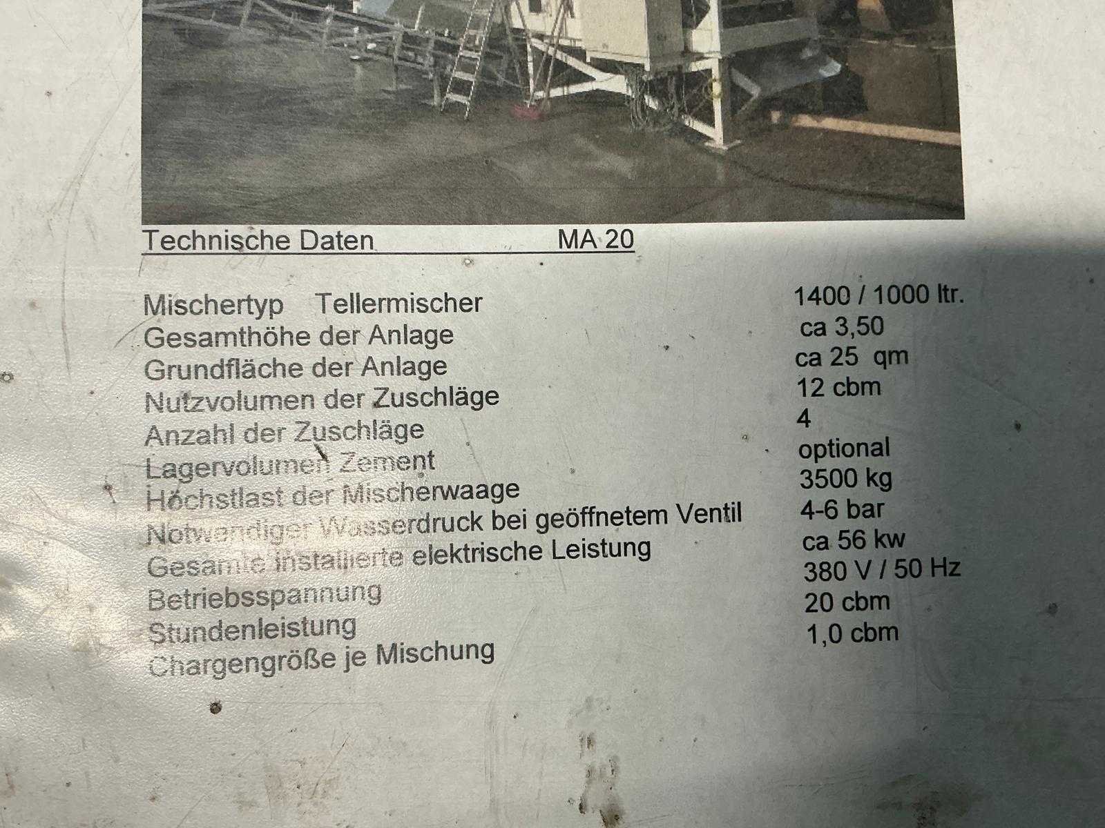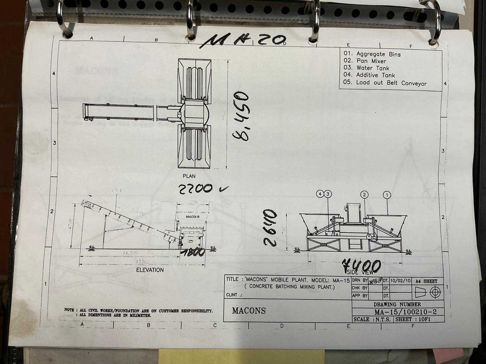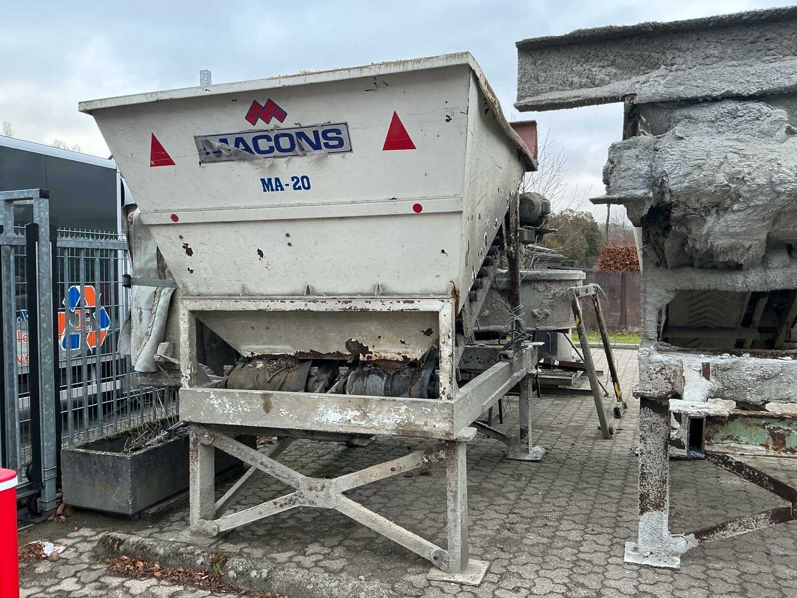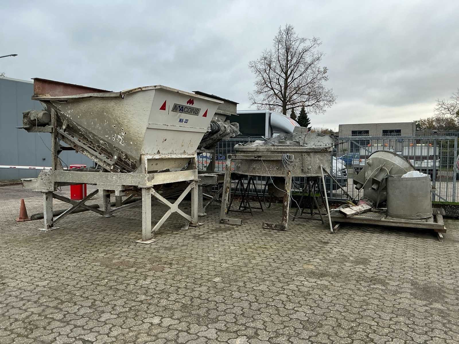 Bestaat uit: horizontale trommelmenger 1400Ltr, 4 aanvoerbanden voor 4 fracties, max. 3500kg belasting mixer, benodigde waterdruk 4-6 bar, elektrisch vermogen ca. 56kW, productie ca. 20M3/uur, charge grote per menging ca. 1000Ltr, mixermotor 30kW, betreft een reeds gedemonteerde machine, gereed voor transport, documentatie aanwezig, gebruiksaanwijzing, schema's. No Merk: Macons Type: MA20 Eigen gewicht: 10000kg