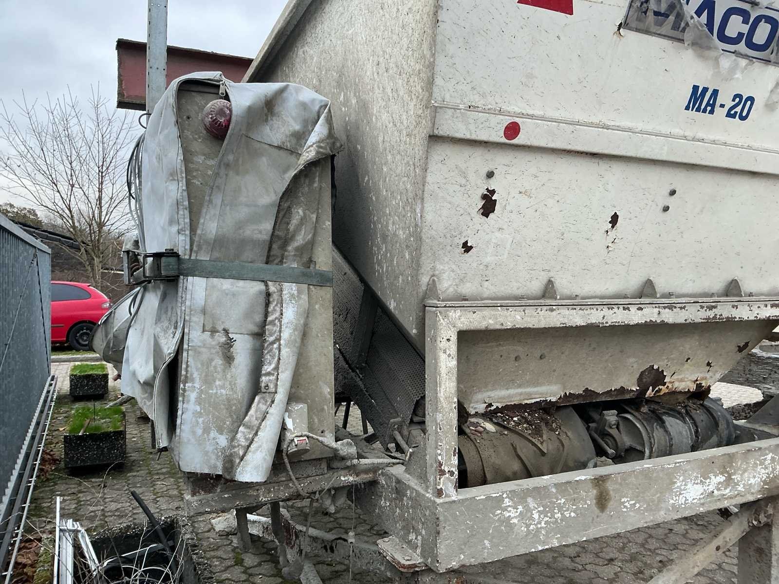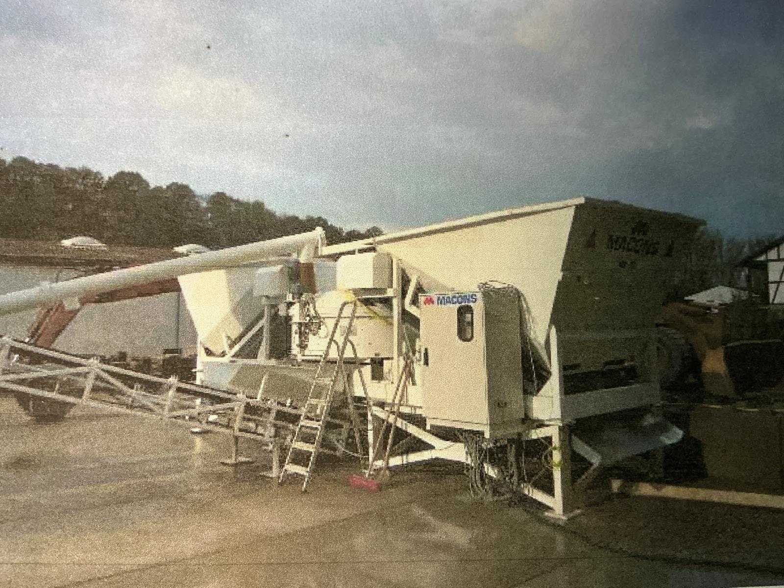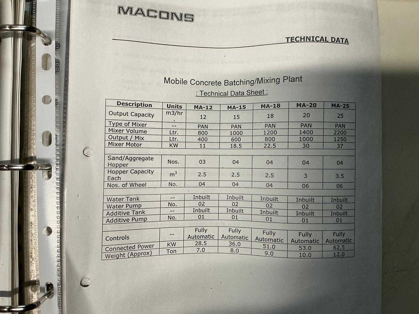Bestaat uit: horizontale trommelmenger 1400Ltr, 4 aanvoerbanden voor 4 fracties, max. 3500kg belasting mixer, benodigde waterdruk 4-6 bar, elektrisch vermogen ca. 56kW, productie ca. 20M3/uur, charge grote per menging ca. 1000Ltr, mixermotor 30kW, betreft een reeds gedemonteerde machine, gereed voor transport, documentatie aanwezig, gebruiksaanwijzing, schema's. No Merk: Macons Type: MA20 Eigen gewicht: 10000kg