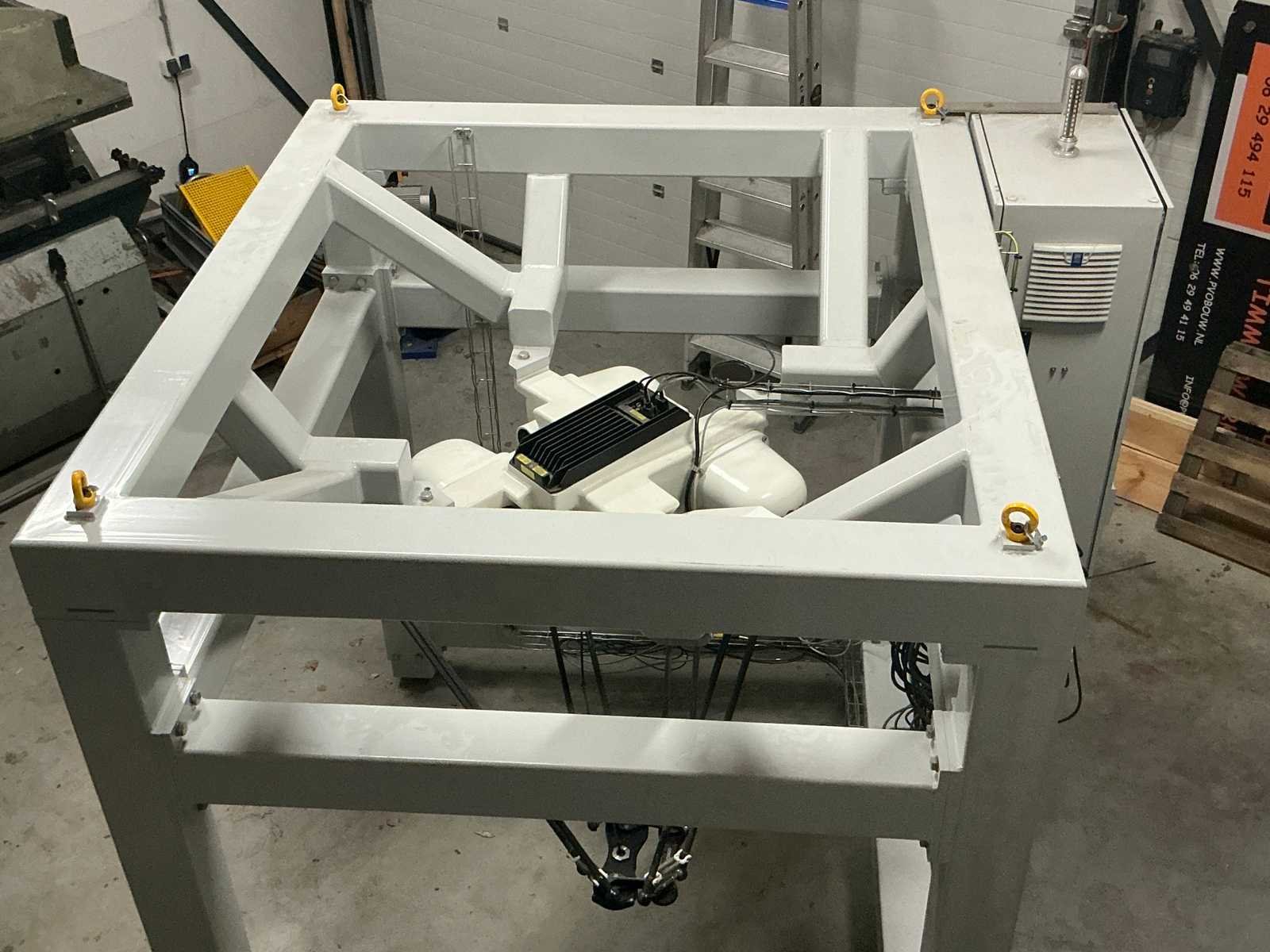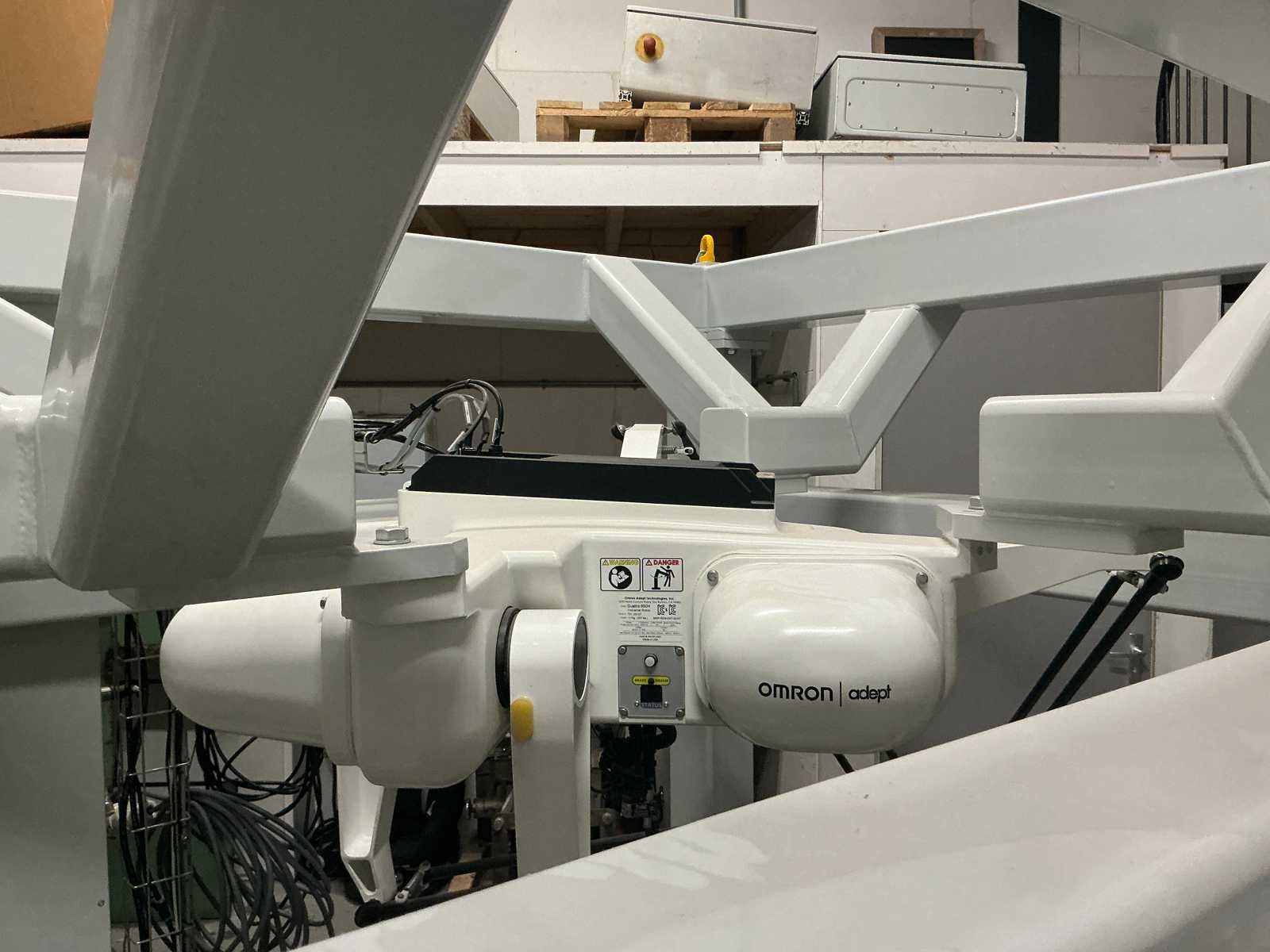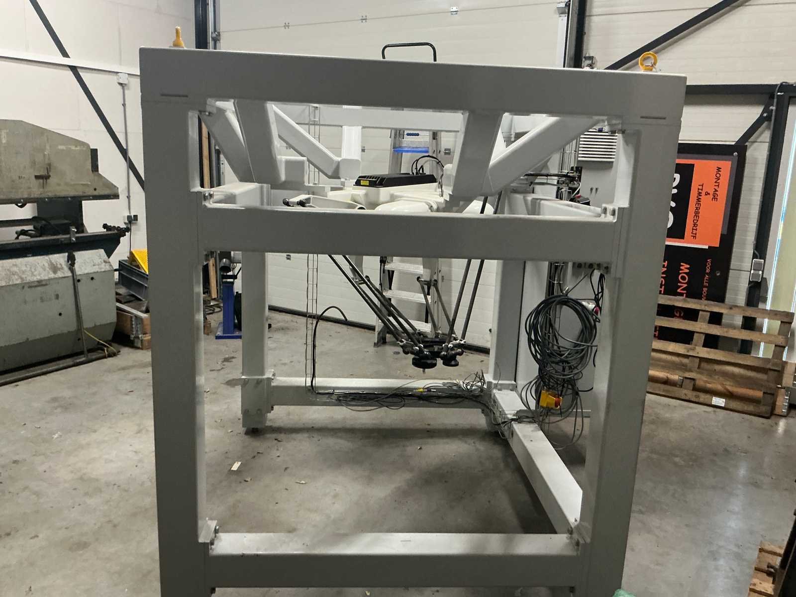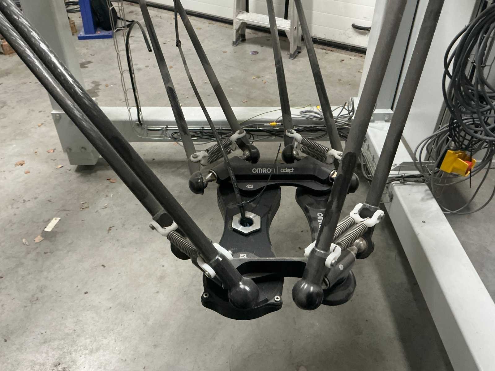 Omron Quattro 650H HMI parallel robot in stalen frame gemonteerd stalen buis frame, voorzien van controle kast (Omron adept) Frame is voorzien van hijsogen. Stalen frame bestaat uit stalen buis 15x15cm wit gespoten. No Merk: Omron Model: Quattro 650H Bouwjaar: 2017 Kleur: Wit Lengte: 215cm Breedte: 200cm Hoogte: 215cm Materiaal: Staal