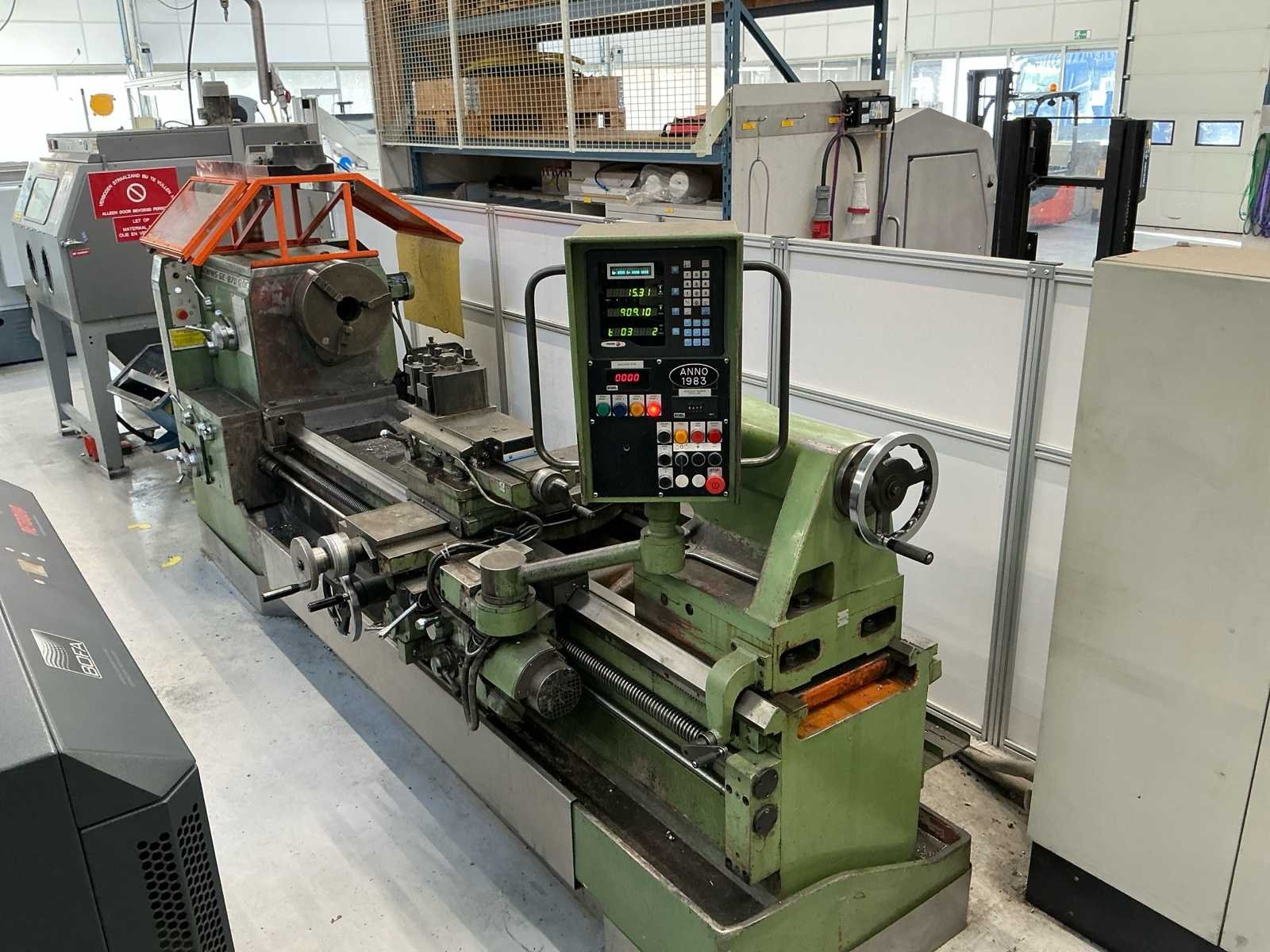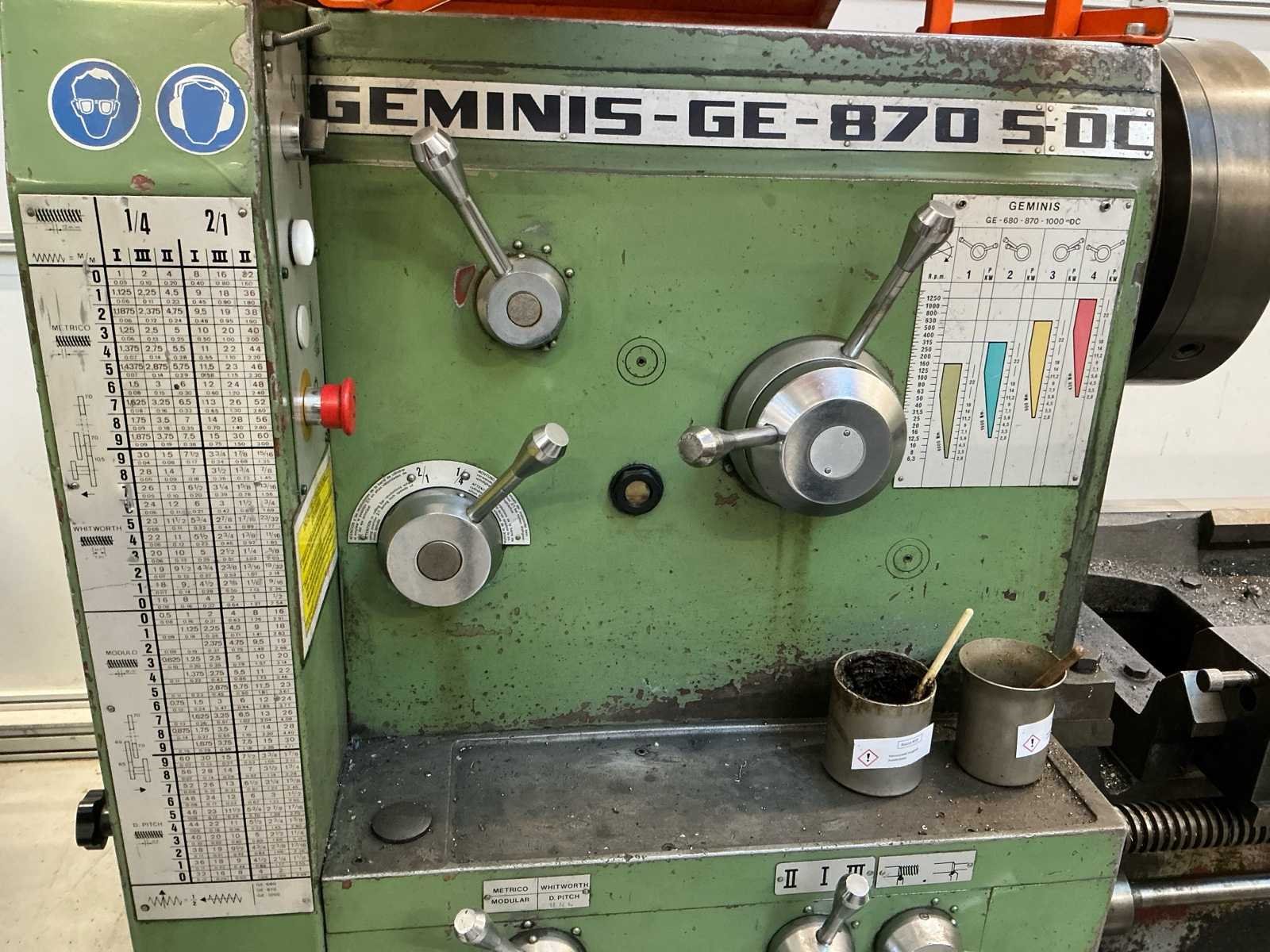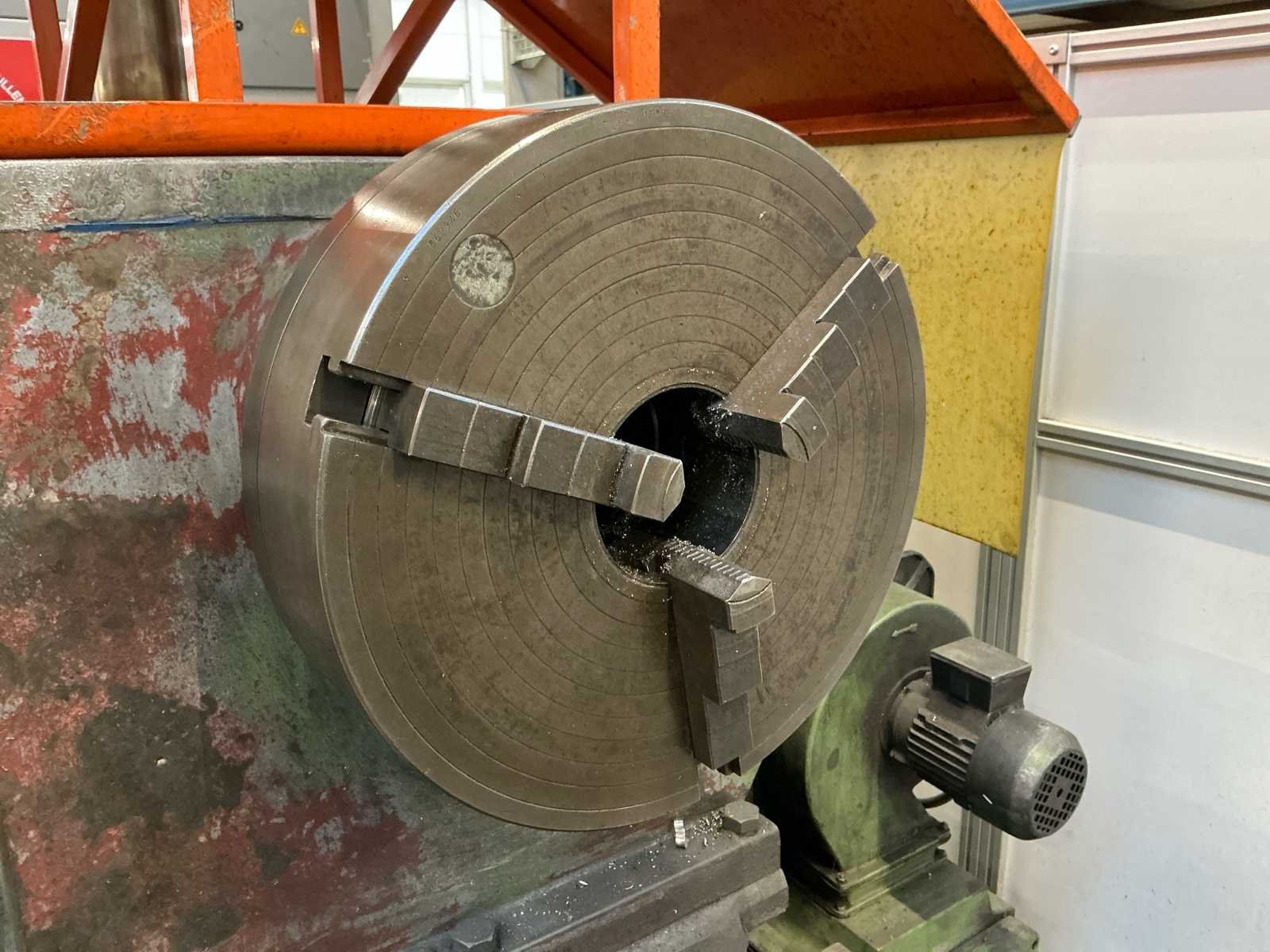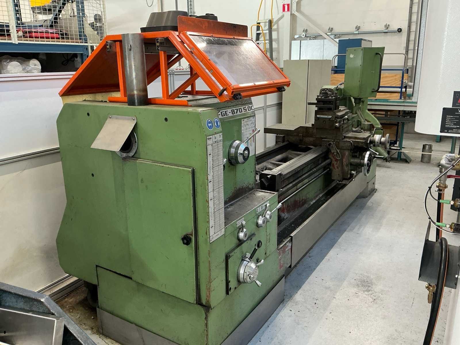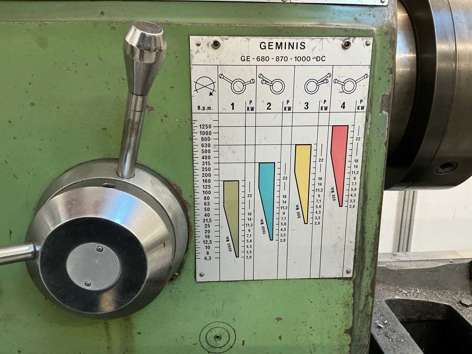 Voorzien van: Geminis GE870S, afstand tussen punten: 2.000 mm, digitale aflezing, elecktrische schakelkast, draadsnijklok, reduceerbus voor hoofdspil, 1 vast center, 1x hoofdspil boring 104mm, 1x hoofdspil boring 162mm, snelverstelling, motor 18,6kW, vaste bril, zelfcenterende 3 klauwplaten 500mm, onafhankelijke 4 klauwplaten 900mm, afmetingen DIN spilneus 8-11, spilsnelheden 18n standaard reeks 13-1000, snelle reeks 16-1250, spoed draadspil 6mm, 48 metrische spoeden van 0,5-30mm, 30 withwort 3/4-50, 48 langsaanzetten, 48 dwarsaanzetten, lengte bedslede 800mm, breedte dwarsslede 350mm, slag van dwarsslede 465mm, slag beilethouder 250mm, beitelschahchtafmeting 40x40mm, spilbusdiameter 100mm, slag spilbus 310mm, spilbusopname Morse 6, bedbreete 550mm, hoogte tot vlakke leibaan 805mm, doorlaat vaste bril 23-350, doorlaat meelopende bril 15-140mm, dubbelwandig bed met grote doorvalopening, 2 stuks 4 klauwen, koppel 5600Nm, ca. 10 stuks beitelhouders met diverse beitels, slijtplaatjes, opname conussen, inspanklauwen, en centers, documentatie aanwezig, aankoopfactuur, schema's, onderhouden machine, jaarlijks gekeurd. No Merk: Gemins Type: GE-870 S-DC Bouwjaar: 1986 Serienummer: N5099hv480 Draailengte: 3000mm Holle spil Ø: 100mm Aantal snelheden: 18 Besturing, merk, type: Fagor Aansluiting: 380V Machinegewicht: 6000kg Afmeting l: 4000mm Afmeting b: 1400mm Afmeting h: 2000mm