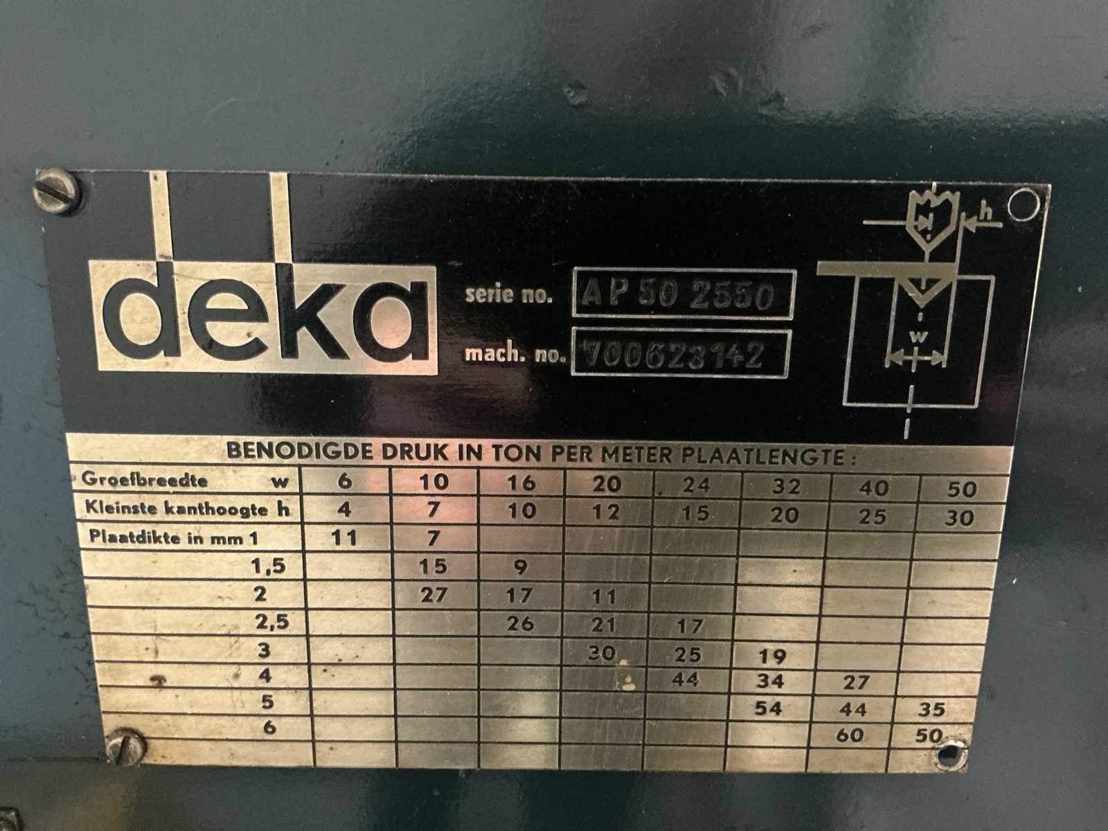 Nee Merk: Deka Type: AP50 2550 Serienummer: 700623142 Capaciteit.: 50t Werklengte: 2550mm Aansluiting: 400V Afmeting l: 2550mm Afmeting b: 1060mm Afmeting h: 2100mm