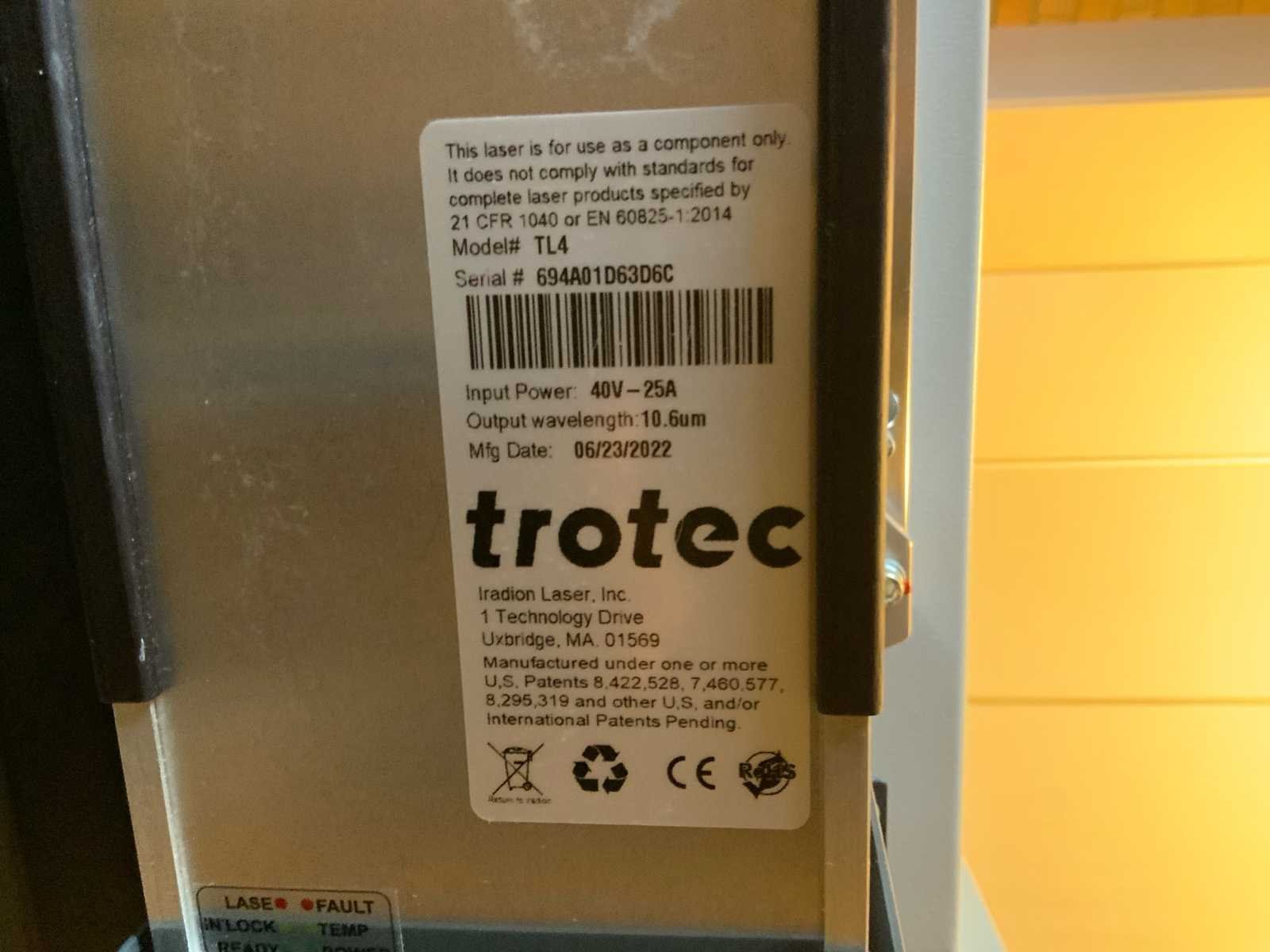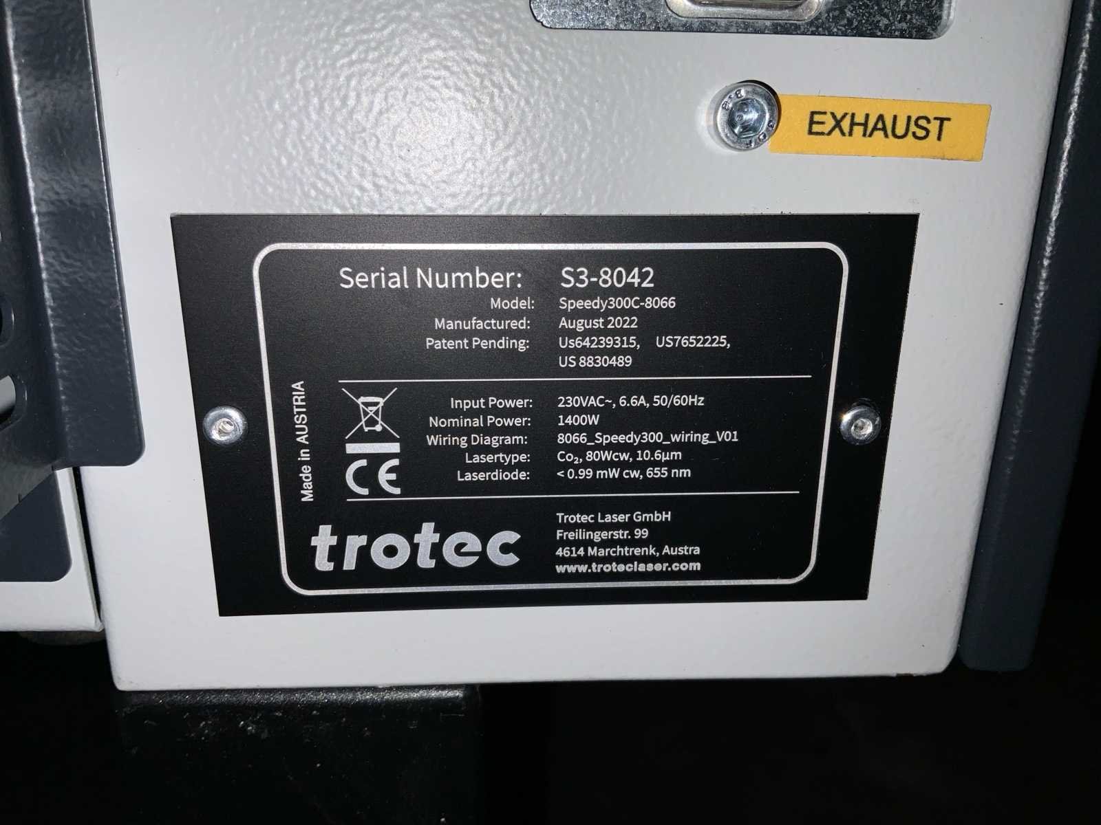 Voorzien van Atmos Pure 300 afzuiging afmeting circa 54x54x102cm * in diepte verstelbaar bed * bewerkingsoppervlakte 74x44cm * 80 watt vermogen * jaarlijks onderhoud door leverancier gehad * bij laatste meting unit was de laser 92 watt * bouwjaar 2020 * voorzien van voedingskabel en onderhoudsset * verrijdbaar Nee Merk: Trotec Type: Speedy 300 Serienummer: S3-8042 Aansluiting: 230V Machinegewicht: 150kg Totale afmeting L: 1120mm Totale afmeting Breedte: 900mm Totale afmeting Hoogte: 1010mm