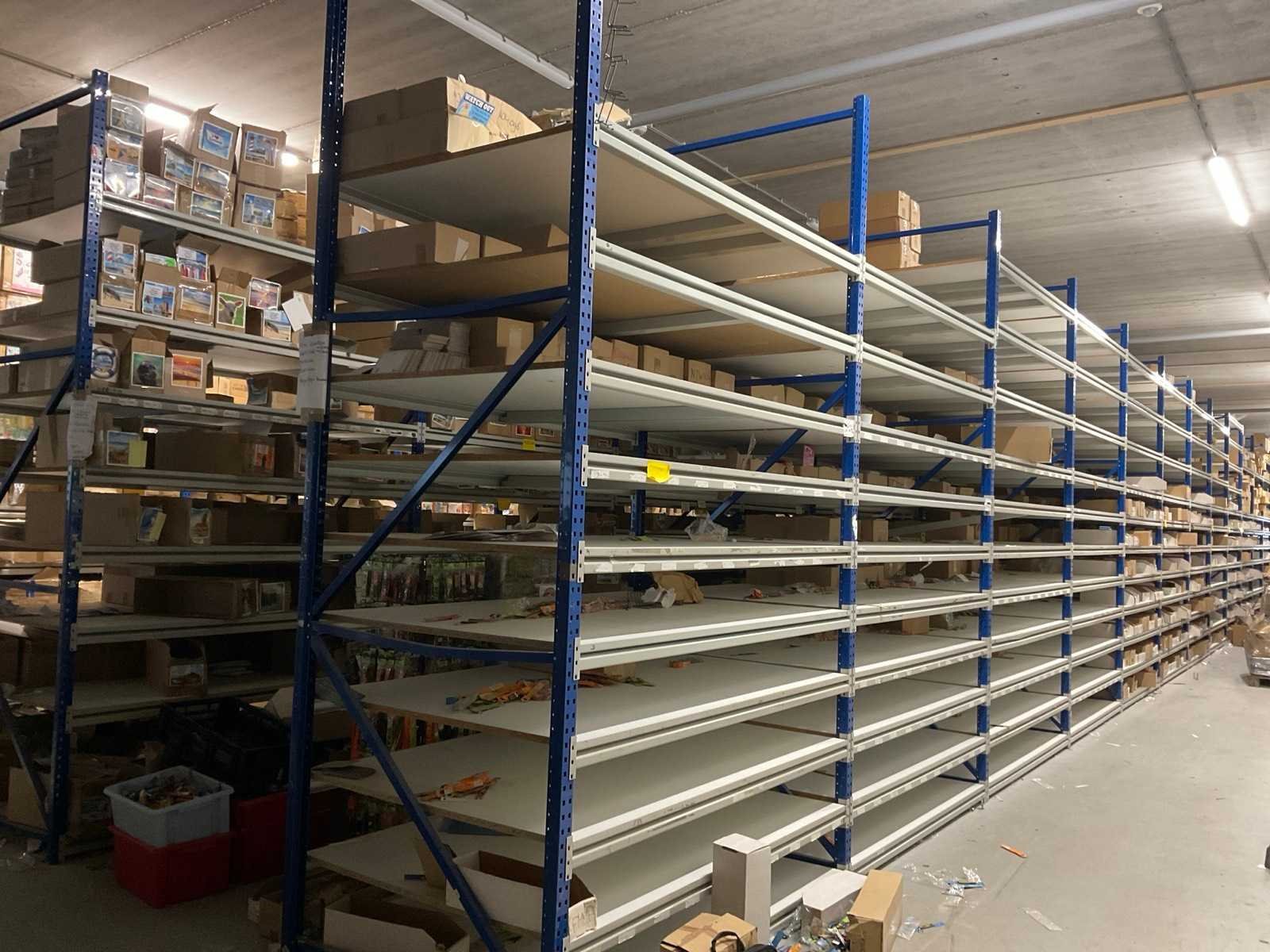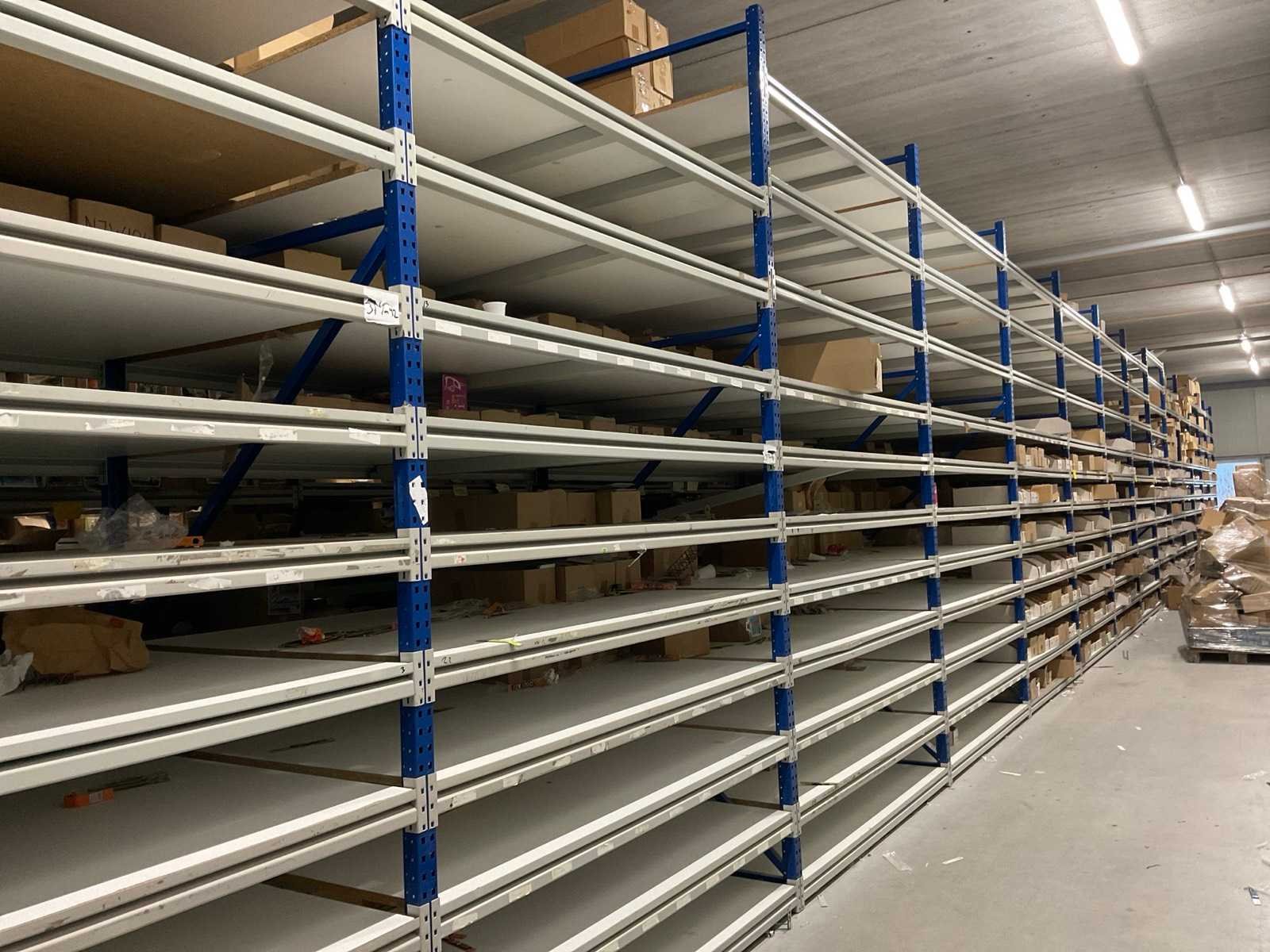 Totale lengte: 280 meter, bestaande uit: 108x dubbele staanders (3500mm hoog), 41x dubbele staanders (2300mm hoog), 13x dubbele staanders (3400 hoog), 2x dubbele staanders (2800mm hoog), 13x dubbele staanders (3800mm hoog), 2418x enkele liggers (2 per legbord) No Sectie afm. b: 1930mm Sectie diepte: 1200mm Aantal staanders: 177 Aantal liggers: 2418 Aantal legborden: 1209 Demontabel: true Materiaal: staal