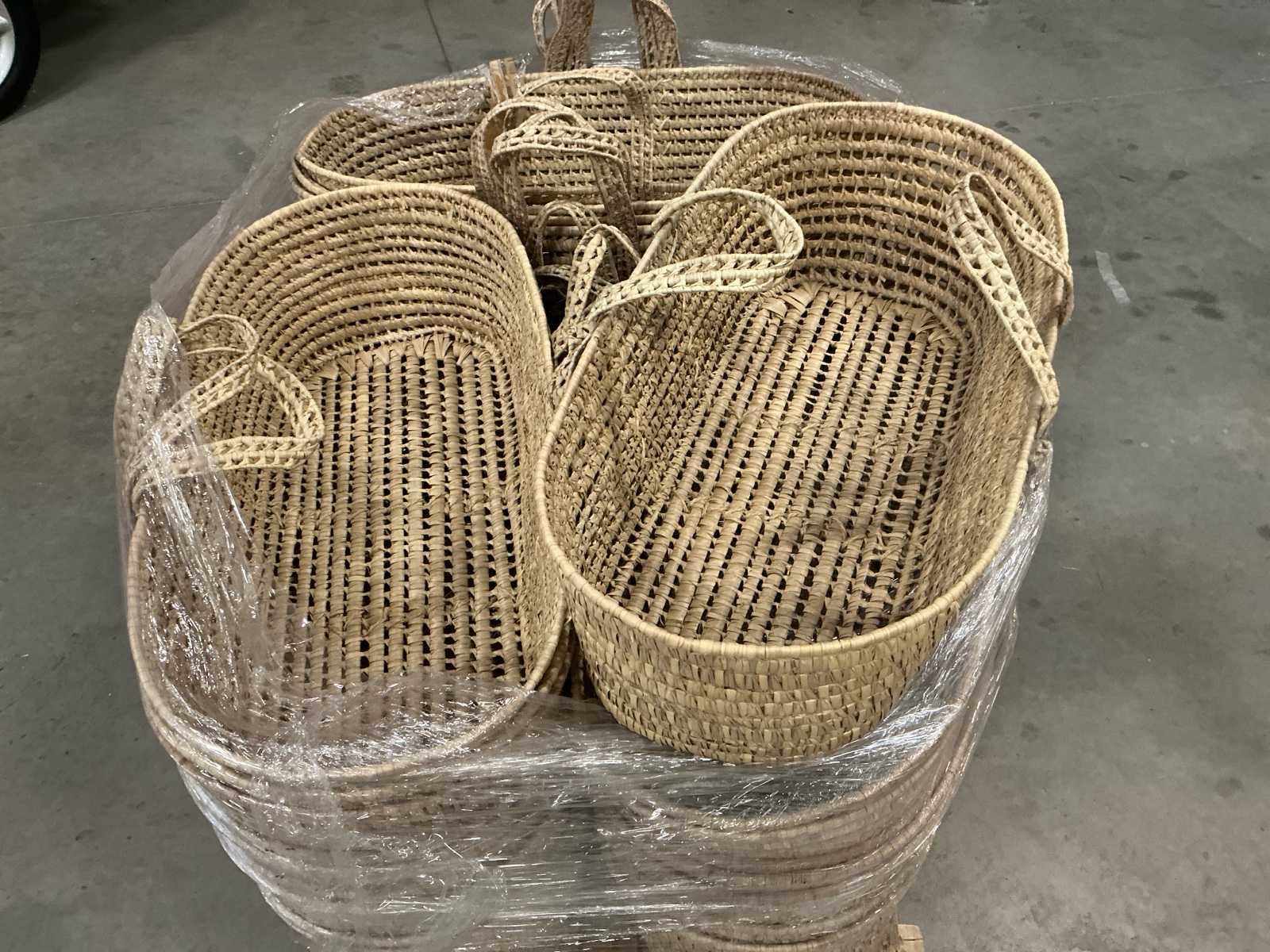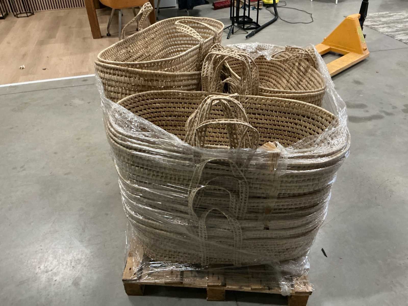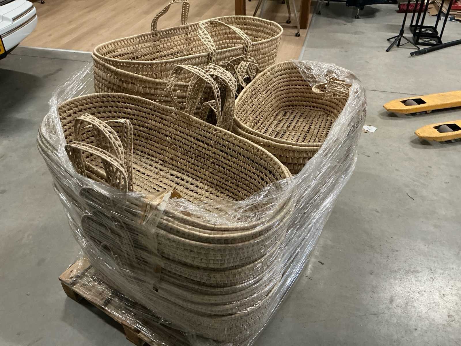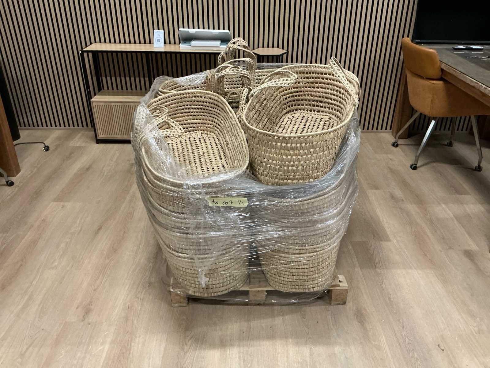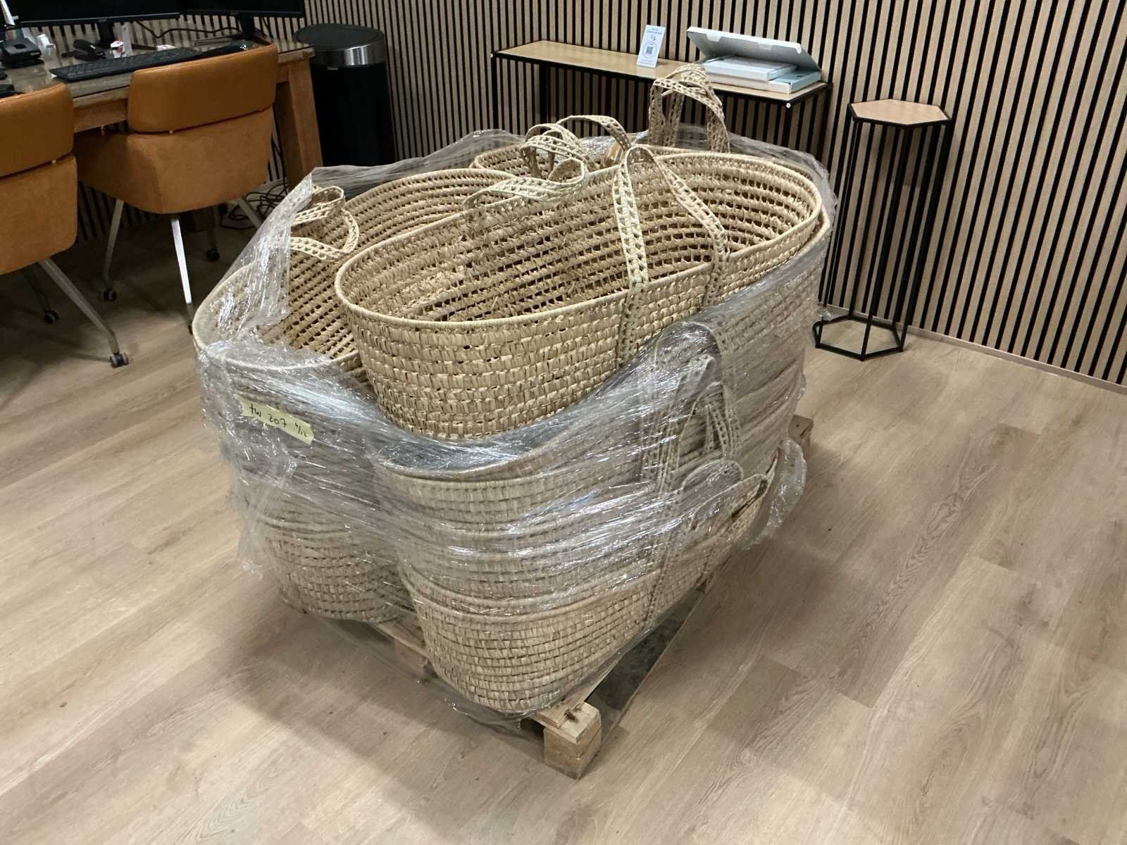 Bestaat uit: Pallet 207, partij decoratieve manden, ovale vorm, gevlochten rotan, afmetingen mand ca. 400x850x250mm, ca.25 stuks. No