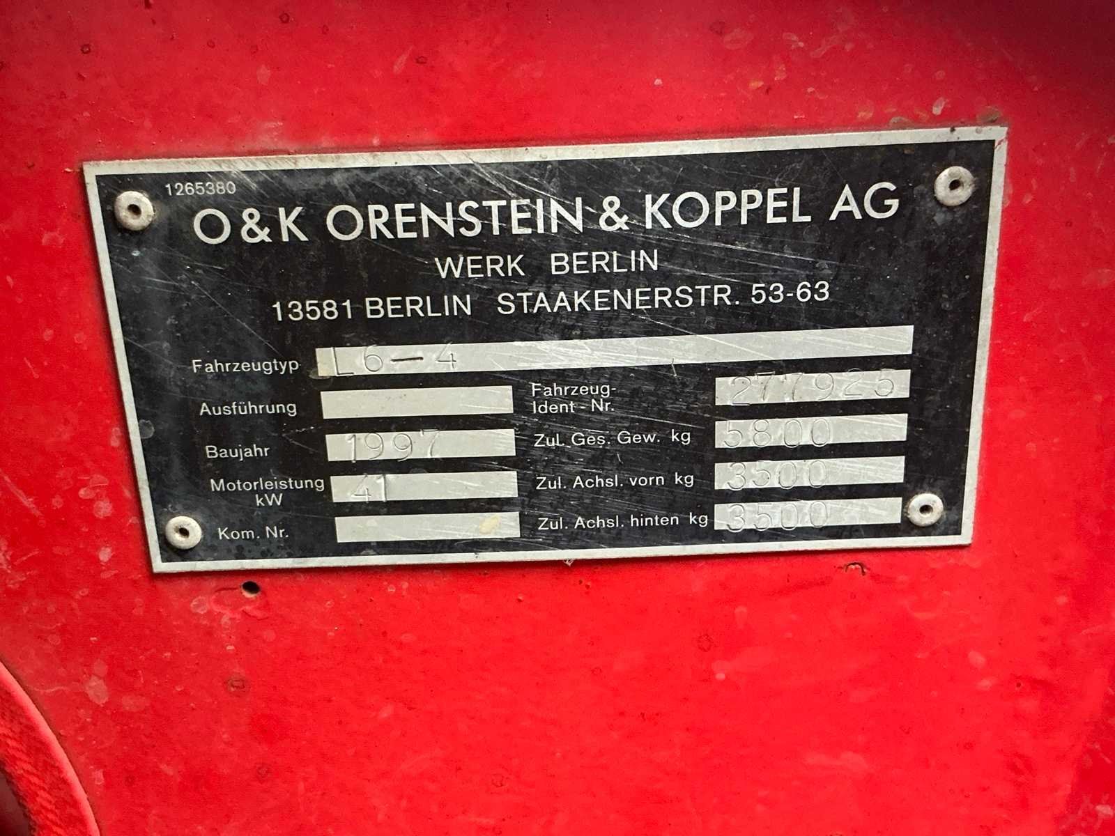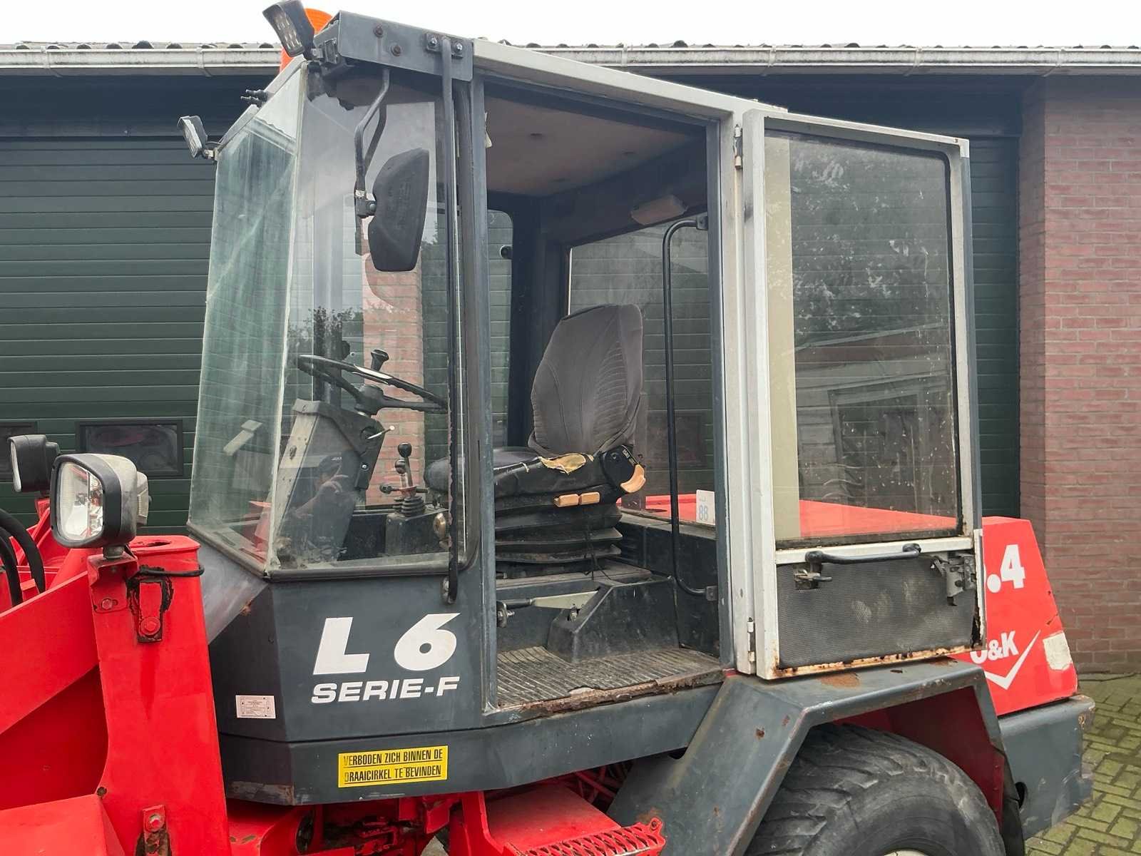Voorzien van snelwissel, lepels, graafbak, extra ventiel, hefvermogen: 3500 kg, hydraulische schijfremmen. Lage versnelling circa 5 km per uur en hoge tot 15 km per uur. Nee Merk: O&K Type: L6-4 Bouwjaar: 1997 Serienummer: 277925 Merk motor: Deutz BF4M 1012 Kenteken: TTK-02-T Motorvermogen (kW): 41kW Aantal cilinders: 4 Brandstof: diesel Bedrijfsgewicht: 5800kg Graafbak afm. l: 2000mm Graafbak afm. b: 700mm Graafbak afm. h: 850mm Bandenmaat: 14/80 R20 Cabine: true Afgelezen urenstand: 8639 Totale afmeting L: 4800mm Totale afmeting Breedte: 1900mm Totale afmeting Hoogte: 2750mm