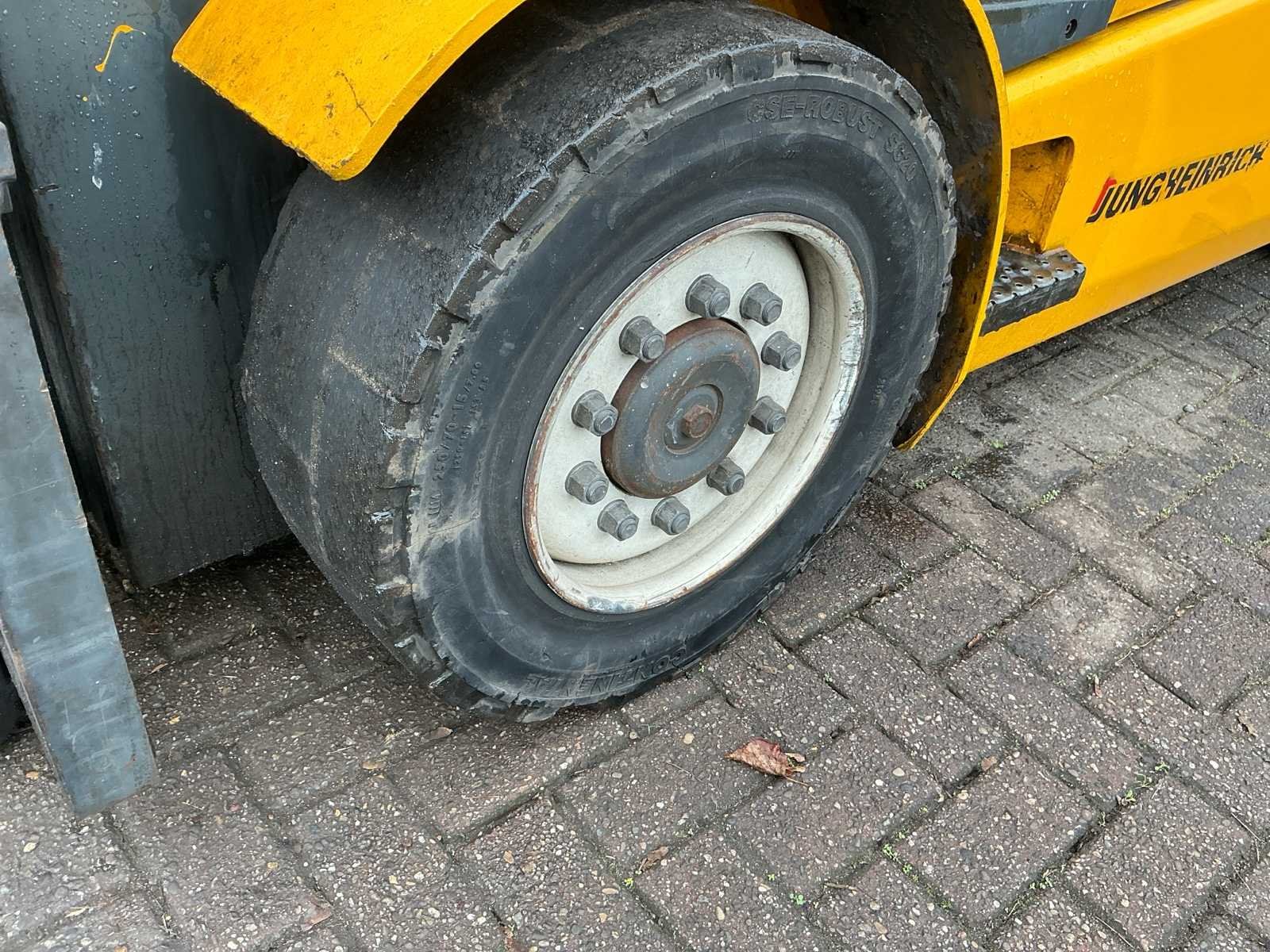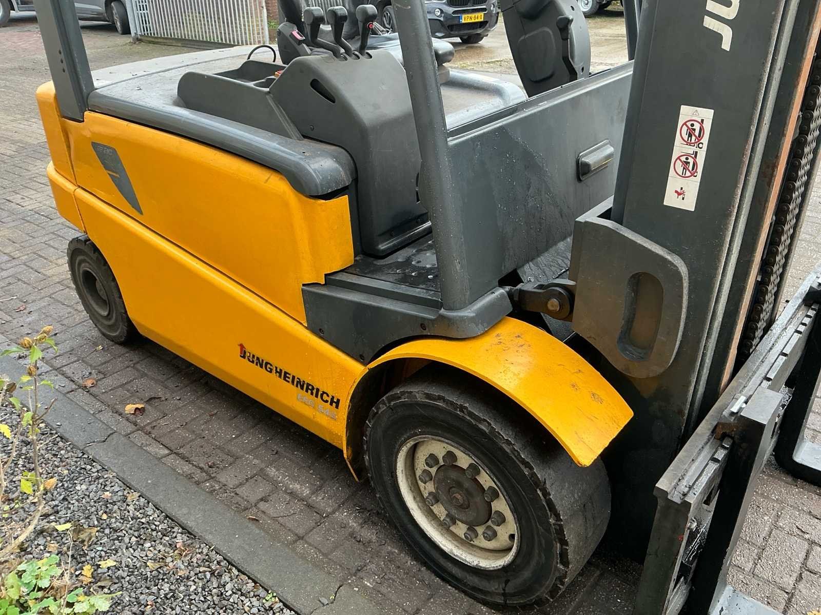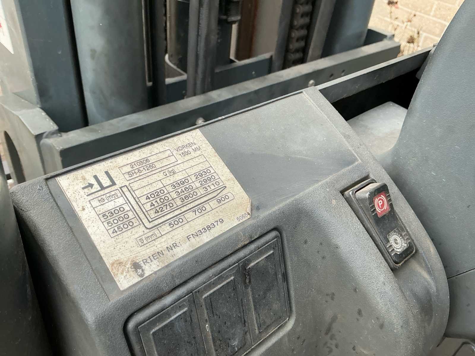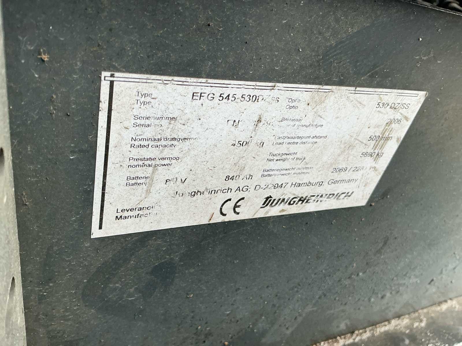 Accu is van 2018 Storing op display Nee Merk: Jung Heinrich Type: EFG545530D7 Bouwjaar: 2006 Aantal wielen: 4 Accu lader: true Free-lift: true Side-shift: true Triple mast: true Eigen gewicht: 5690kg Hefvermogen: 4500kg Lepellengte: 1500mm Max. hefhoogte: 5300mm Vol rubber banden: true Totale afmeting L: 4370mm Totale afmeting Breedte: 1150mm Totale afmeting Hoogte: 2540mm