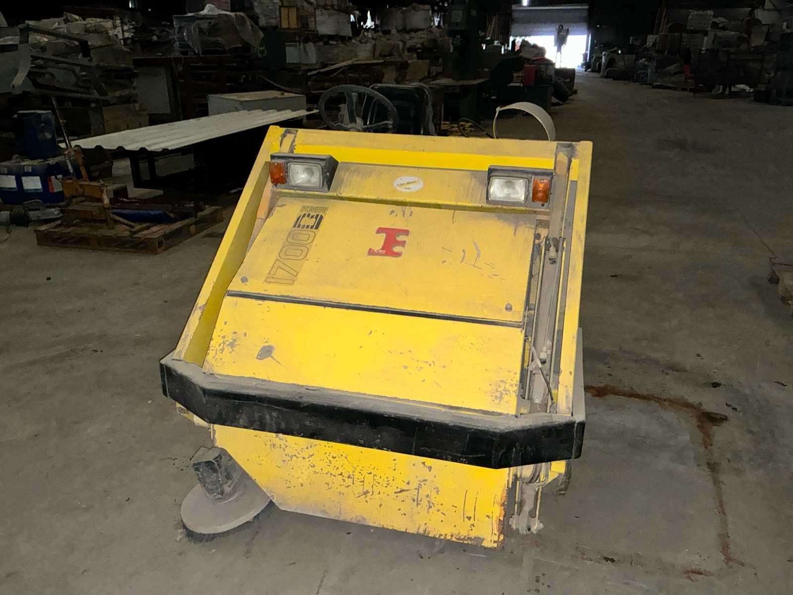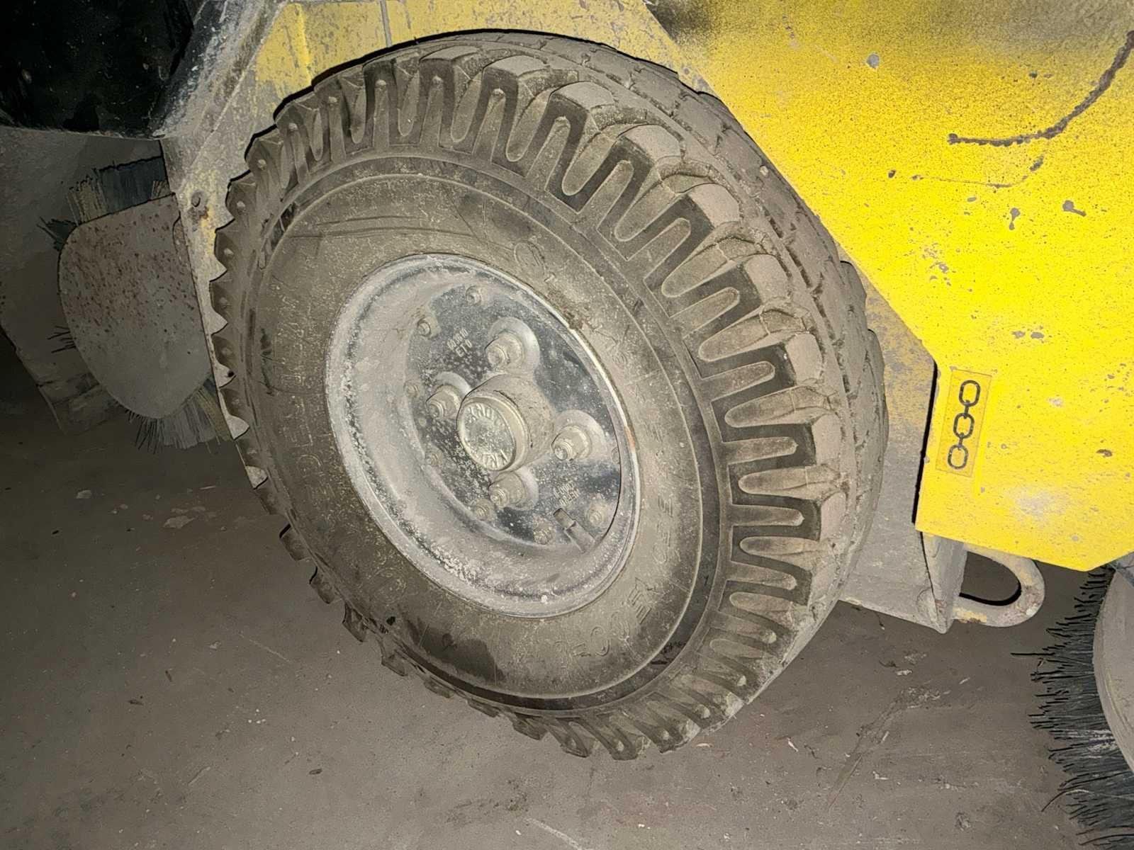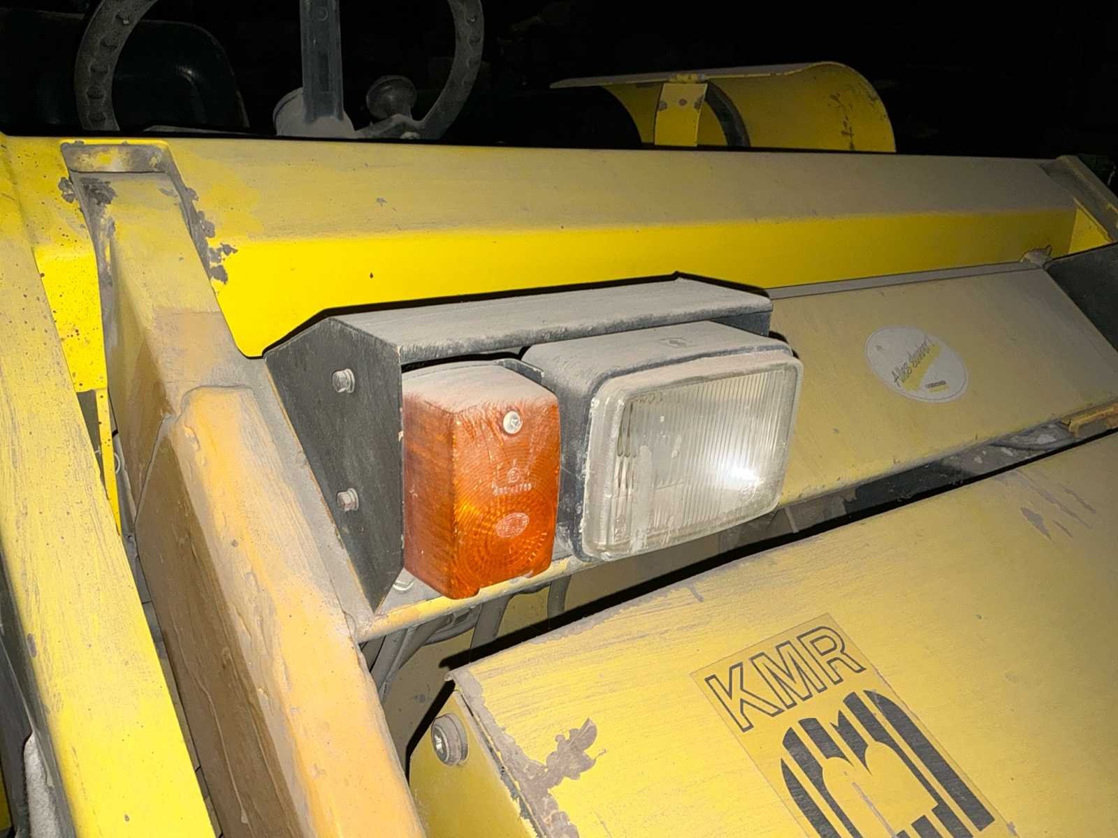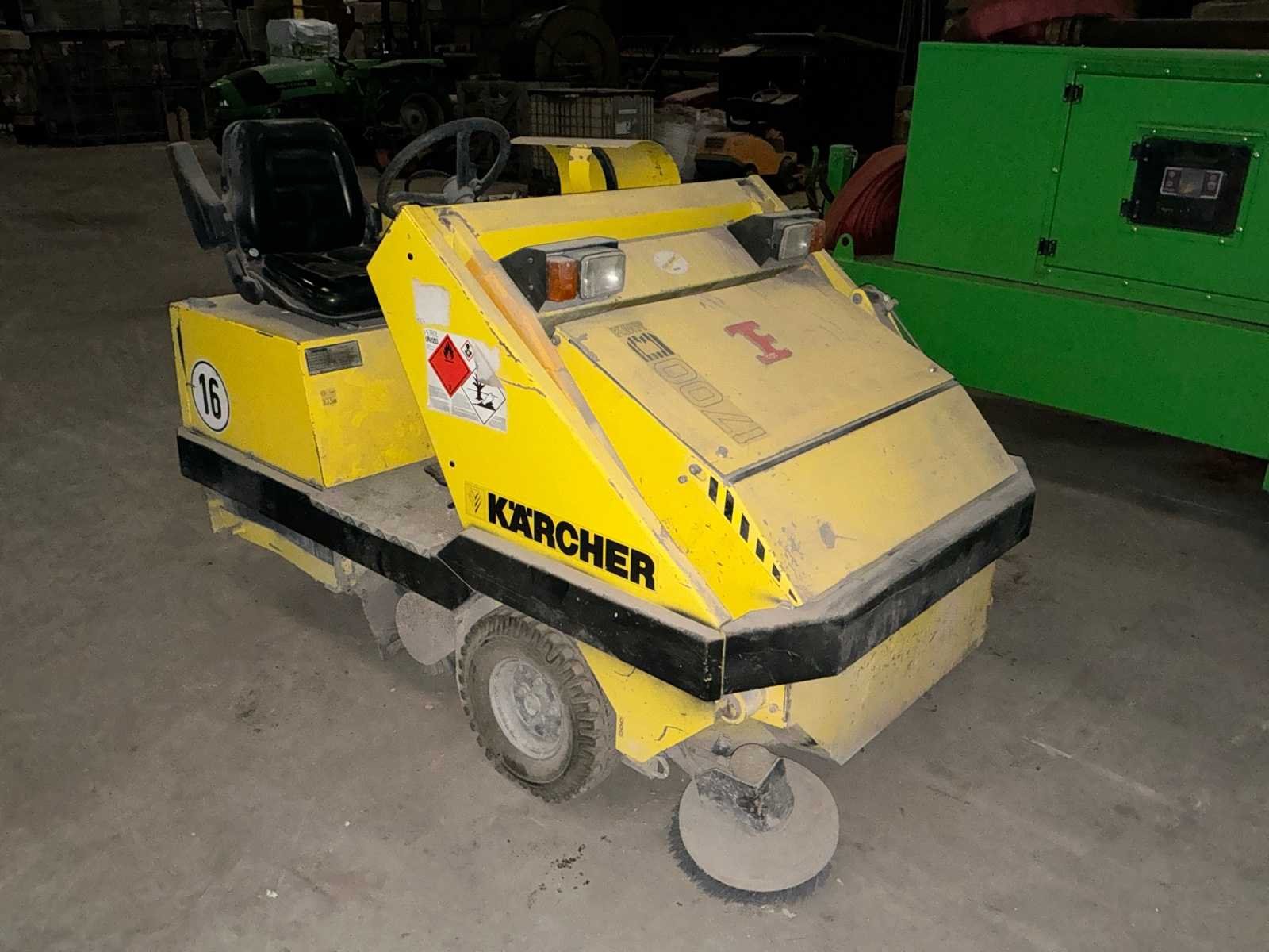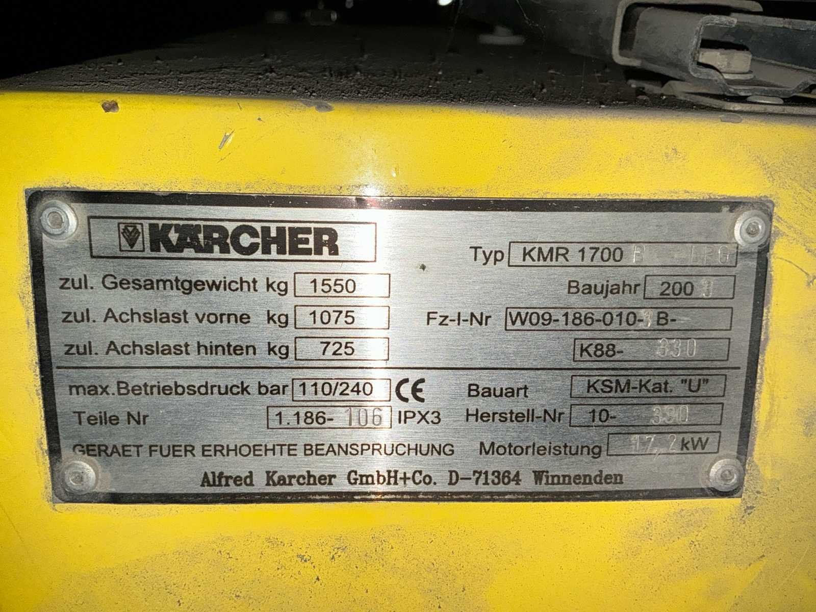 Voorzien van: Max. oppervlakteprestatie m²/u 14000, werkbreedte 1100mm, werkbreedte met 1 zijborstel 1400mm, reservoirinhoud 300L, KUBOTA driecilinder, watergekoelde industriële gas motor met elektrische starter (14 kW), traploze hydraulische rijaandrijving vooruit en achteruit, zwevende bevestigingen, vaste instelling voor het vegen van gladde oppervlakken, zwevende bevestiging met extra neerwaartse druk voor het vegen van kuilen en holtes, aangedreven door een hydraulische motor met automatische uitschakeling bij het omhoog brengen van de borstel, snelwisselsysteem voor hoofdborstel, zijborstel (Ø 550 mm) zwenkt automatisch, bedrijfsurenteller, luchtbanden, bumperbeugel. bescherming tegen stoten en beschadigingen. Aangedreven door een hydraulische motor. No Merk: Kärcher Type: KMR 1700-B LPG Bouwjaar: 2003 Serienummer: W09-186-010-B Afgelezen urenstand: 393hr Eigen gewicht: 1200kg Totale afmeting L: 2400mm Totale afmeting Breedte: 1400mm Totale afmeting Hoogte: 1500mm
