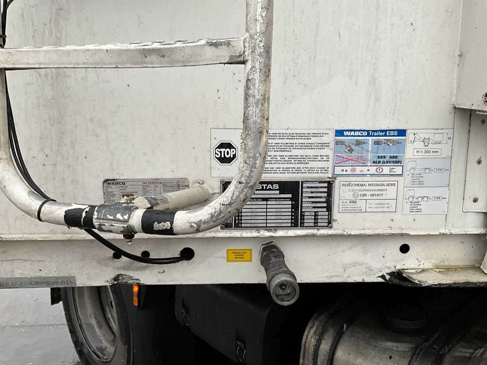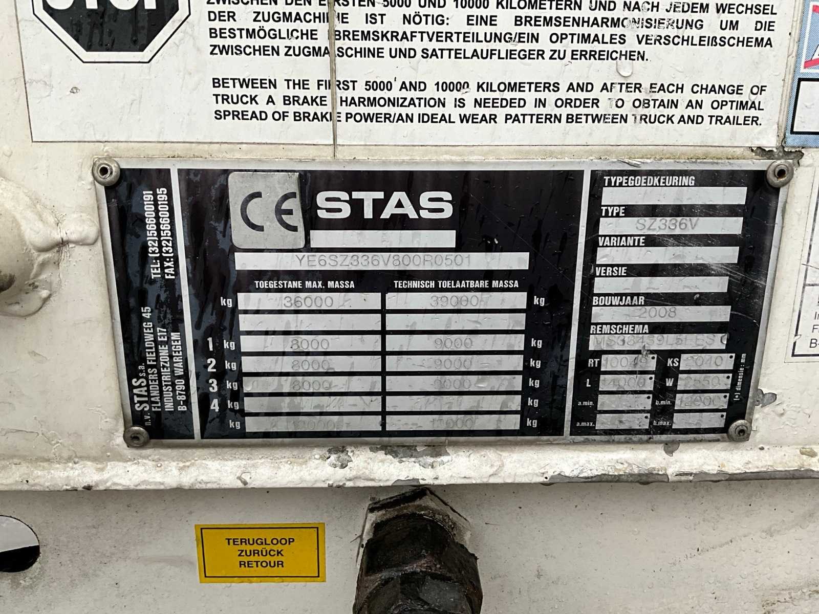 Voorzien van Walkingfloor; binnenafmeting: Ca. 13600x2450x2770 mm (LxBxH); voorste as liftas; vaste assen; luchtgeveerd; Let op, spoel defect van terugdraaien! Nee Kenteken: ON-11-VD Merk: Stas Type: SZ336V Bouwjaar: 2008 Chassisnummer VIN: YE6SZ336V800R0501 Cilinderinhoud: 0cc APK vervaldatum: 2026-11-18 Datum eerste toelating: 2008-06-04 Datum eerste toelating (NL): 2015-06-29 Aantal assen: 3 Laadvermogen: 31160kg Gesloten opbouw: true Nationaliteit documenten: NL Kentekenpapieren compleet?: true Aantal zitplaatsen: 0