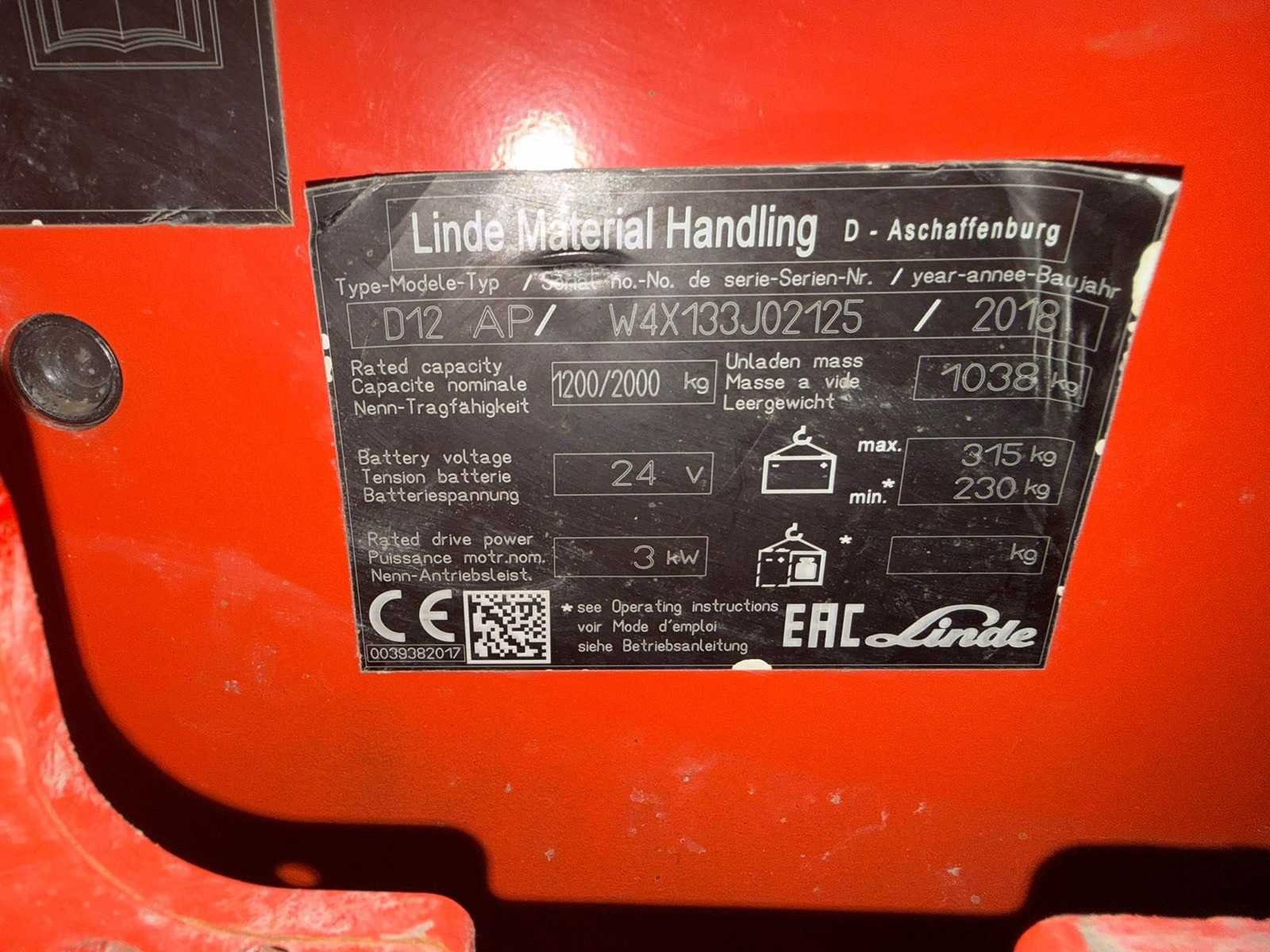 Voorzien van: D12 HP AP dubbele stapelaar, onderhoudsvrije 3kW wisselstroommotor, (soft landingsfunction), opklapbare heupbescherming, snelheidsaanpassing in bochten, drie remsystmen, volledig ontkoppeld en geveerd bestuurdersplatform, elektrische stuurbekrachtiging, Linde OptiLift, dediening te voet en tijdens het rijden mogelijk, Rijsnelheid met/zonder last (km/u) 11 / 14, batterij (V/Ah) 24 / 375. No Merk: Linde Type: D12 AP Bouwjaar: 2018 Serienummer: W4X133Jo2125 Hefvermogen: 2000kg Hefhoogte: 2424mm Afgelezen urenstand: 4181 Eigen gewicht: 1038kg Minimale doorrijhoogte: 1700mm Totale afmeting L: 2470mm Totale afmeting Breedte: 800mm Meerij stapelaar: true