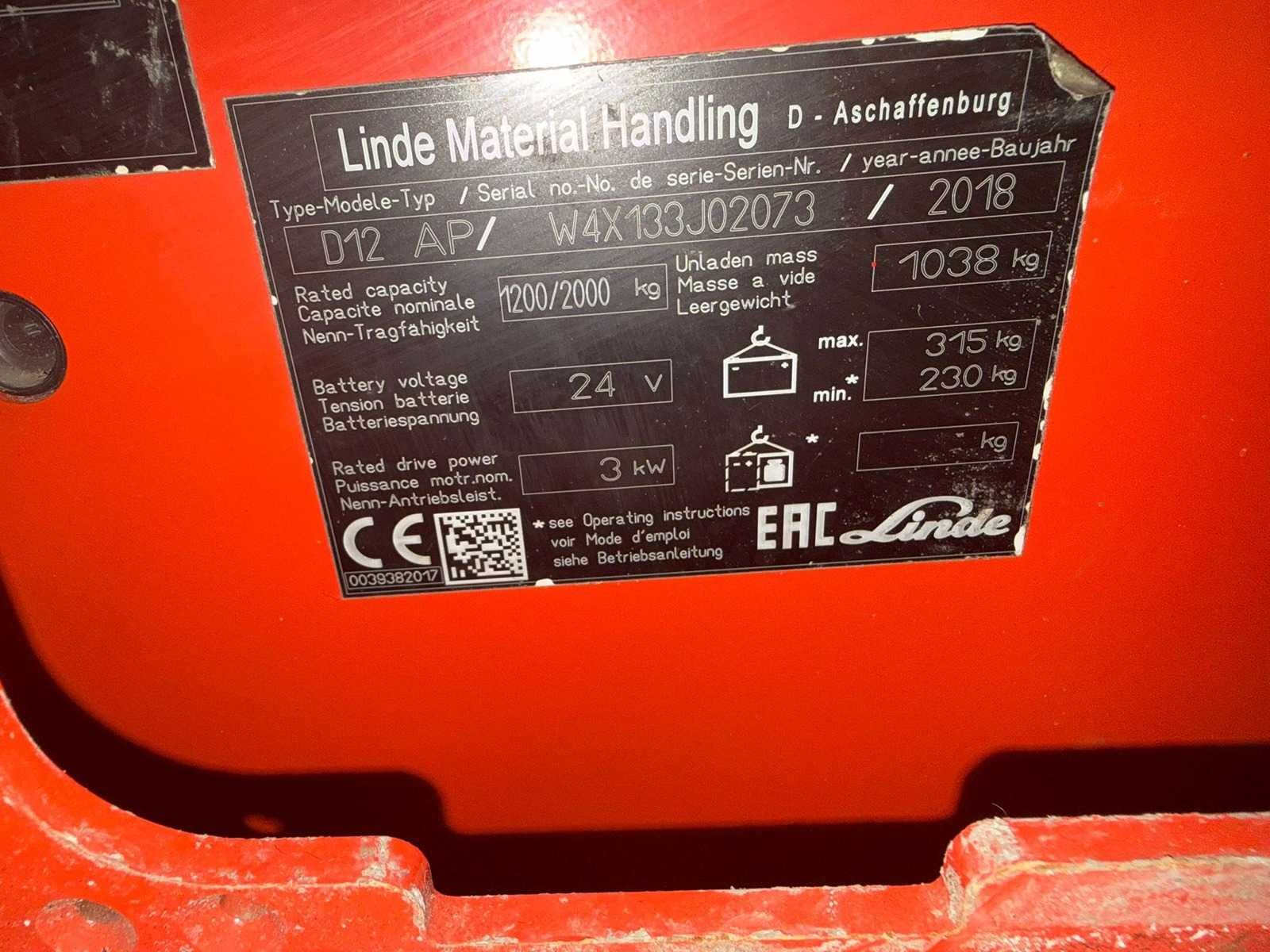 Voorzien van: D12 HP AP dubbele stapelaar, onderhoudsvrije 3kW wisselstroommotor, (soft landingsfunction), opklapbare heupbescherming, snelheidsaanpassing in bochten, drie remsystmen, volledig ontkoppeld en geveerd bestuurdersplatform, elektrische stuurbekrachtiging, Linde OptiLift, dediening te voet en tijdens het rijden mogelijk, Rijsnelheid met/zonder last (km/u) 11 / 14, batterij (V/Ah) 24 / 375. No Merk: Linde Type: D12 AP Bouwjaar: 2018 Serienummer: W4X133JO2073 Hefvermogen: 2000kg Hefhoogte: 2424mm Afgelezen urenstand: 4553 Eigen gewicht: 1038kg Minimale doorrijhoogte: 1700mm Totale afmeting L: 2470mm Totale afmeting Breedte: 800mm Meerij stapelaar: true