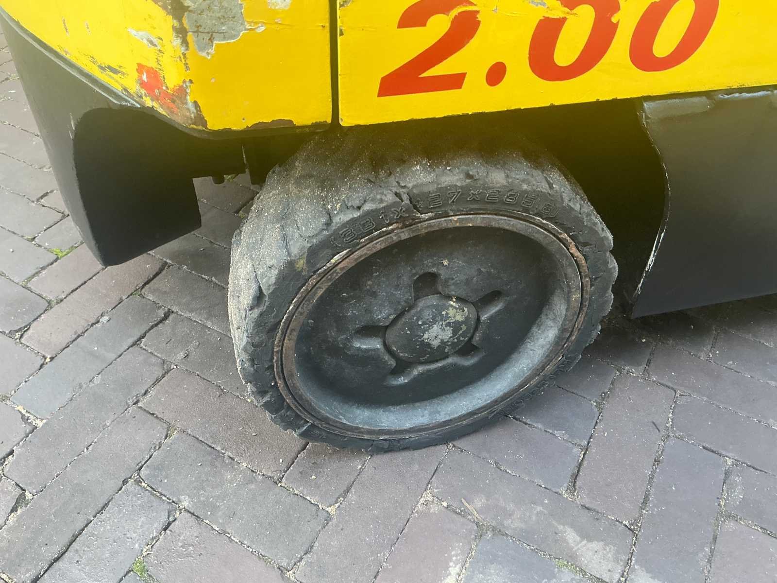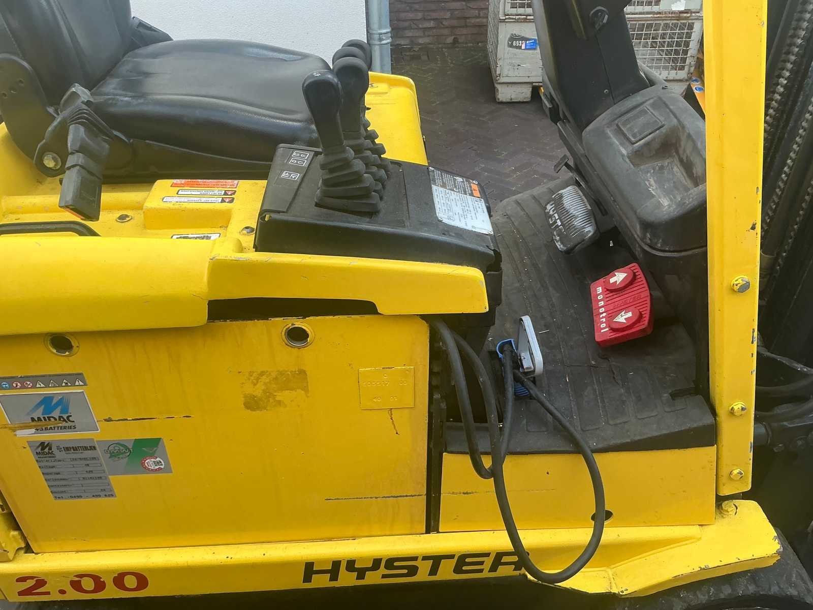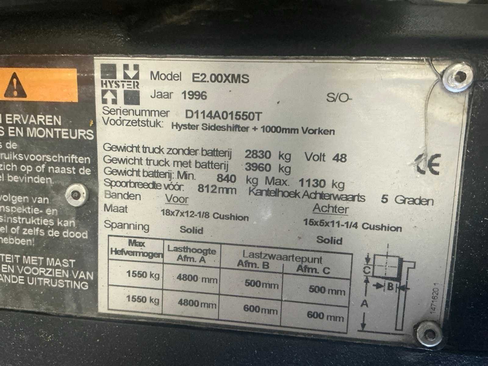 Met lader, kettingen en slangen reeds vervangen. Nee Merk: Hyster Type: E2.00XMS Bouwjaar: 1996 Serienummer: D114A01550T Brandstof: Elektrisch Mast: Triple Soort band: Volrubber banden Aantal wielen: 4 Afgelezen urenstand: 3049 Accu lader: true Side-shift: true Triple mast: true Eigen gewicht: 3960kg Hefvermogen: 2000kg Lepellengte: 1000mm Max. hefhoogte: 4800mm Vol rubber banden: true Totale afmeting L: 2100mm Totale afmeting Breedte: 1100mm Totale afmeting Hoogte: 2050mm