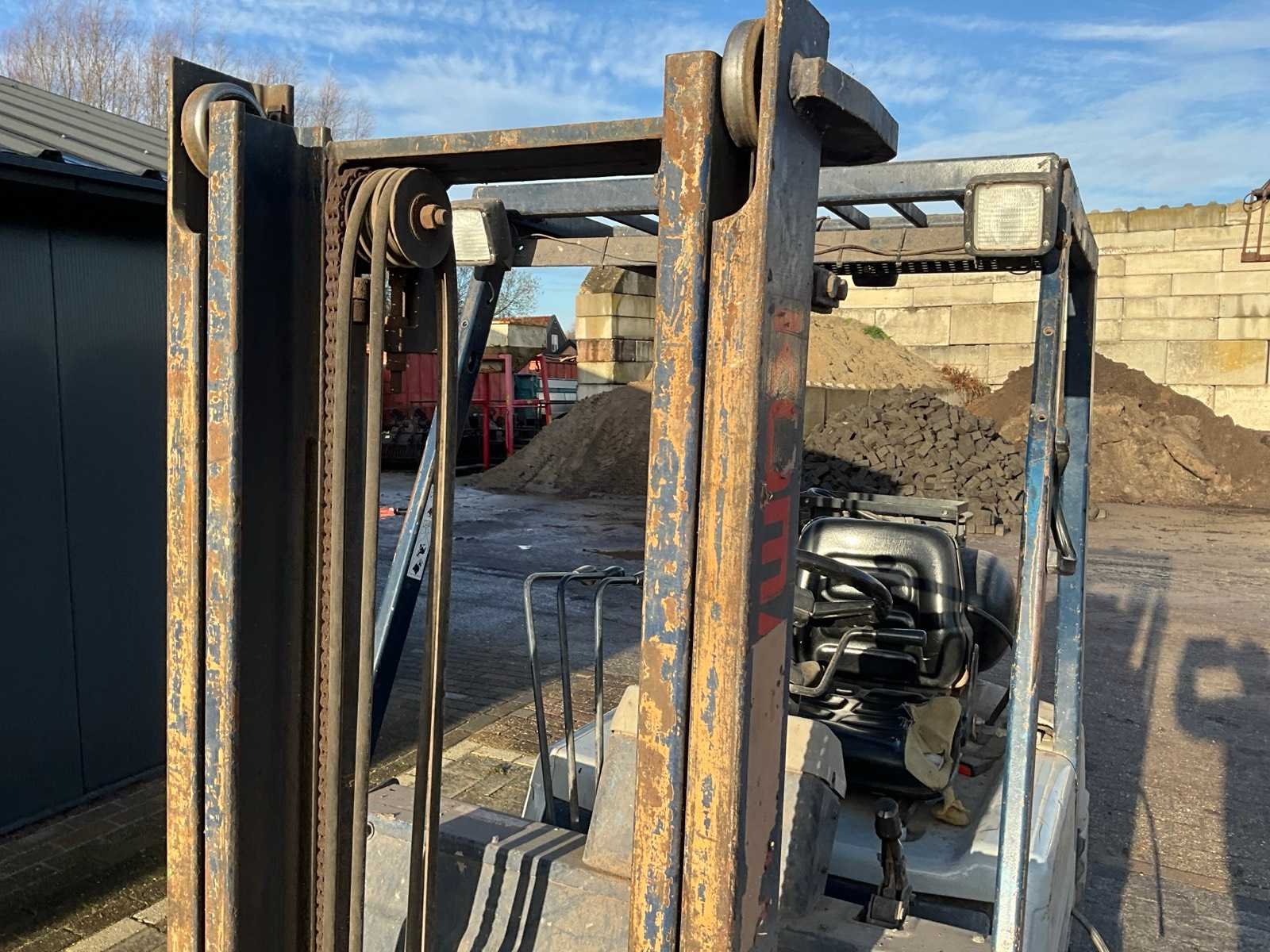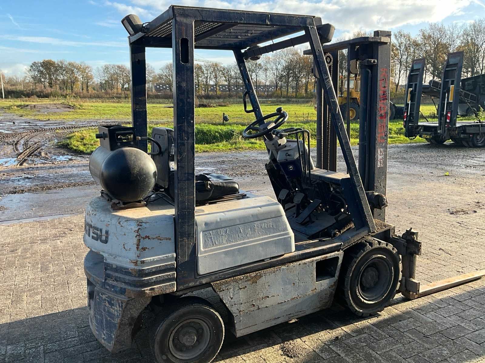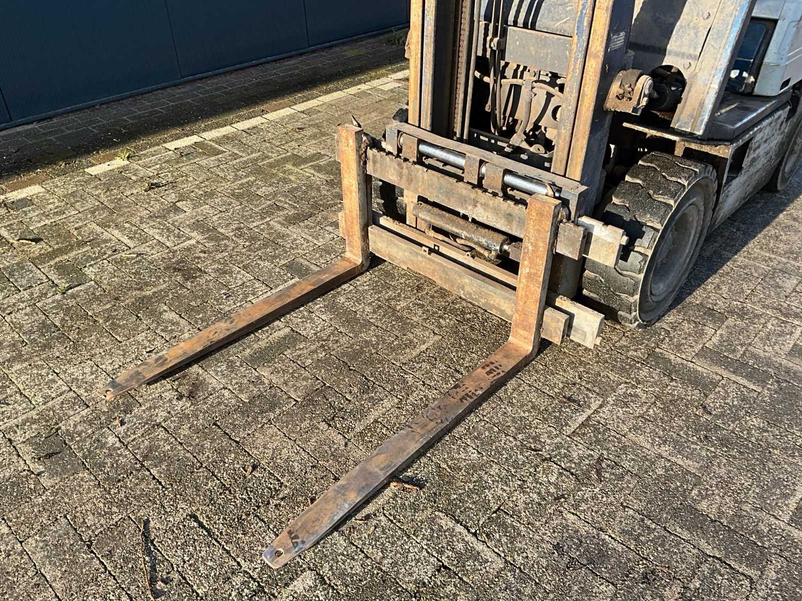 Nee Merk: Komatsu Type: FG15-15 Bouwjaar: 1990 Serienummer: 207867 Brandstof: LPG Mast: Duplex Soort band: Volrubber banden Aantal wielen: 4 Afgelezen urenstand: 9264 Side-shift: true Duplex mast: true Lepellengte: 1000mm Max. hefhoogte: 3050mm Minimale doorrijhoogte: 2000mm Totale afmeting Breedte: 1080mm LPG: true