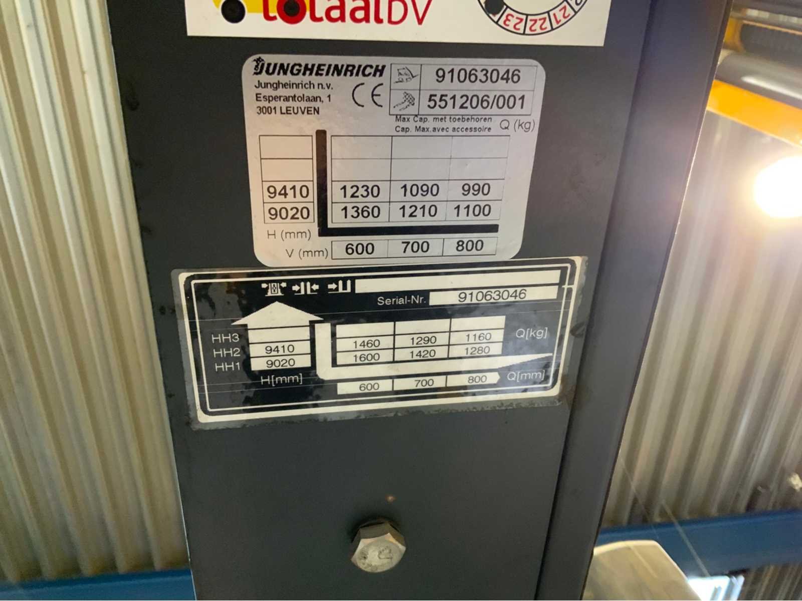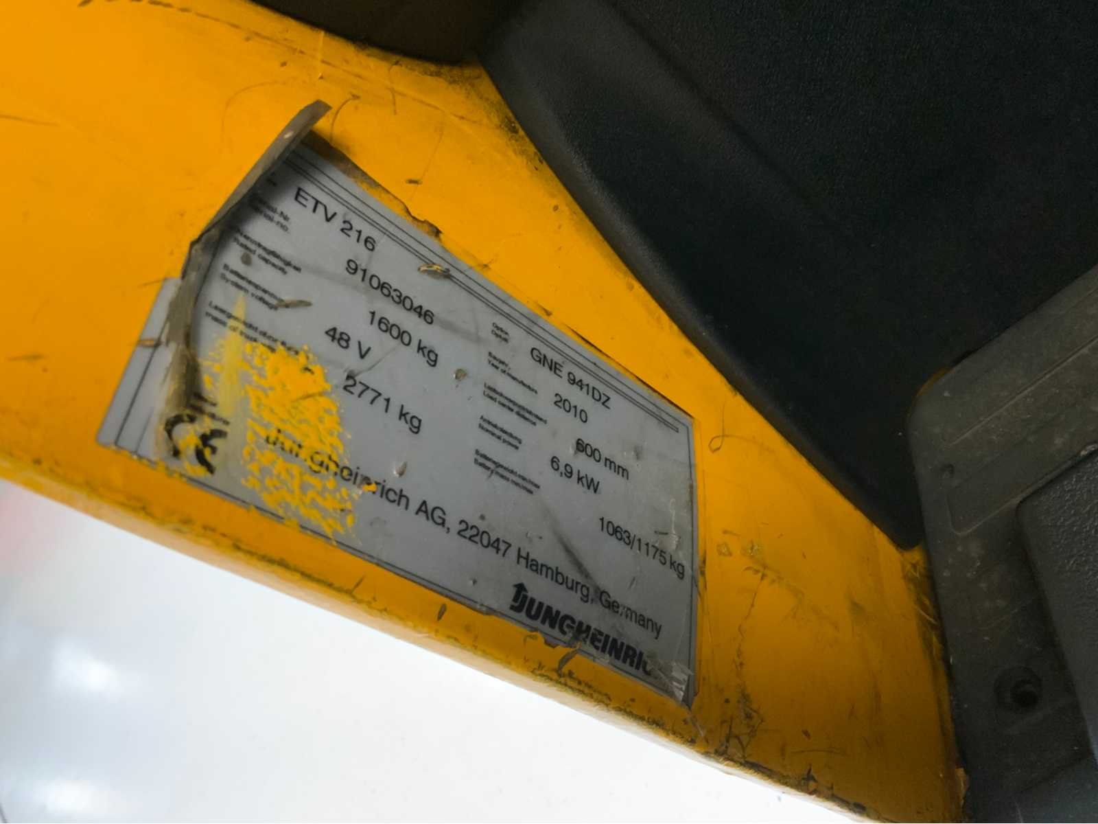 Nee Merk: Jungheinrich Type: ETV 216 Bouwjaar: 2010 Serienummer: 91063046 Brandstof: Elektrisch Mast: Triplex Aantal wielen: 3 Afgelezen urenstand: 10853 Free-lift: true Side-shift: true Hydraulisch verstelbare lepels: true Triple mast: true Eigen gewicht: 3946kg Hefvermogen: 1600kg Lepellengte: 1200mm Hefhoogte: 9410mm Totale afmeting L: 2700mm Totale afmeting Breedte: 1260mm Totale afmeting Hoogte: 3700mm Elektrisch: true
