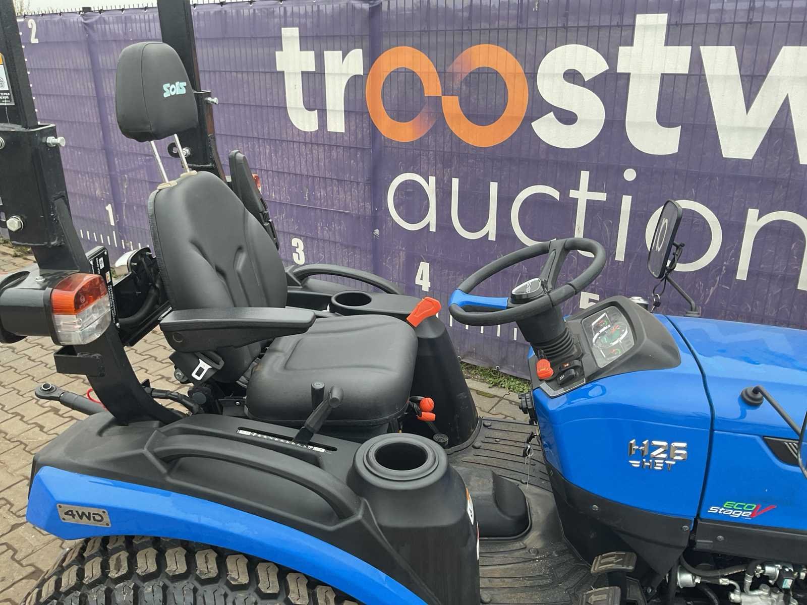 V.v. Mitsubishi S3L2-3E diesel motor; cruise control; PTO; Nederlandse kentekenregistratie; zwaailamp; Hoge/Lage gearing; 4X4/AWD; hydraulische koppeling (2x); hefinrichting; 7-polige stekker; valbeugel; gazon banden Nee Merk: Solis Type: H26 Kenteken: T-14-FKL Motorvermogen (kW): 19.39kW Afgelezen urenstand: 72 Versnellingsbaktype: Hydrostaat Aftakastoerental: 540rpm Bandenmaat voor: 25X8,5-14 Bandenmaat achter: 13,6-16 Aantal hydraulische ventielen achter: 2 Datum eerste toelating: 2023-04-19