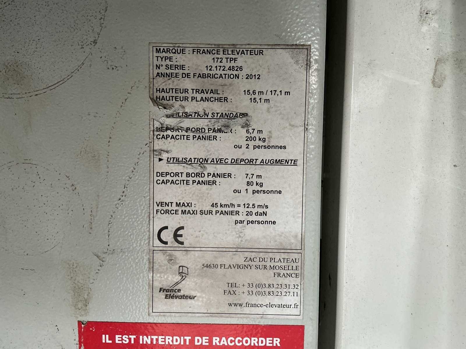 Voertuig: Elektrische ramen; Elektrisch verstelbare spiegels; Radio; 6-Versnellingen; Armsteun; Ladder houder; 2x kast inrichting; Dubbele Montering; Tachograaf; Achteruitrij camera Hoogwerker: France Elevateur 172 TPF; Autohoogwerker opbouw; 17M Werkhoogte; zijdelinks bereik: 9 Meter; Maximale manbak belasting: 265KG; Draaibereik: 400° Graden; 230-volt aansluiting; 2-persoons manbak; trekhaak; PDC Nee Kenteken: Geen Registratie Documenten Merk: Renault Type: T45 2.3 dCI L3H2 Model: Master Bouwjaar: 2012 Chassisnummer: VF6MHF8FG46928356 Afgelezen kilometerstand: 87304km Cilinderinhoud: 2299cc Vermogen (kW): 107kW Brandstof: Diesel Aandrijving: RWD Transmissie: Handgeschakeld Aantal zitplaatsen: 2 Kleur: Wit Aantal deuren: 5 Aantal cilinders: 4 Velgmaat: 16 inch Emissieklasse: 5