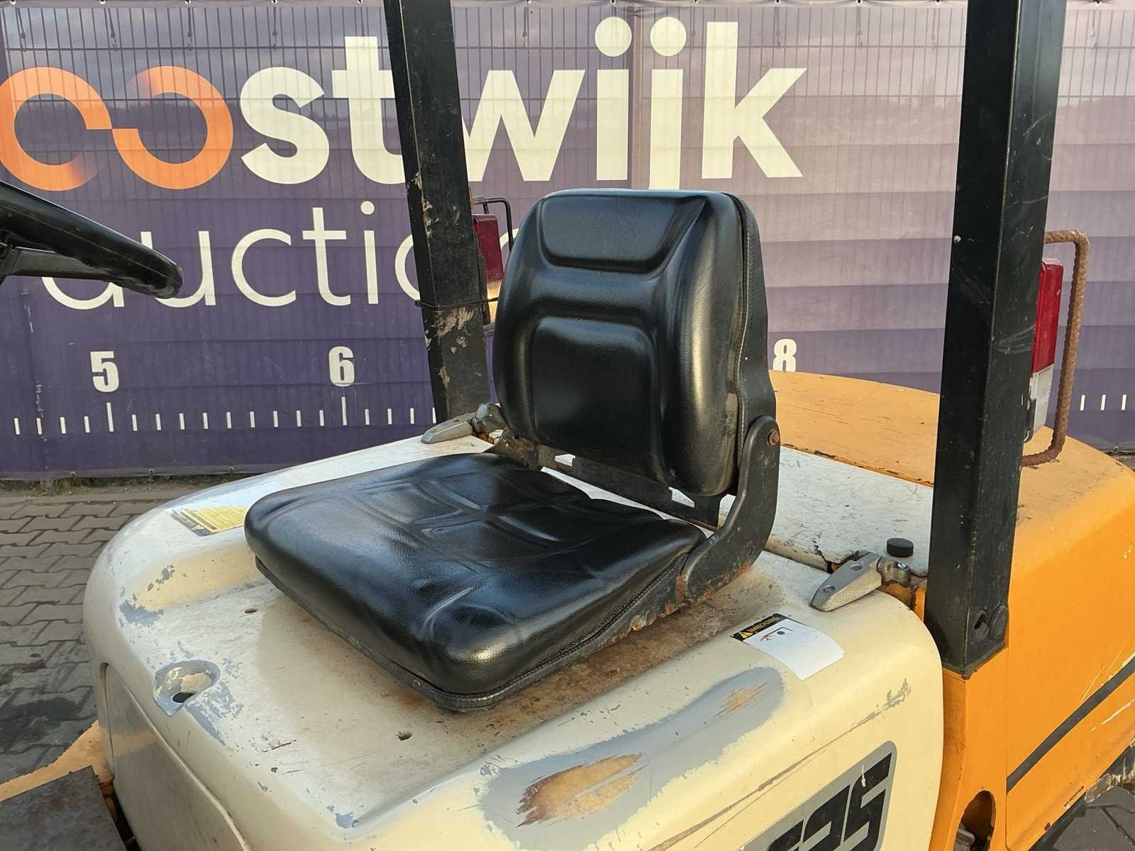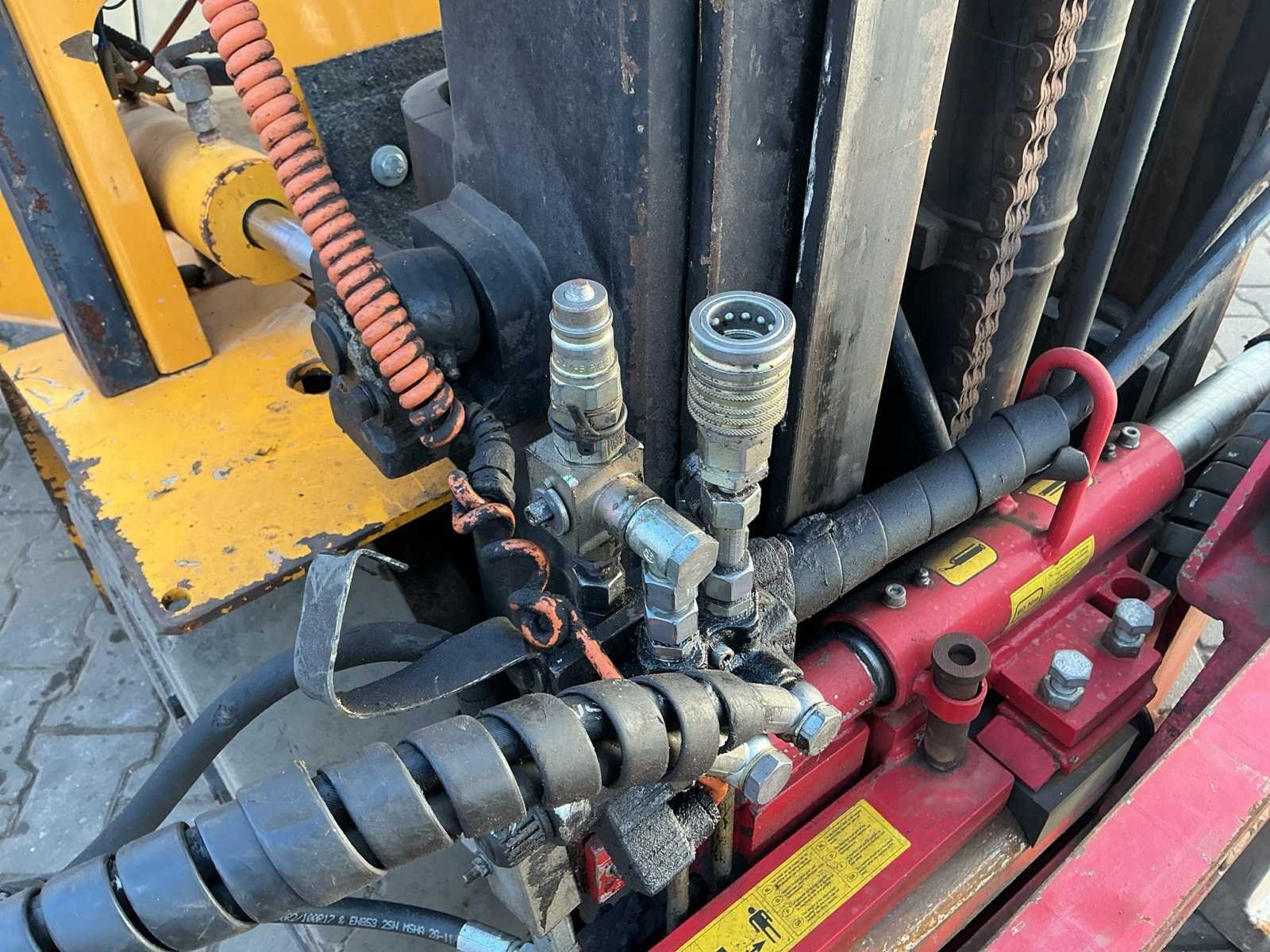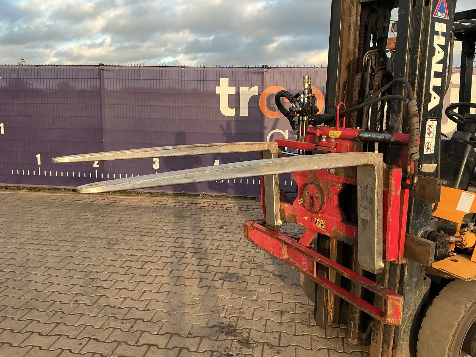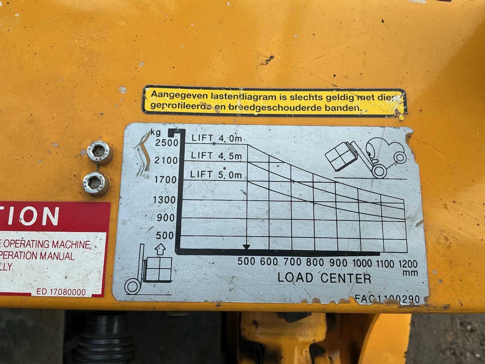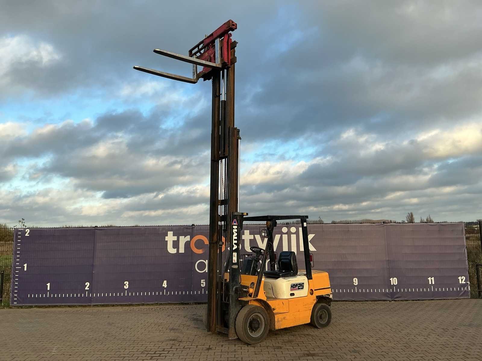 4.cilinder Kia Diesel motor; Wifo kisten kantelbaar; 2wd Nee Merk: Halla Type: HDF25 Brandstof: diesel Kenteken: T-45-BJV Soort band: Volrubber banden Aantal wielen: 4 Afgelezen urenstand: 4117 Free-lift: true Side-shift: true Roterend vorkenbord: true Triple mast: true Hefvermogen: 2500kg Lepellengte: 1200mm Max. hefhoogte: 4850mm Vol rubber banden: true Minimale doorrijhoogte: 2050mm