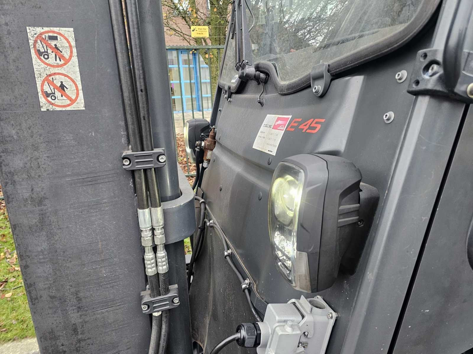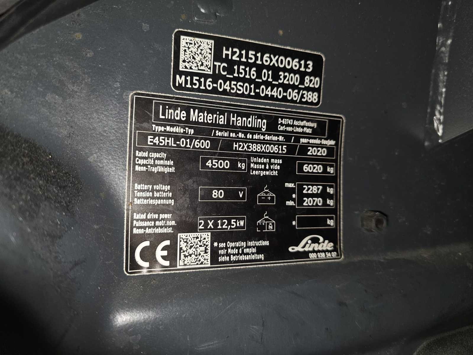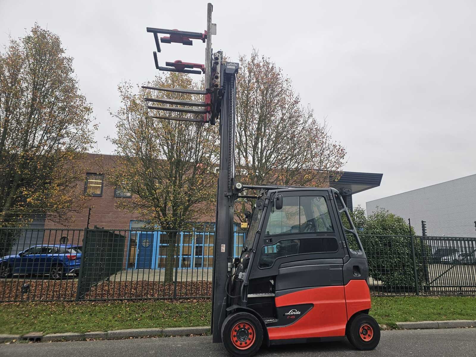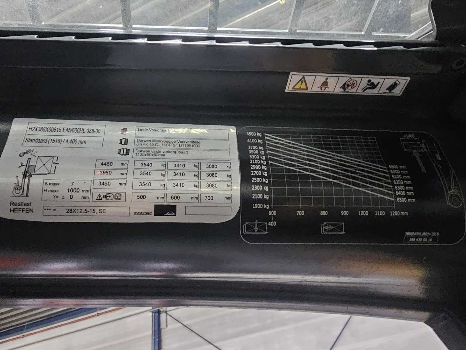 Extra opties : Multi-vorkbersteller met klem , volledig dichte cabine , Blue spot , Rondom Led verlichting , verwarming , joystick , verlichting , lucht geveerde stoel , Kijkdag op afspraak Nee Merk: Linde Type: E45HL-01/600 Bouwjaar: 2020 Serienummer: H2X388X00615 Soort band: Volrubber banden Aantal wielen: 4 Side-shift: true Hydraulisch verstelbare lepels: true Eigen gewicht: 8300kg Hefvermogen: 4500kg Lepellengte: 2300mm Hefhoogte: 4400mm Vol rubber banden: true Minimale doorrijhoogte: 3000mm Totale afmeting L: 4400mm Totale afmeting Breedte: 1650mm Totale afmeting Hoogte: 3000mm