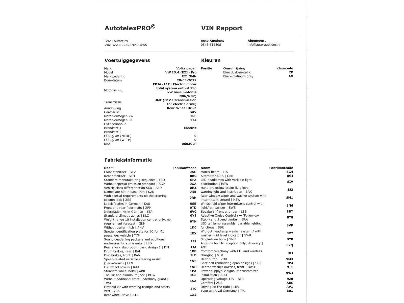 Duitse kenteken papieren. Indien gewenst kunnen wij het gehele import proces voor u verzorgen, RDW invoer, BPM taxatie, Douane afwikkeling, stalling etc. Voor deze auto zijn de totale invoerkosten inclusief de BPM €1.195.- Dus voor €1.195.- boven op uw aankoopprijs verzorgen wij het NL kenteken voor u. (This option is only for Dutch buyers) Voor vragen kunt u mailen naar info@auto-auctions.nl No Kenteken: Duitse kenteken papieren Merk: Volkswagen Model: ID.4 Type: Pro 77 kWh Afgelezen kilometerstand: 94630km Vermogen (kW): 150kW Brandstof: Elektrisch Chassisnummer: WVGZZZE2ZNP034855 Datum eerste toelating: 02-05-2022 Vermogen (pk): 204hp Kleur: Blue Dusk Metallic Transmissie: Automaat Aantal sleutels: 2 Carrosserie: SUV Nationaliteit documenten: Duitse kenteken papieren Onderhoudshistorie: Digitaal volledig aanwezig Start en rijdt: Ja oplaadkabel : Aanwezig