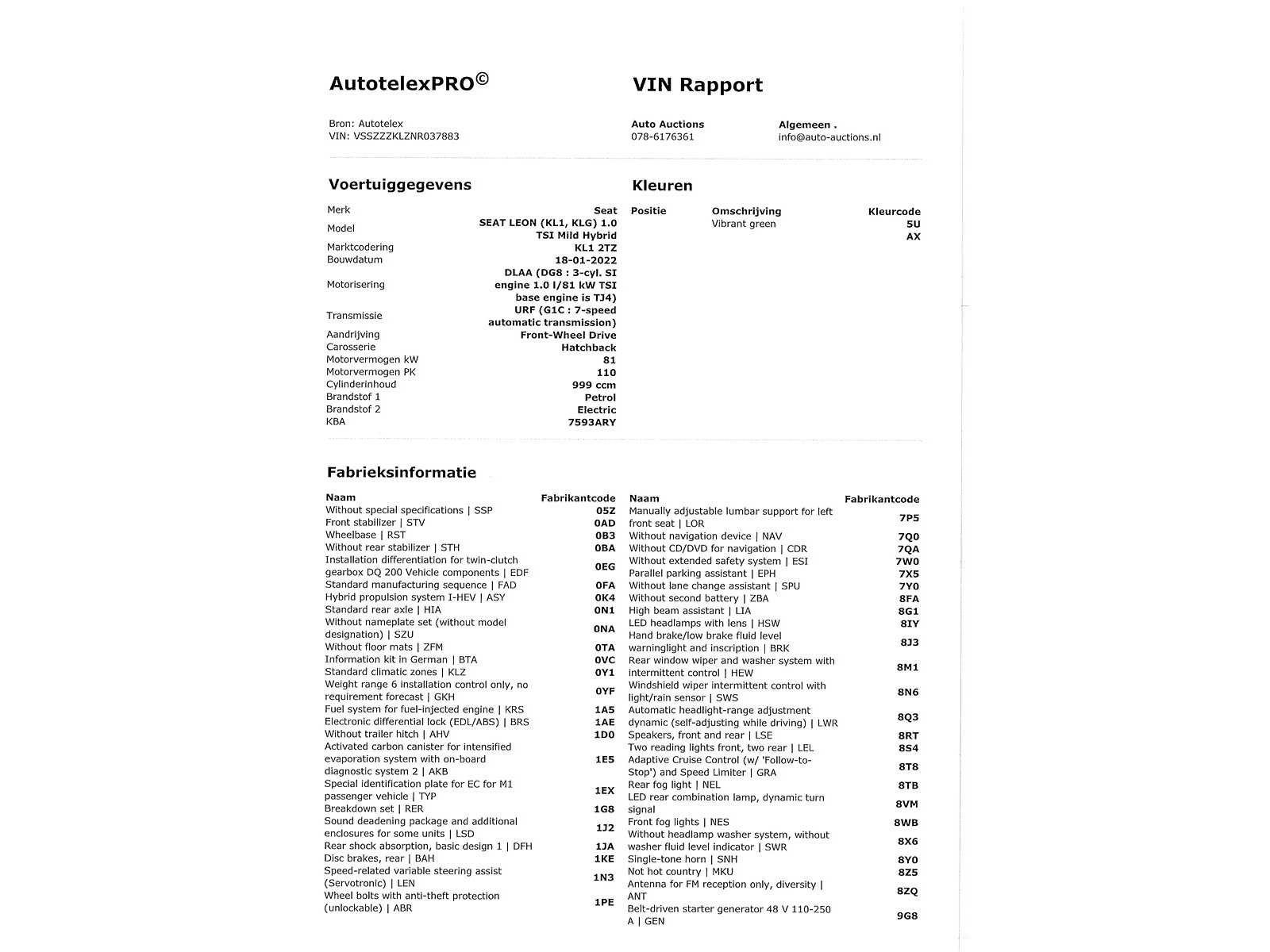 Duitse kenteken papieren. Indien gewenst kunnen wij het gehele import proces voor u verzorgen, RDW invoer, BPM taxatie, Douane afwikkeling, stalling etc. Voor deze auto zijn de totale invoerkosten inclusief de BPM €1.795.- Dus voor €1.795.- boven op uw aankoopprijs verzorgen wij het NL kenteken voor u. (This option is only for Dutch buyers) Voor vragen kunt u mailen naar info@auto-auctions.nl No Kenteken: Duitse kenteken papieren Merk: Seat Model: Leon Type: 1.0 eTSI MHEV Afgelezen kilometerstand: 41880km Cilinderinhoud: 999cc Vermogen (kW): 81kW Brandstof: Benzine Chassisnummer: VSSZZZKLZNR037883 Datum eerste toelating: 24-02-2022 Vermogen (pk): 110hp Kleur: Asphalt Blue Transmissie: Automaat Aantal deuren: 5 Aantal sleutels: 2 Carrosserie: Hatchback Nationaliteit documenten: Duitse kenteken papieren Onderhoudshistorie: Digitaal volledig aanwezig Start en rijdt: Ja