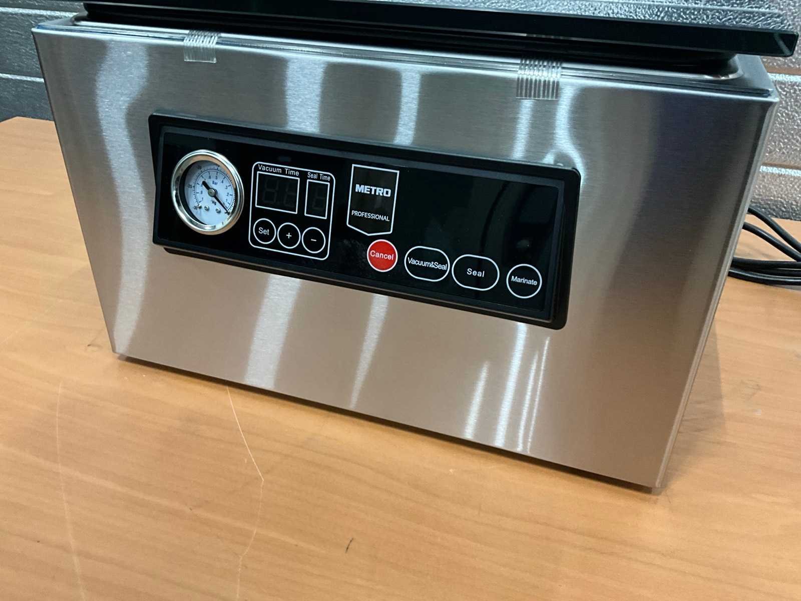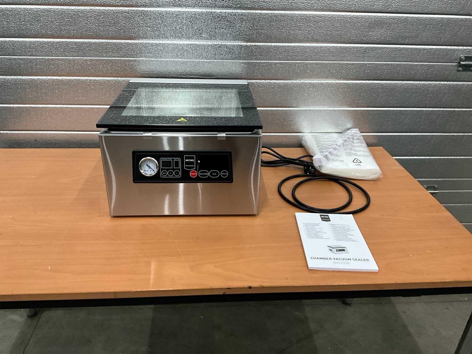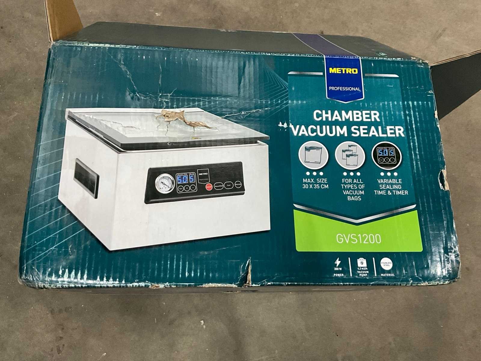 Ongebruikt; 350 watt.; inclusief vacuümzakken. Nee Merk: Metro Type: GVS 1200 Aantal kamers: 1 Aansluiting: 230V Totale afmeting L: 370mm Totale afmeting Breedte: 430mm Totale afmeting Hoogte: 250mm