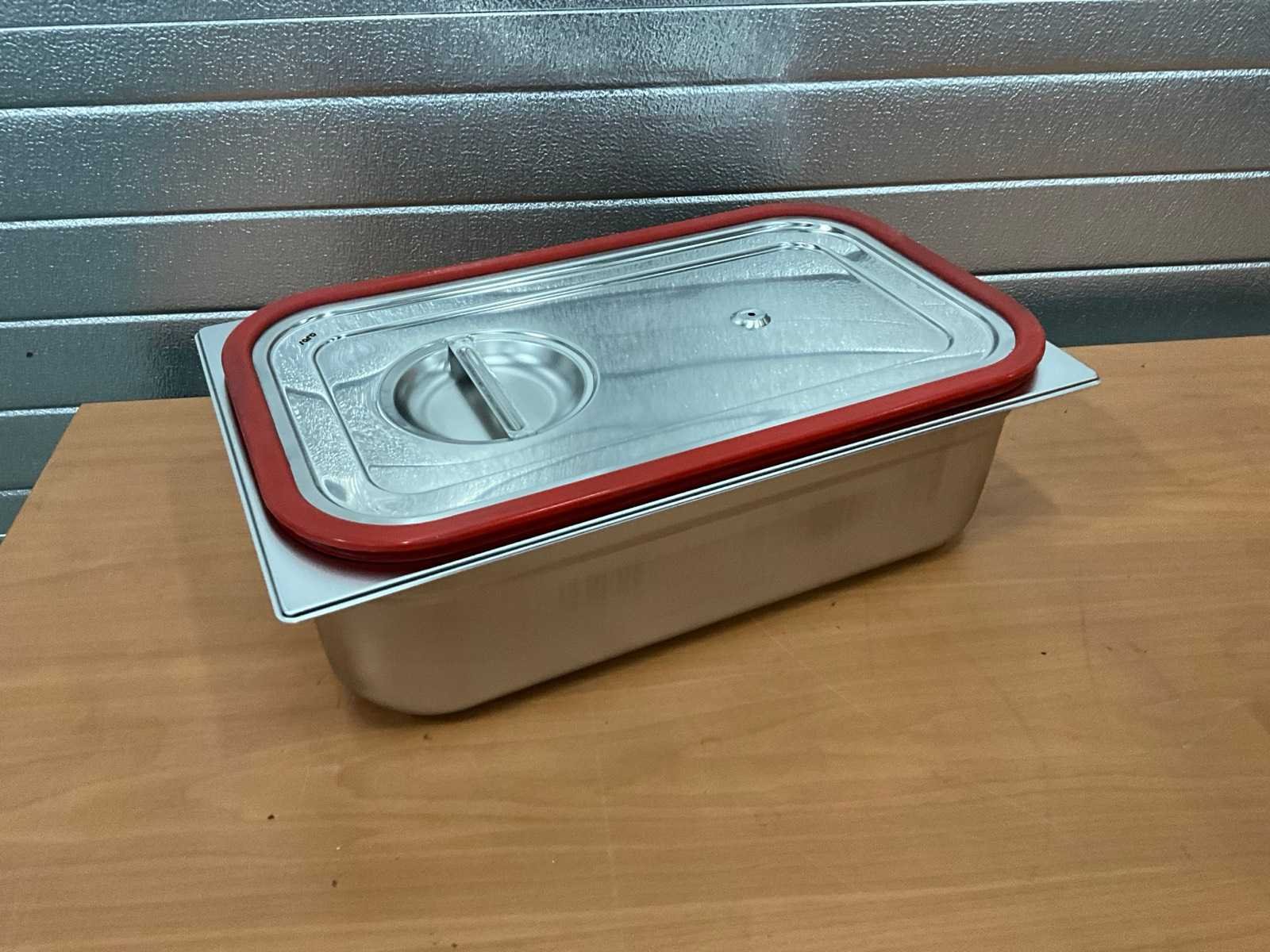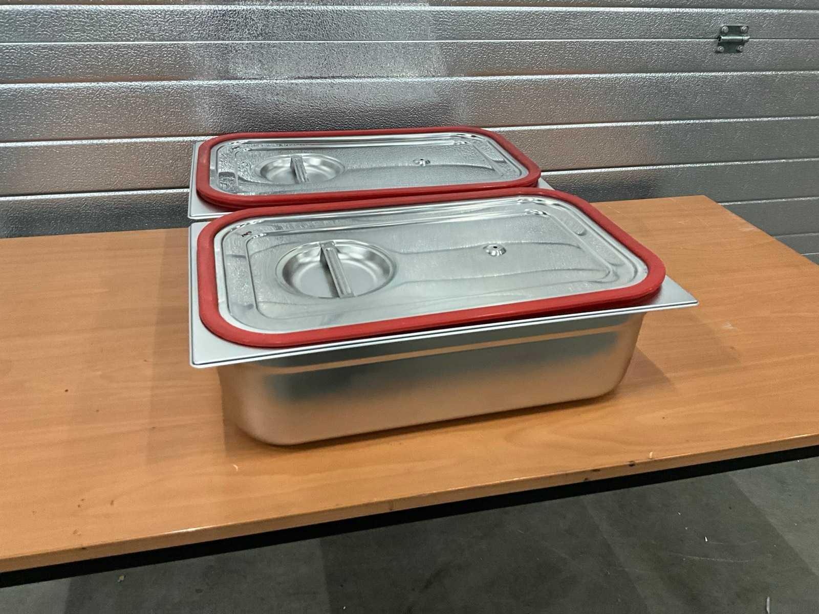 Ongebruikt; 150 mm. diep; inclusief 2 deksels met siliconen afdichting. No Merk: Saro Hoogte: 15cm Materiaal: rvs