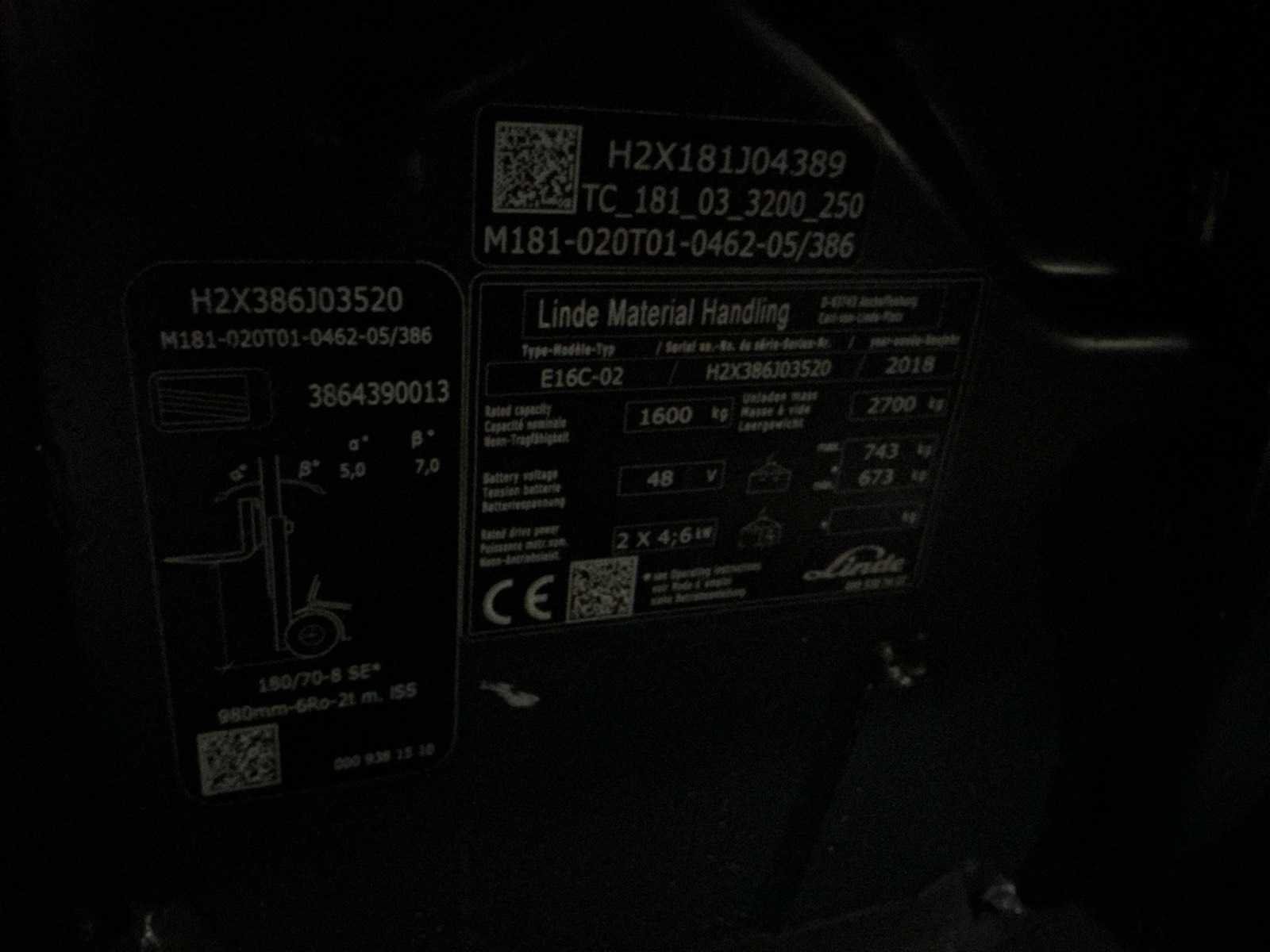 Geveerde stoel , side shift , accu 2023 , verlichting voor openbare weg Nee Merk: Linde Type: E16C02 Bouwjaar: 2018 Serienummer: H2X386J03520 Brandstof: Elektrisch Mast: Triple Soort band: Volrubber banden Aantal wielen: 4 Afgelezen urenstand: 3870 Side-shift: true Triple mast: true Eigen gewicht: 3500kg Hefvermogen: 1600kg Lepellengte: 1000mm Min. hefhoogte: 0mm Max. hefhoogte: 4620mm Hefhoogte: 4620mm Vol rubber banden: true Totale afmeting L: 1900mm Totale afmeting Breedte: 1100mm Totale afmeting Hoogte: 2080mm