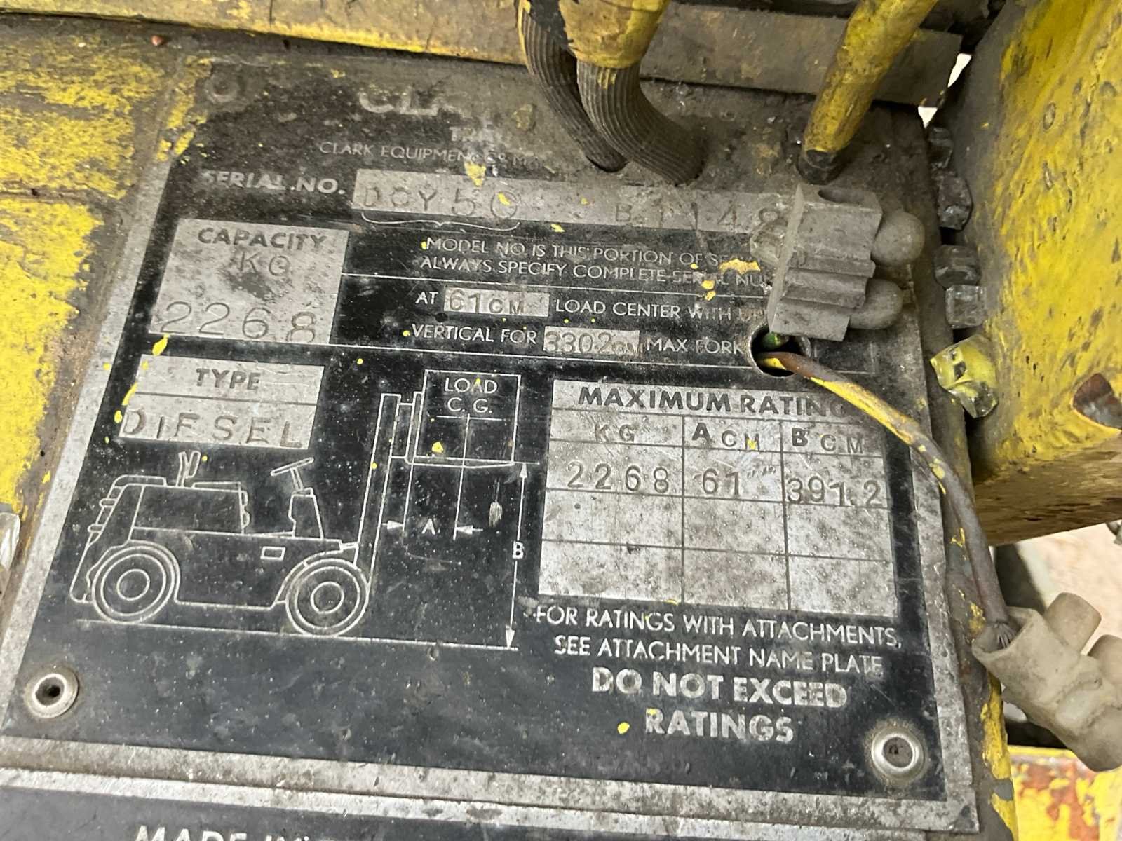 Technische Specificaties • Fabrikant: Clark Equipment • Type aandrijving: Diesel • Capaciteit: 2268 kg • Lastzwaartepunt: 610 mm (Load Center) • Maximale verticale hefhoogte: 3002 mm • Serienummer: DRY508-9184 (mogelijk modelcode beginnend met DRY508) • Maximum Ratings: • A (Afstand lastzwaartepunt): 61 cm • B (Hefhoogte): 3912 mm Let op: bij gebruik van attachments (bv. sideshift of vorkversteller) moet je steeds de aparte capaciteitsplaat raadplegen zoals vermeld: “For ratings with attachments, see attachment name plate. DO NOT EXCEED RATINGS.” ⸻ Bijzonderheden en Context Clark is een gerenommeerd Amerikaans merk dat al sinds de jaren 1910 vorkheftrucks bouwt. Het bedrijf had ook productie in Europa, waaronder België, zoals hier vermeld (”Made in Belgium”). Dit model lijkt afkomstig uit een oudere serie die vaak gebruikt werd in zware industriële omgevingen zoals magazijnen, bouwwerven of transportbedrijven. Een heftruck met een hefvermogen van 2268 kg (oftewel 5000 lbs) is typisch geschikt voor middelzwaar werk. Het dieselmodel is robuust, krachtig en ontworpen voor gebruik buitenshuis of in goed geventileerde loodsen. ⸻ Mogelijke toepassingen • Laden en lossen van paletten • Transport van materialen op bouwplaatsen • Stapelen van zware goederen in opslagruimtes • Industriële toepassingen waar elektrisch niet haalbaar is Nee Merk: Clark Brandstof: Diesel