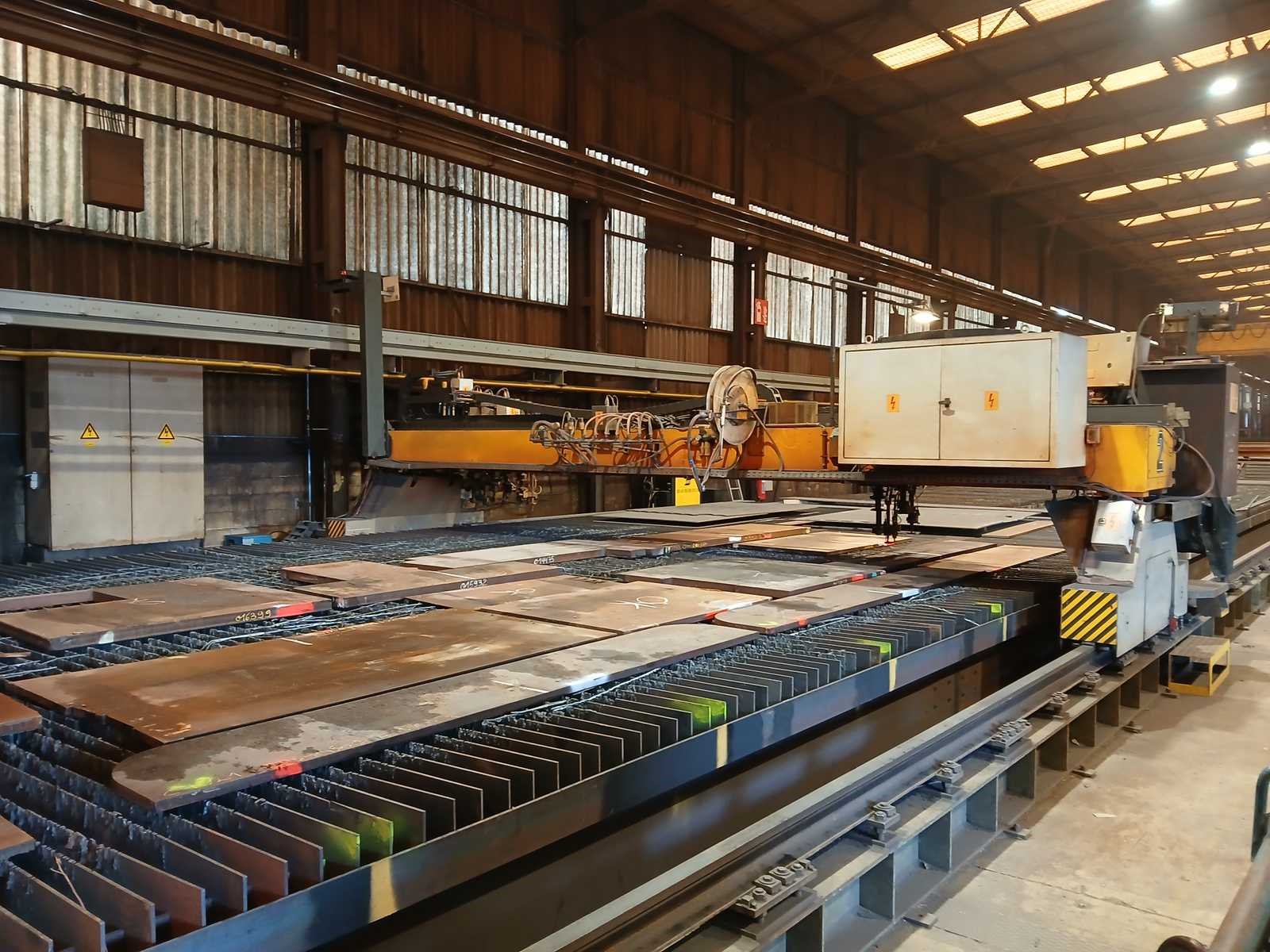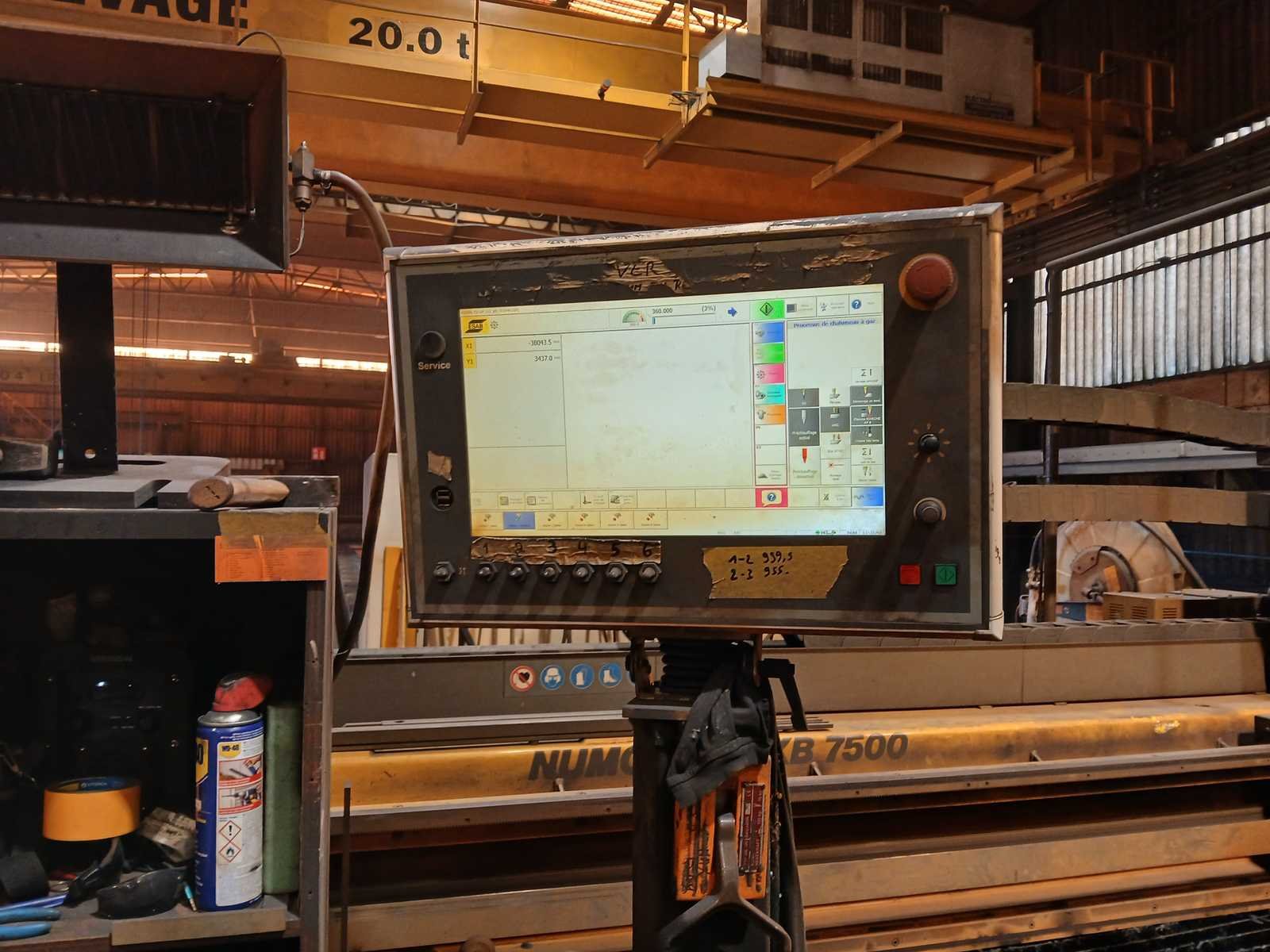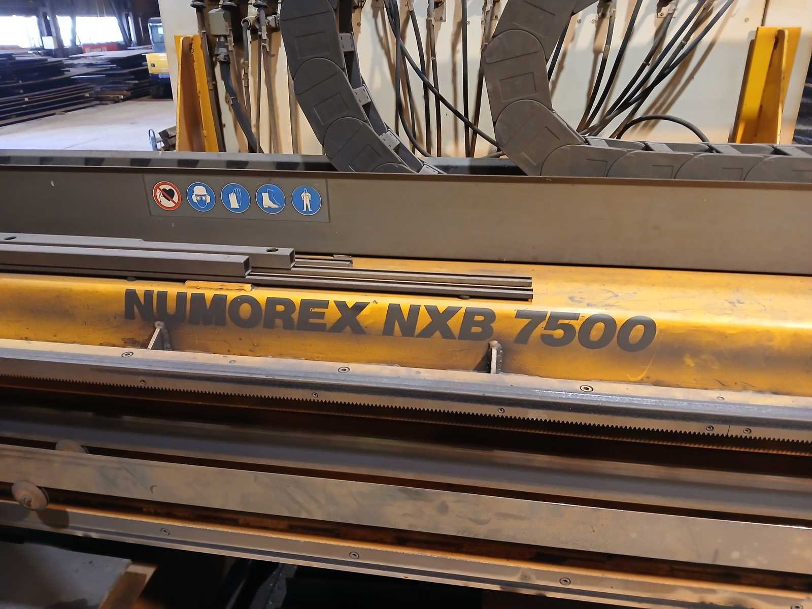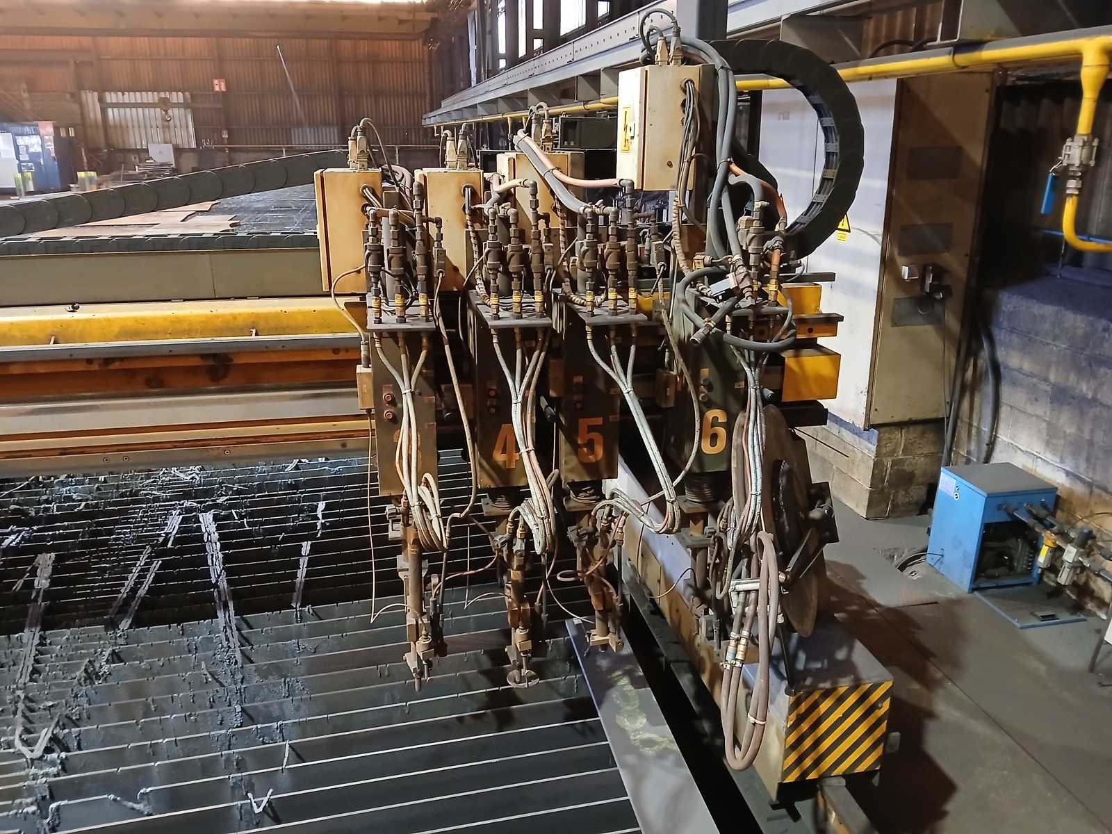 ESAB Numorex NXB 7500 vlamsnijmachine Merk: ESAB Model: Numorex NXB 7500 Jaar: 1999 Voeding: 3 × 400 V Beschrijving ESAB Numorex NXB 7500 industriële zuurstofsnijmachine met hoge capaciteit, uitgerust met 6 snijkoppen. Robuuste machine, geschikt voor het snijden van grote diktes en tot nu toe in productie gebruikt. Nog steeds in gebruik tijdens de inspectie. De machine zal in week 49 worden gedemonteerd, nadat deze is vervangen door een nieuwe installatie. Technische kenmerken Aantal koppen: 6 oxy-brandstofbranders Nuttige snijbreedte: 6.000 mm Maximale snijdikte: 250 mm Markering van onderdelen: geïntegreerde pneumatische chipper Tuitverstelling: handmatige kalmer (vast, volger en spiegel) Geleverde rails: ca. 30 meter Besturingssysteem: Numorex console (kleurendisplay, analoge en digitale bediening) Algemene staat Machine in werkende staat ten tijde van de foto's Regelmatig onderhoud, complete portaal, operationele branders Geleiders, rails en rekken in goede visuele staat Normale slijtage door continu industrieel gebruik ⚠️ Belangrijk De snijtafel (roosters / plaatmetalen steun) is niet inbegrepen bij de verkoop. Laden op locatie mogelijk Grootte Gantrylengte: ca. 6.000 mm (snijbreedte) Totale lengte met rails: ca. 30 m Non Merk: ESAB Type: Numorex NXB 7500 Bouwjaar: 1999