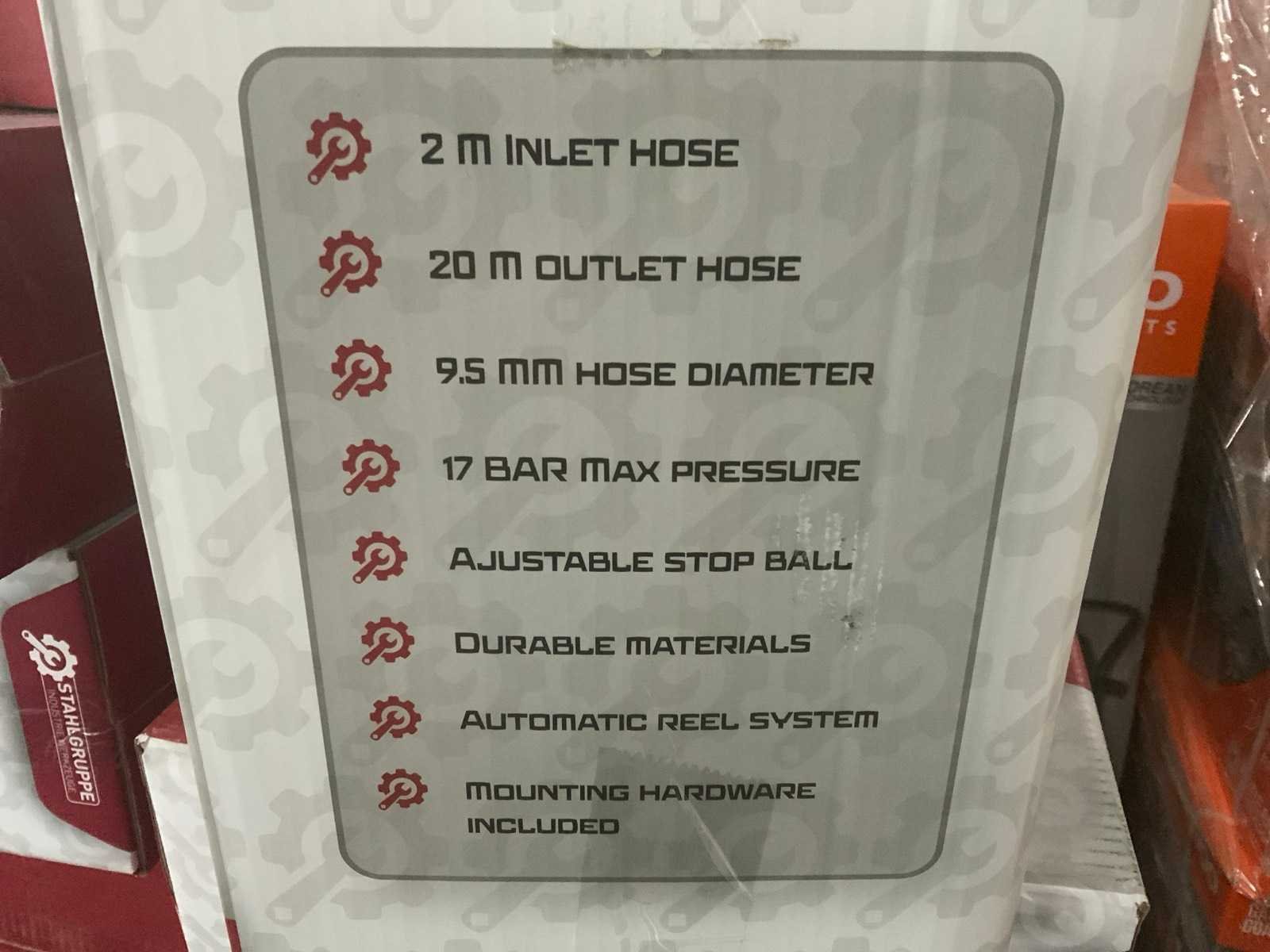 2 M Inlaatslang, 20 M uitlaatslang, 9,5 MM slangdiameter, 17 BAR Max druk Verstelbare stop bal. Duurzame materialen. Automatisch haspelsysteem. Montagemateriaal inbegrepen. Ongebruikt Nee Merk: Stahlgruppe Type: SGLT20M Bouwjaar: 2025 Lengte: 410cm Breedte: 210cm Hoogte: 380cm