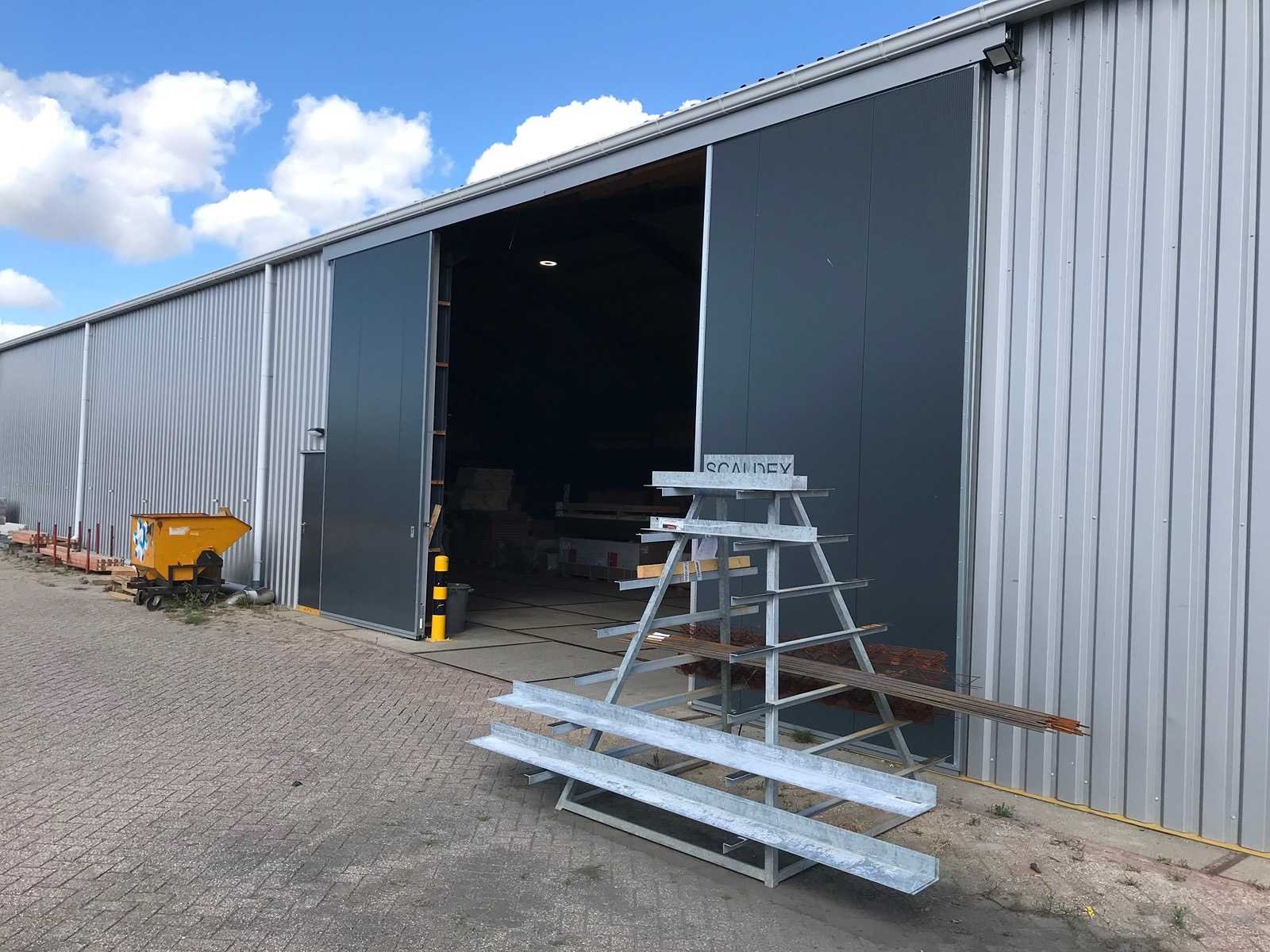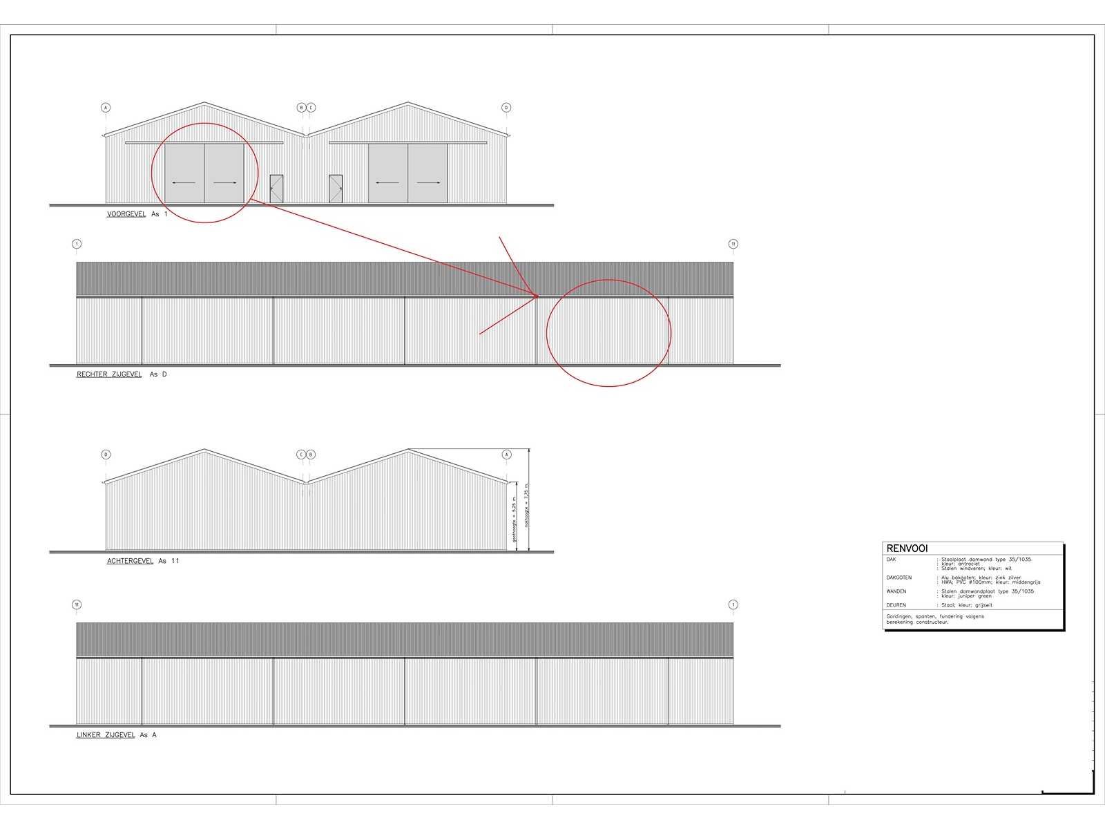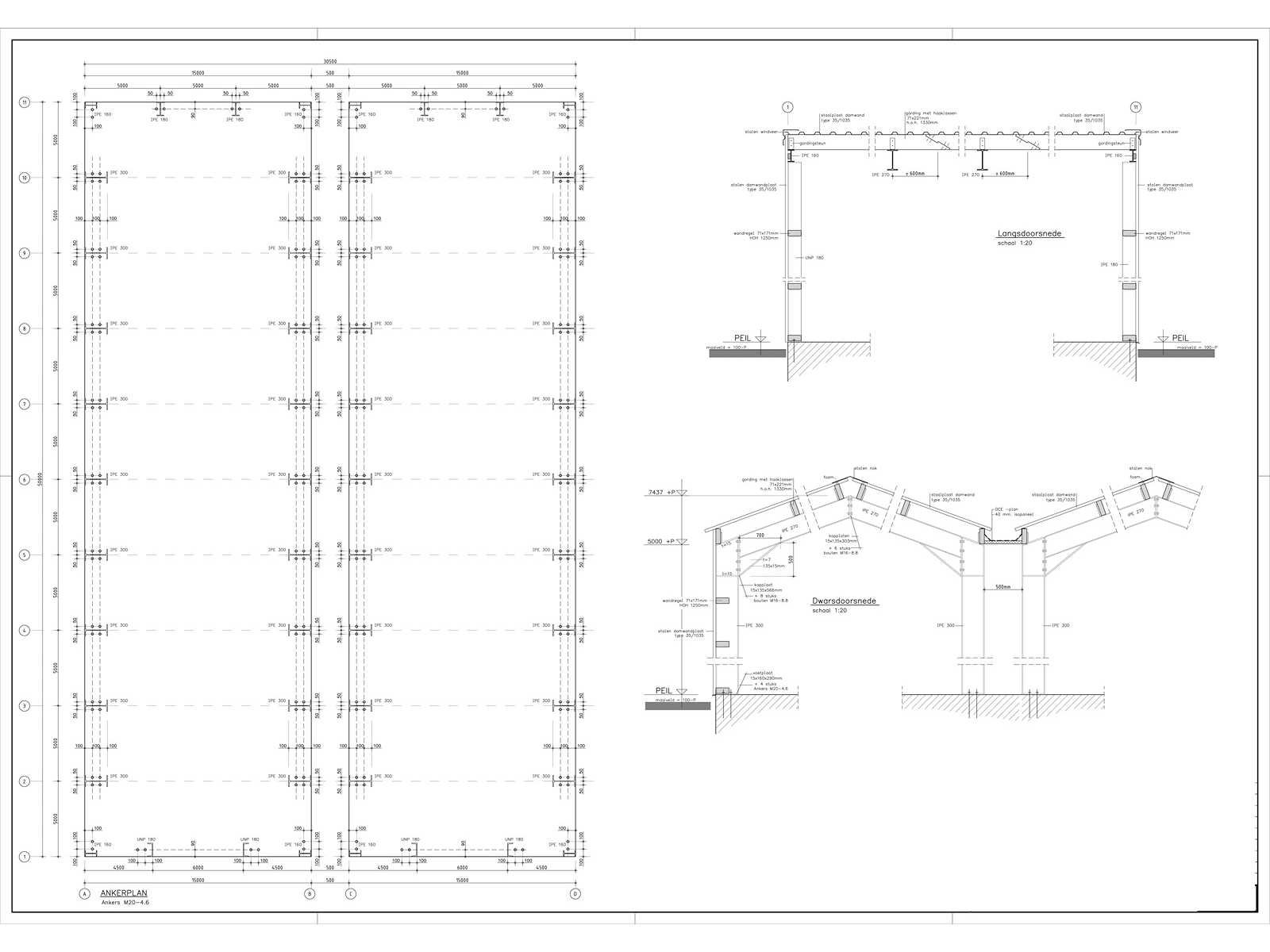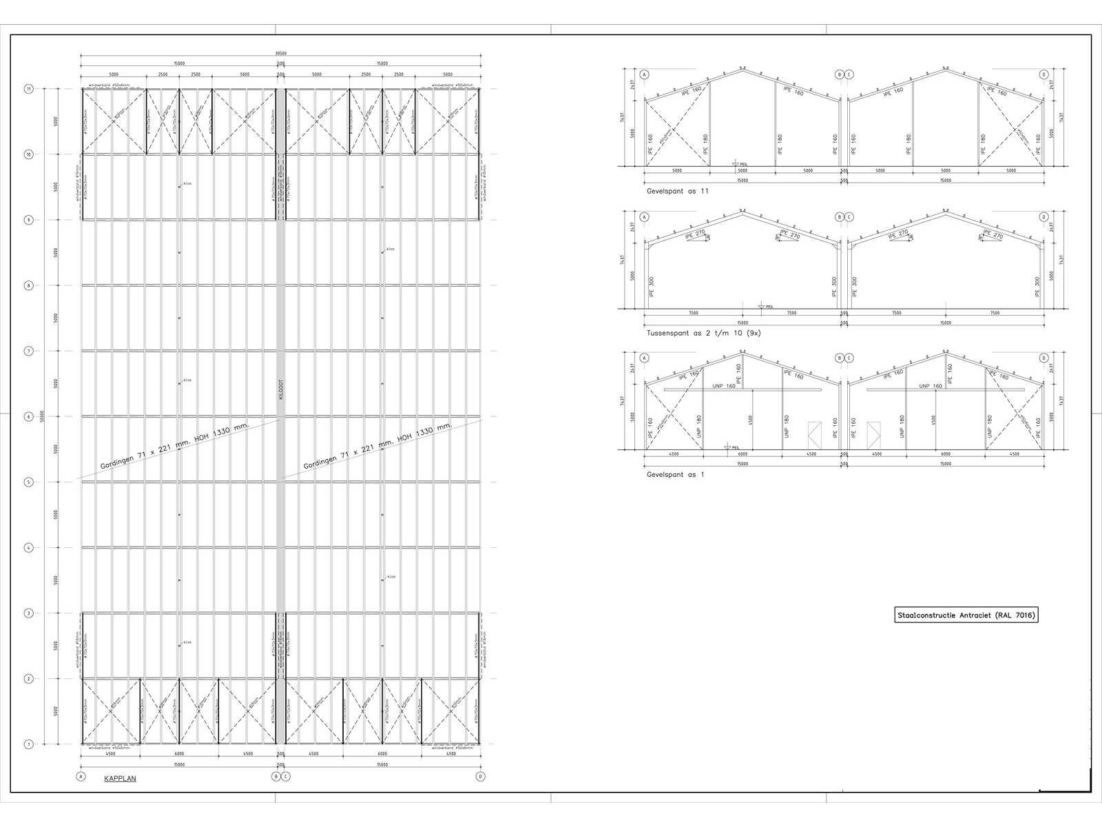 Dubbele complete staal constructie; totaal 30,5x50 meter; bouwjaar 2024; bestaand uit; 4 kopspanten IPE160; 18 tussenspanten IPE300/270; 16 windverbanden; 8 windbokken; dakgordingen 75x200mm; wandgordingen 75x175mm; damwandprofiel dakplaten; damwandprofiel wandplaten; linkerwand en linker voorwand brandwerende sandwich panelen; kilgoot; regenwater afvoer tot aan het maaiveld; 2 schuifdeuren 4500mm hoog 6000mm breed de positie op de tekening is veranderd van links voor naar rechts aan de zijkant; 4 loopdeuren; inclusief tekeningen en berekeningen; demontage dient door de koper gedaan te worden; dit dient gedaan te worden met de wettelijke eisen voor veiligheid; verwachte startdatum demontage 5 januari 2026. Nee Materiaal: staal Type: Hallen staalconstructie Bouwjaar: 2024 Totaal oppervlakte: 1525m² Nok hoogte: 7437mm Goot hoogte: 5000mm Totale afmeting L: 50000mm Totale afmeting Breedte: 30500mm