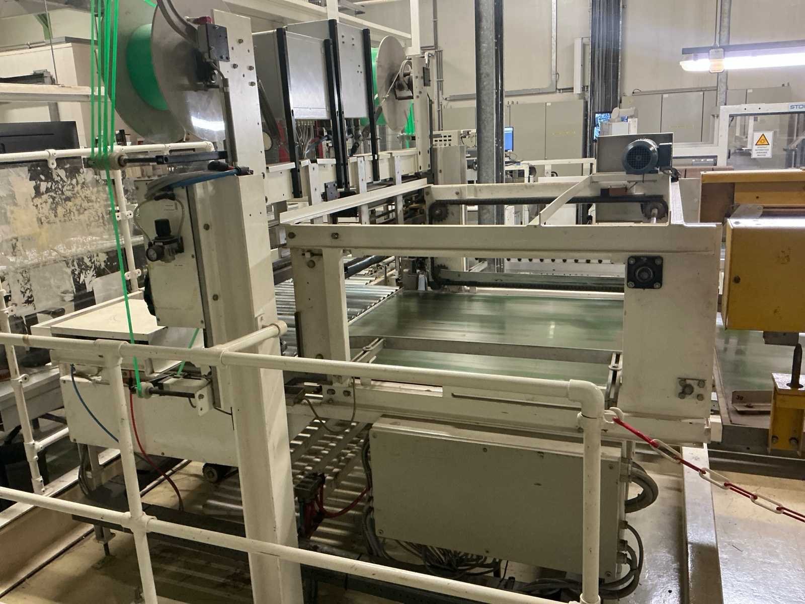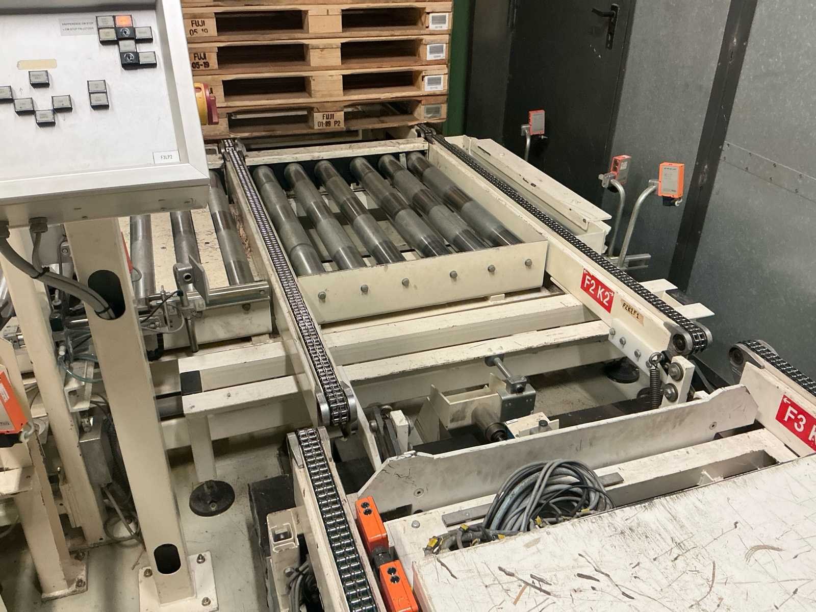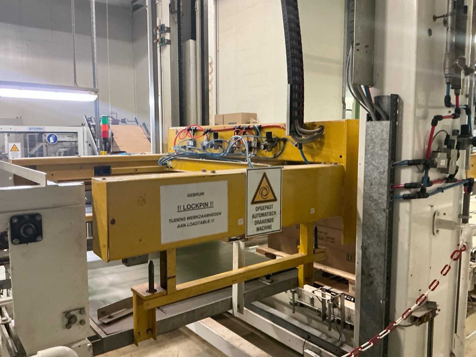 Voorzien van: De complete installatie bestaat uit een Stork Bepak C2000 palletiseermachine (1991) met 27 meter transportbanden en een Stork Conveyor Systems handlingmodule (1988) voor het positioneren, centreren en verplaatsen van pallets, samen goed voor een capaciteit van 8–20 pallets/uur, geschikt voor EU- en blokpallets, gebouwd uit zware staalconstructies met PLC-besturing, veiligheidsvoorzieningen en elektromotorische aandrijving. 27 meter band tot aan 1e pallet. In totaal met automatische car 38m. machine/linielijn waarmee producten automatisch worden opgestapeld (gepaletiseerd) op pallets, vaak in combinatie met een transportband (in dit geval ongeveer 27 meter lang). LET OP! Demontage en levering van de machine zal plaats vinden in Februari 2026! Nee Merk: Stork Bepak Type: C2000 Bouwjaar: 1991 Serienummer: 035 76002 Invoer rollenbaan: true Afvoer rollenbaan: true Veiligheidshekwerk: true Aansluiting: 380V Totale afmeting L: 38000mm