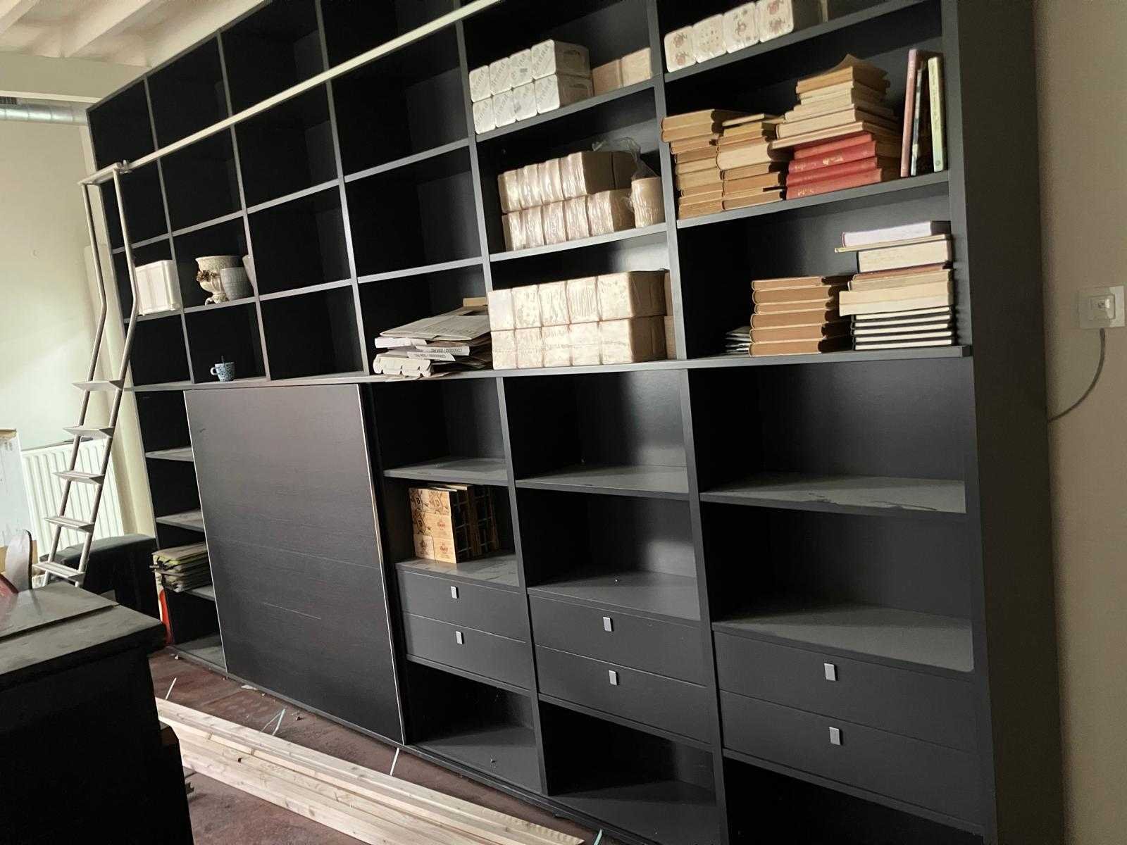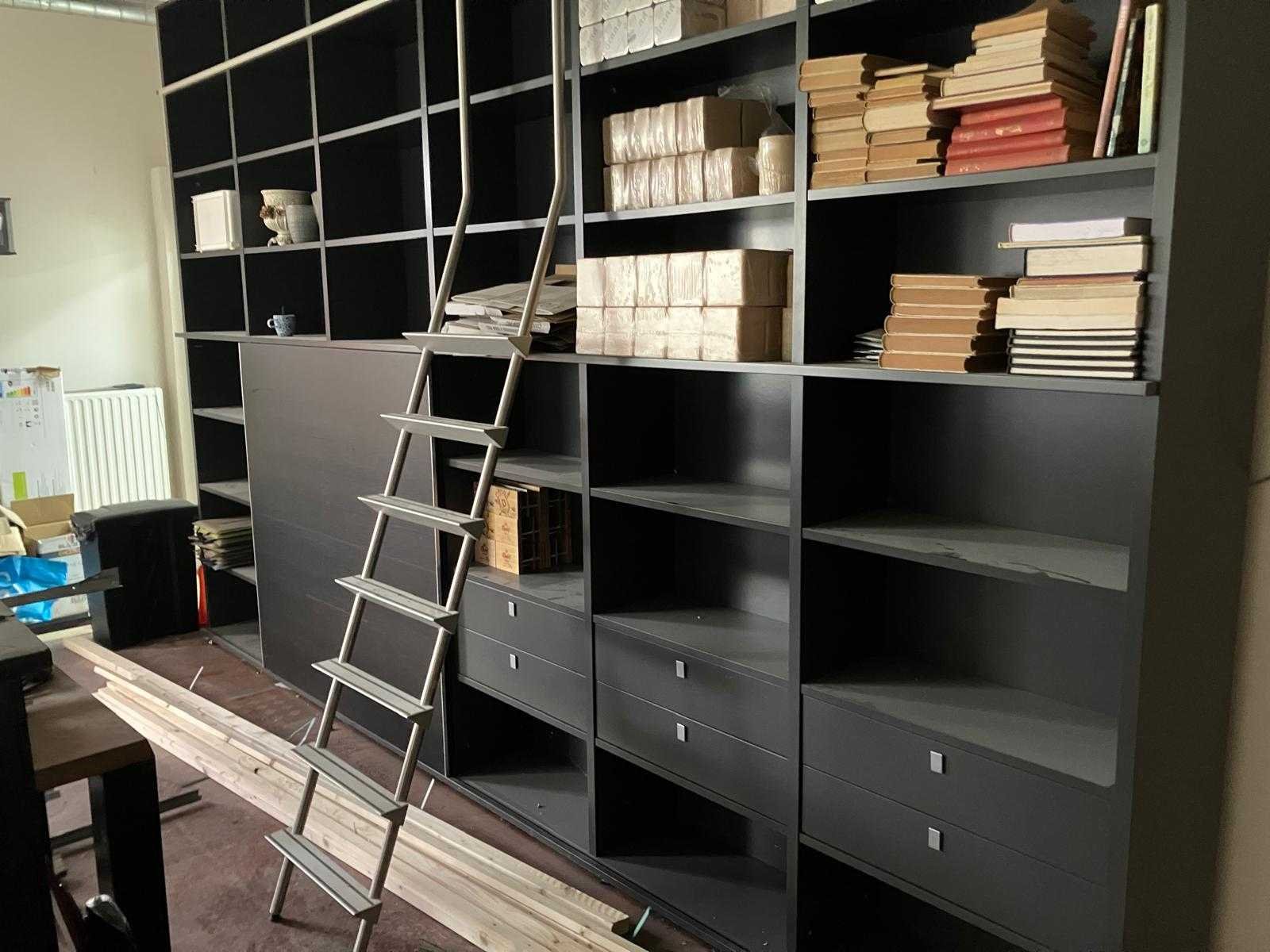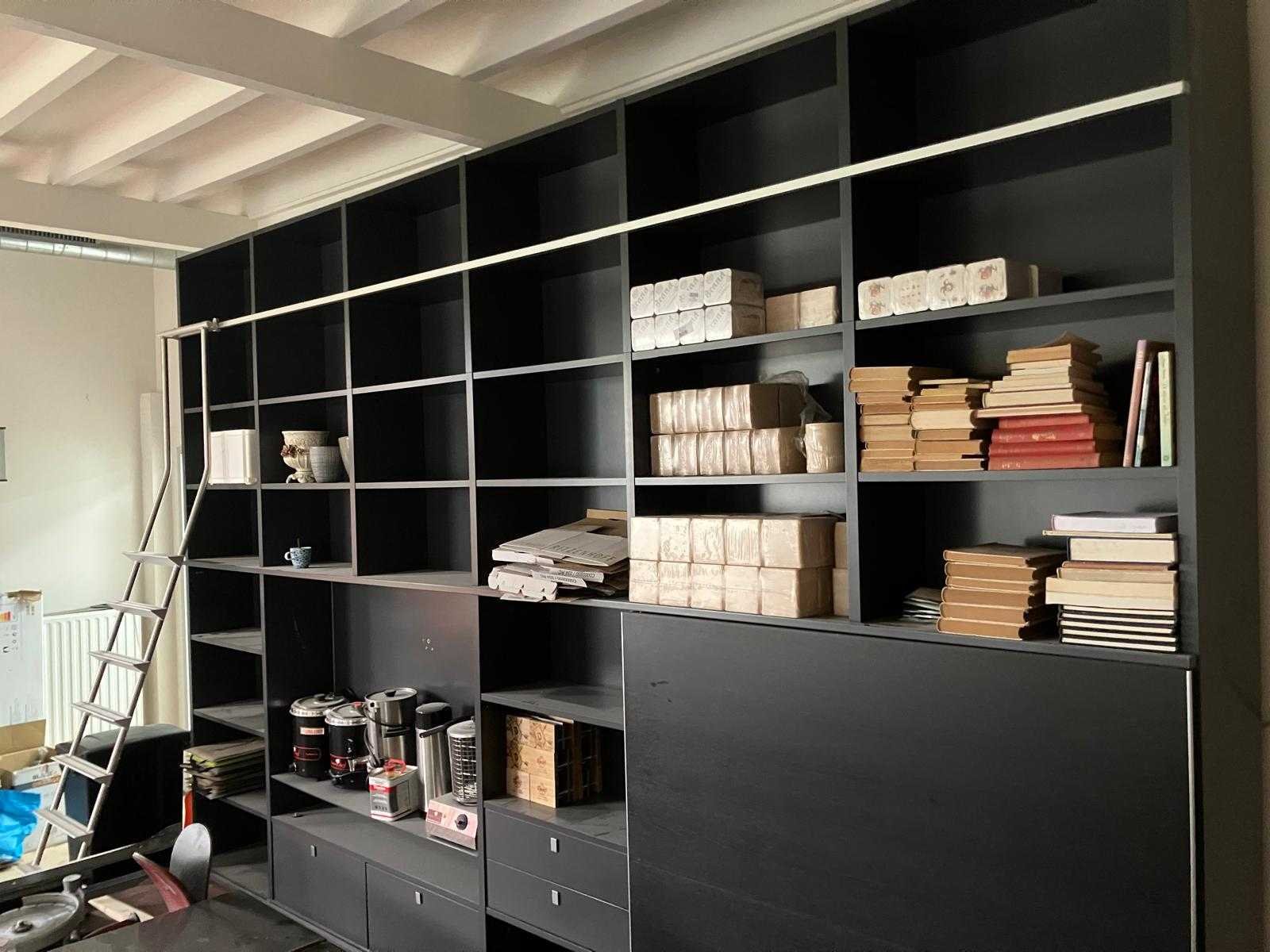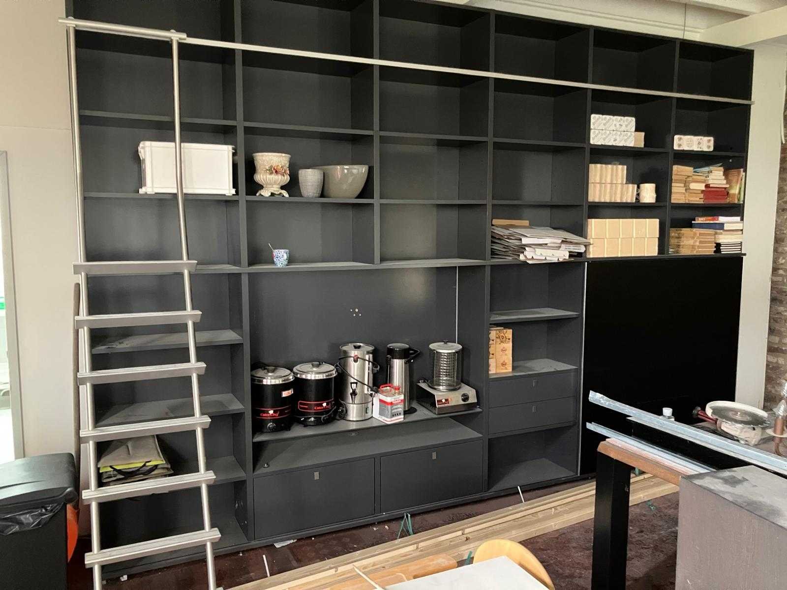 Voorzien van: Vakken indeling zoals op foto, aluminium ladder, industriële ladderrail, schuifdeur, glazen schap, soft-close lades, bovenzijde demonteerbaar d.m.v. fix-excenterbus. Nee Merk: Interlübke Kleur: Zwart Breedte: 4430cm Hoogte: 2950cm Diepte: 450cm Materiaal: Mdf