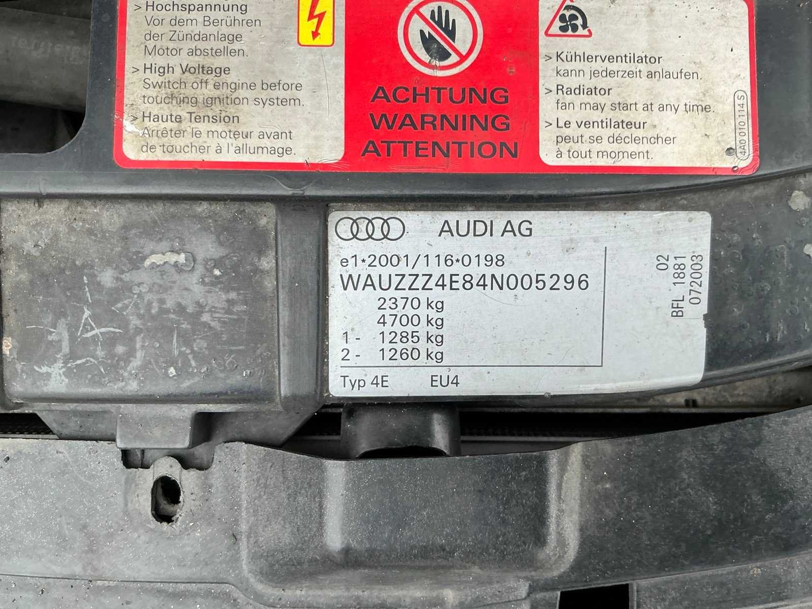 Voorzien van Elektrische stuurbediening, cruise control, elektrische ramen, stoelverwarming, radio. ABS lampje brand, katerisator mogelijk verstopt, moet nagekeken worden. Nee Kenteken: 94-RK-XT Merk: Audi Model: A8 Bouwjaar: 2005 Afgelezen kilometerstand: 392174km Cilinderinhoud: 5998cc Vermogen (kW): 331kW Brandstof: benzine Chassisnummer: WAUZZZ4E84N005296 NAP status: Logisch Datum eerste toelating: 2005-05-23 Datum eerste toelating (NL): 2005-05-23 APK vervaldatum: 2021-12-09 Vermogen (pk): 450hp Energielabel: G Aandrijving: AWD Aantal zitplaatsen: 5 Maximaal trekgewicht ongeremd: 750kg Maximaal trekgewicht geremd: 2300kg Kleur: grijs Transmissie: Automaat Emissieklasse: 4 Aantal deuren: 4 Ledig gewicht: 1935kg Bruto BPM (NL): 42388€ Rest BPM: 0€ Aantal cilinders: 12 Carrosserie: sedan CO2-uitstoot NEDC: 355 Start en rijdt: Ja Self drive export possible : true Airconditioning: true Navigatie: true Xenon verlichting: true Leder bekleed: true Luchtvering: true Vierwielaandrijving 4x4: true