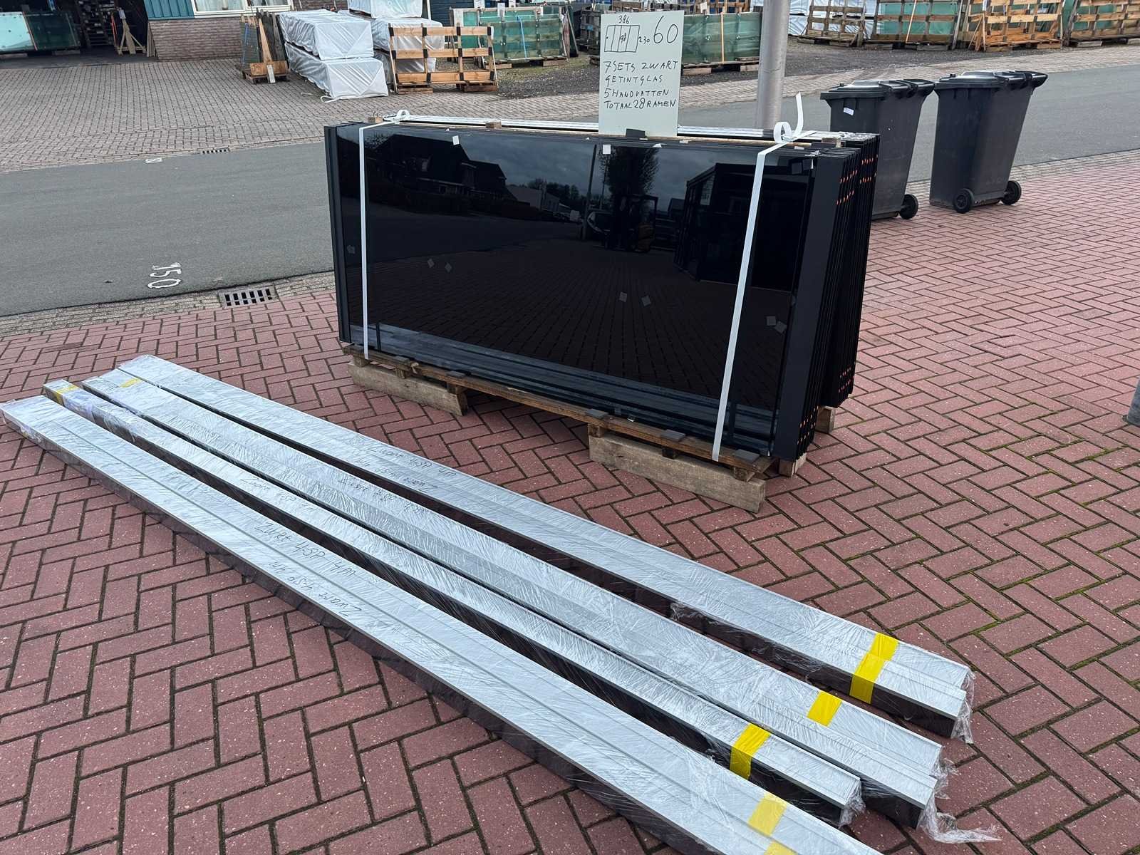 7 sets van 4 schuiframen – 98cm x 230 cm, getint glas • Afmetingen per raam: breedte 98 cm, hoogte (dagmaat) 230 cm • Maximale breedte complete set: 386 cm • Totaal: 28 ramen (7 sets van 4 stuks) • Materiaal & kleur: zwart aluminium frame, getint glas • Inclusief: 7 boven- en 7 onder-rails met 4 sporen • 5 handgrepen • Conditie: partijhandel – kan lichte strepen of vegen bevatten • Verpakking: op pallet met glas • Opmerking: foto van overkapping is ter illustratie • Heftruck is aanwezig voor het afhalen Nee
