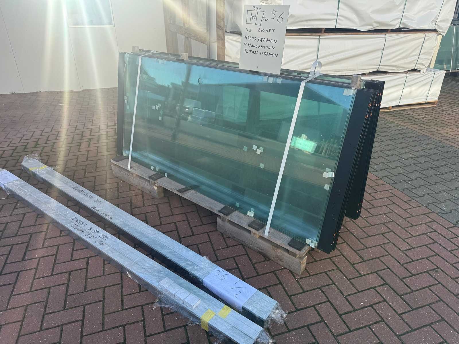 4 sets van 3 schuiframen – 98 cm x 230 cm, helder glas • Afmetingen per raam: breedte 98 cm, hoogte (dagmaat) 230 cm • Maximale breedte complete set: 290 cm • Totaal: 12 ramen (4 sets van 3 stuks) • Materiaal & kleur: zwart aluminium frame, helder glas • Inclusief: 4 boven- en 4 onder-rails met 3 sporen • 4 handgrepen • Conditie: partijhandel – kan lichte strepen of vegen bevatten • Verpakking: op pallet met glas • Opmerking: foto van overkapping is ter illustratie • Heftruck is aanwezig voor het afhalen Nee