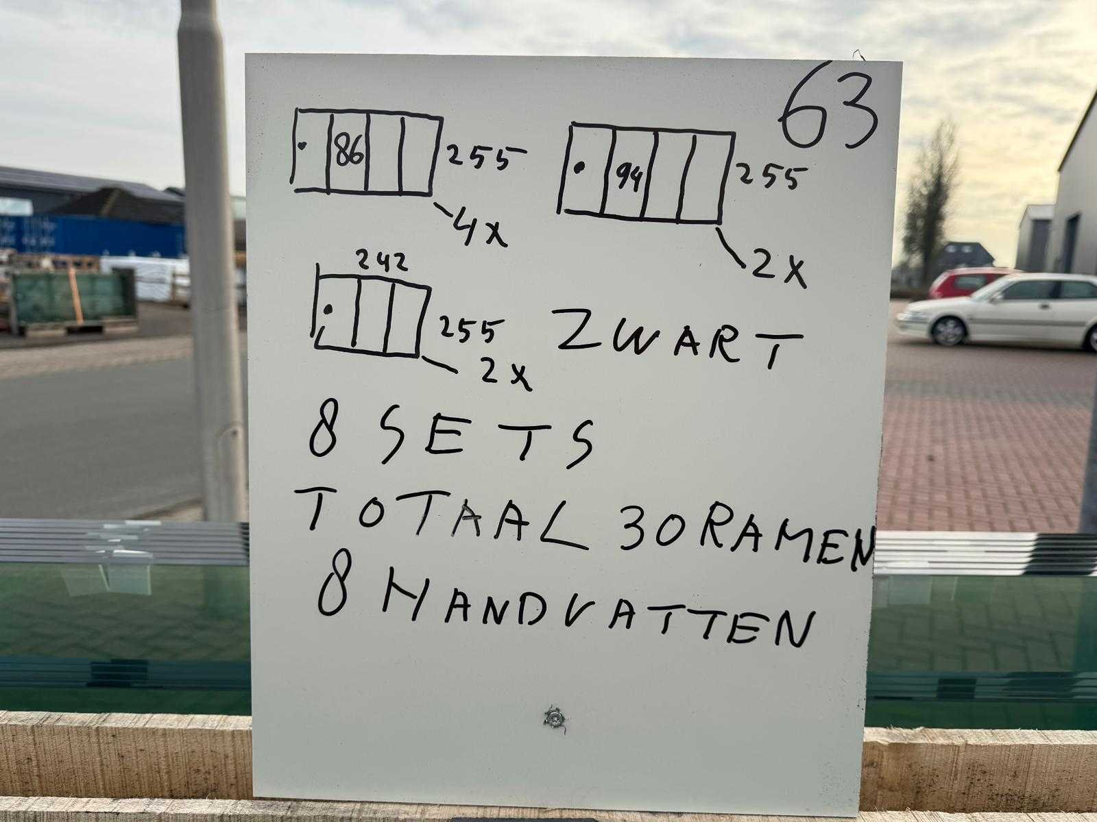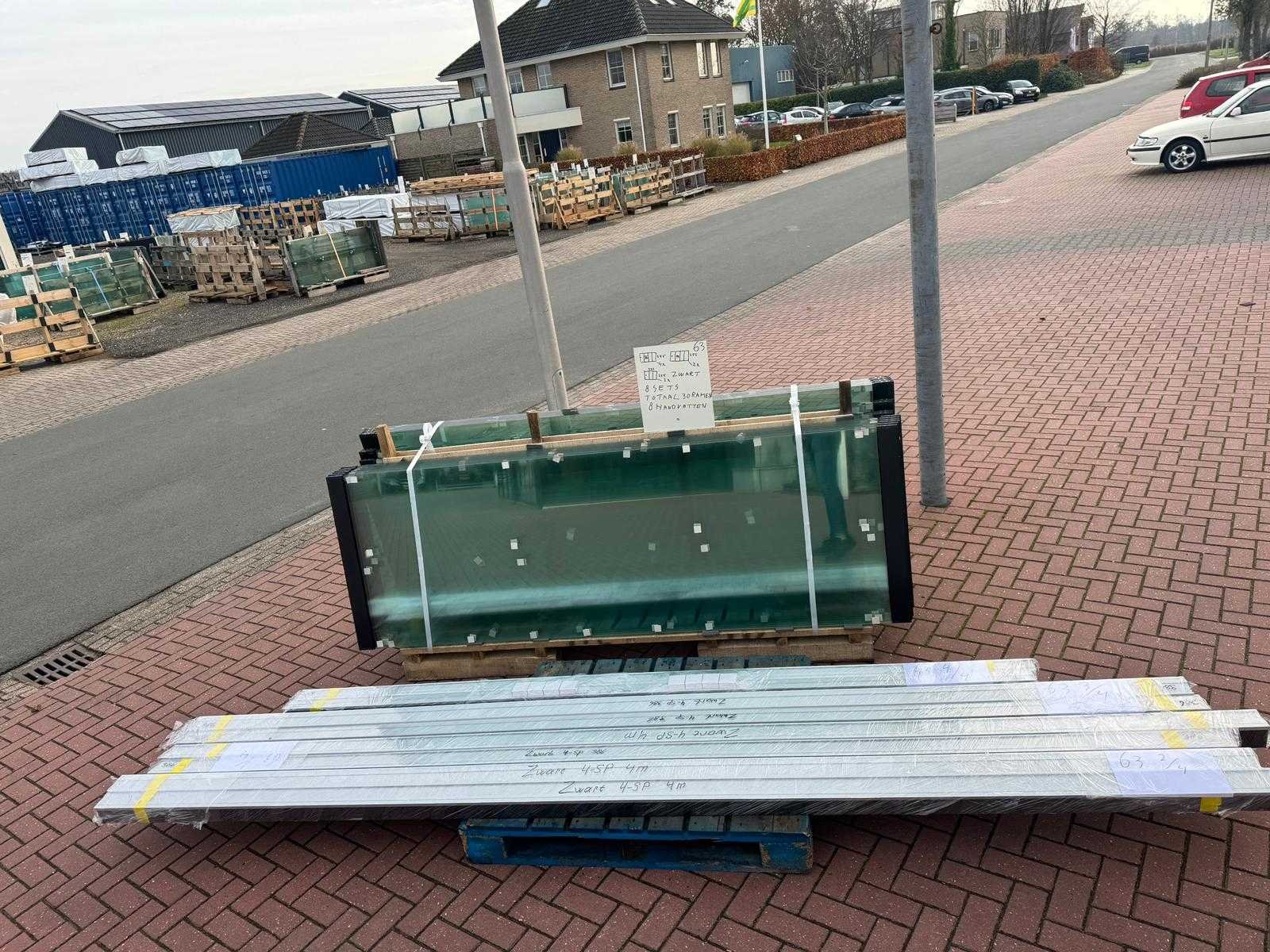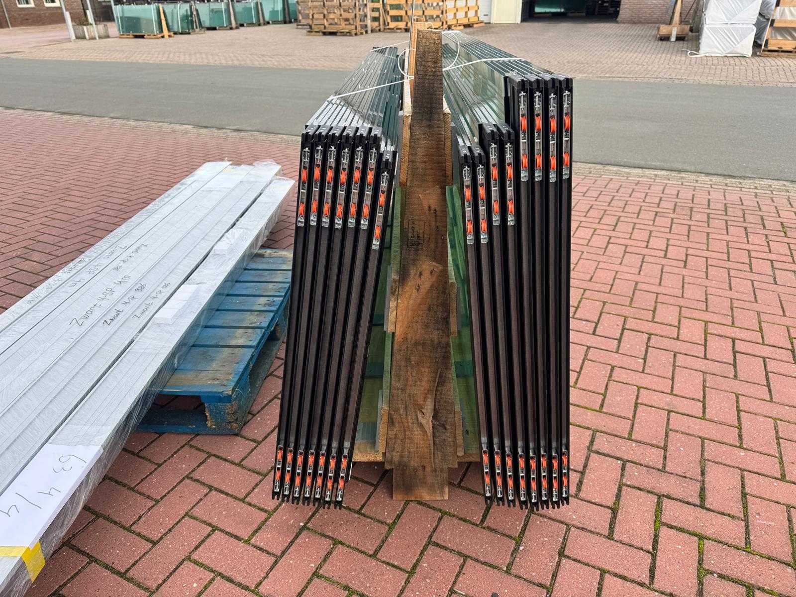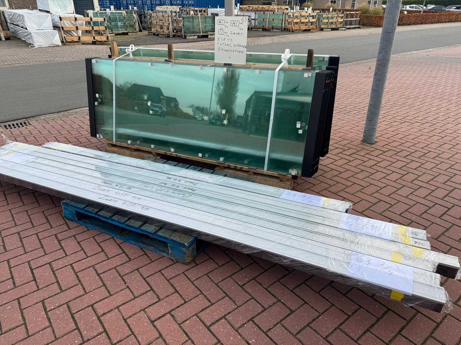 4 sets van 4 schuiframen – 86 cm x 255 cm, helder glas 2 sets van 4 schuiframen – 94 cm x 255 cm, helder glas 2 sets van 3 schuiframen – 82 cm x 255 cm, helder glas • Afmetingen per raam: breedte 86 cm, hoogte (dagmaat) 255 cm • Afmetingen per raam: breedte 94 cm, hoogte (dagmaat) 255 cm • Afmetingen per raam: breedte 82 cm, hoogte (dagmaat) 255 cm • Maximale breedte complete set: 338 cm • Maximale breedte complete set: 370 cm • Maximale breedte complete set: 242 cm • Totaal: 30 ramen (4 sets van 4 stuks), (2 sets van 4 stuks) & (2 sets van 3 stuks) • Materiaal & kleur: zwart aluminium frame, helder glas • Inclusief: 6 boven- en 6 onder-rails met 4 sporen & 2 boven- en 2 onder-rails met 3 sporen • 8 handgrepen • Conditie: partijhandel – kan lichte strepen of vegen bevatten • Verpakking: op pallet met glas • Opmerking: foto van overkapping is ter illustratie • Heftruck is aanwezig voor het afhalen Nee