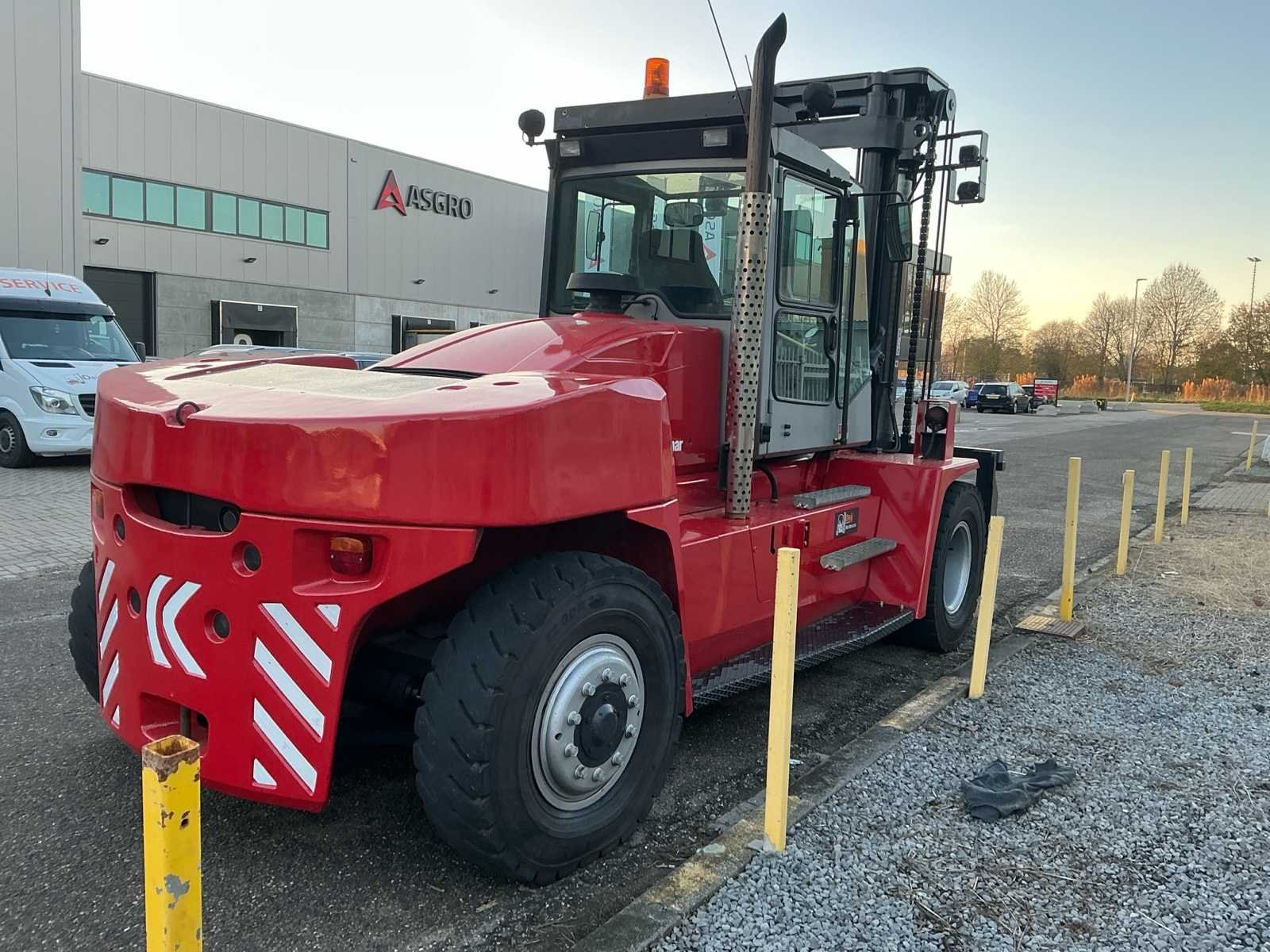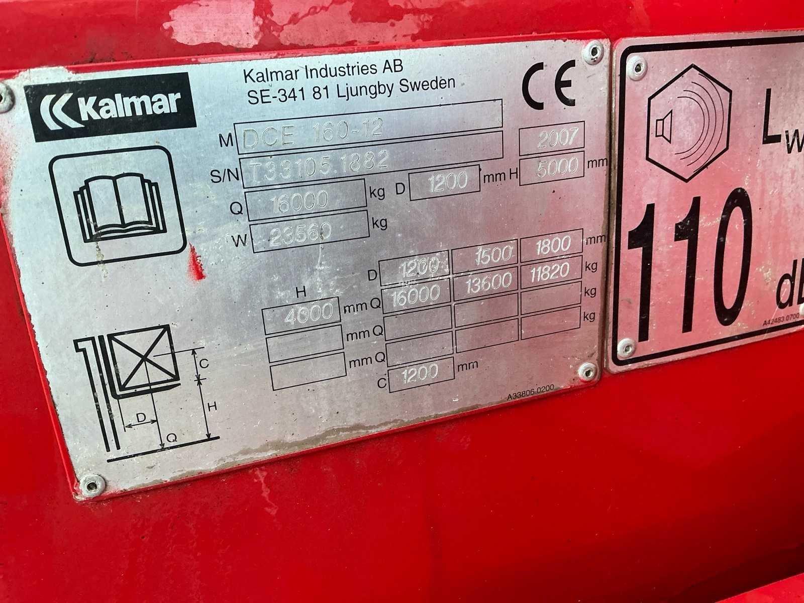 Nee Merk: Kalmar Type: DCE 160-12 Bouwjaar: 2007 Serienummer: T33105.1882 Brandstof: Diesel Aantal wielen: 6 Afgelezen urenstand: 6445 Side-shift: true Hydraulisch verstelbare lepels: true Duplex mast: true Eigen gewicht: 23560kg Hefvermogen: 16000kg Lepellengte: 2380mm Max. hefhoogte: 4100mm Luchtbanden: true Totale afmeting L: 7880mm Totale afmeting Breedte: 2500mm Totale afmeting Hoogte: 3650mm Diesel: true