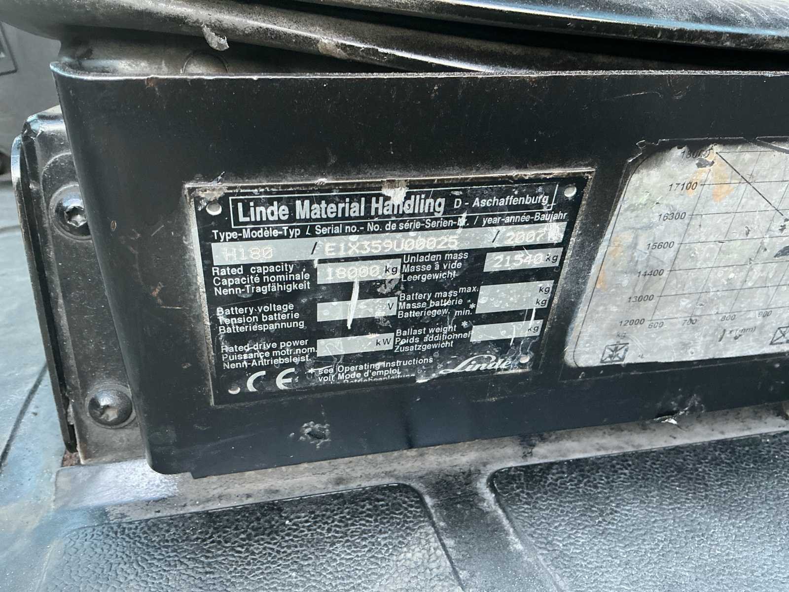 Nee Merk: Linde Type: H180 Bouwjaar: 2007 Serienummer: E1X359U00025 Brandstof: Diesel Mast: Duplex Aantal wielen: 4 Afgelezen urenstand: 114771 Side-shift: true Hydraulisch verstelbare lepels: true Duplex mast: true Eigen gewicht: 21540kg Hefvermogen: 18000kg Lepellengte: 2000mm Max. hefhoogte: 4000mm Luchtbanden: true Vol rubber banden: false Totale afmeting L: 7100mm Totale afmeting Breedte: 2560mm Totale afmeting Hoogte: 3650mm Diesel: true