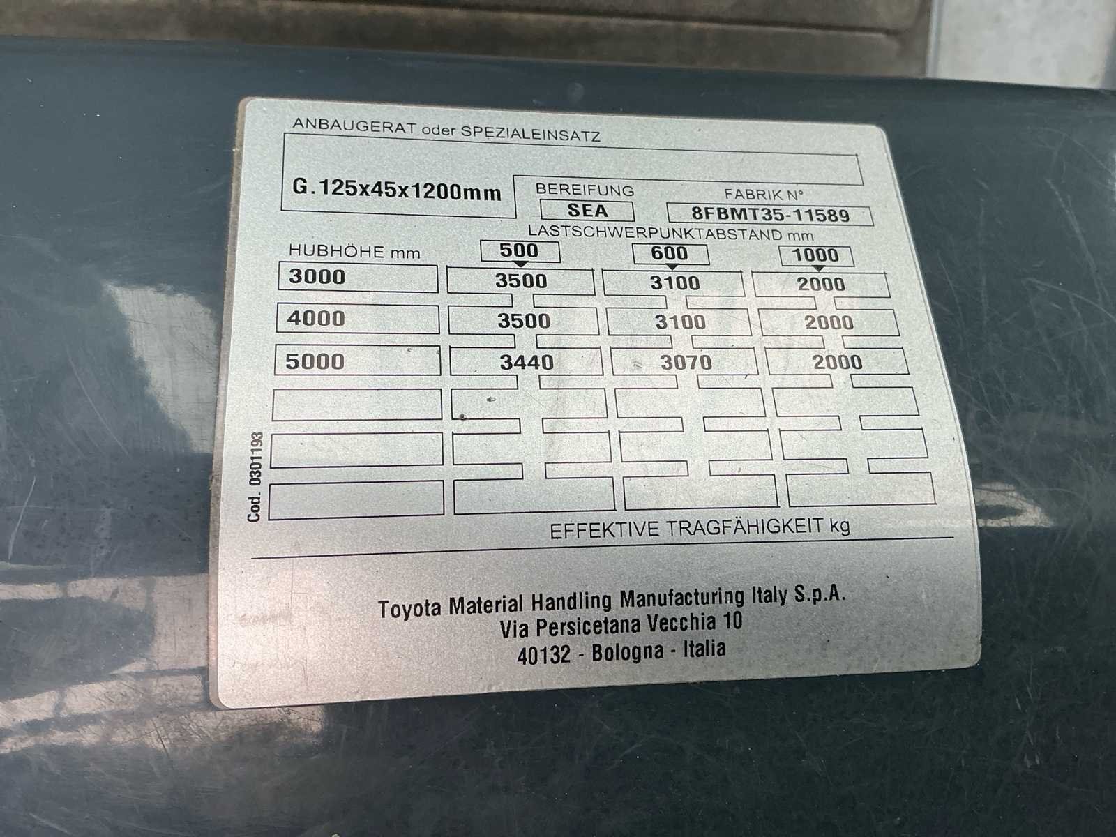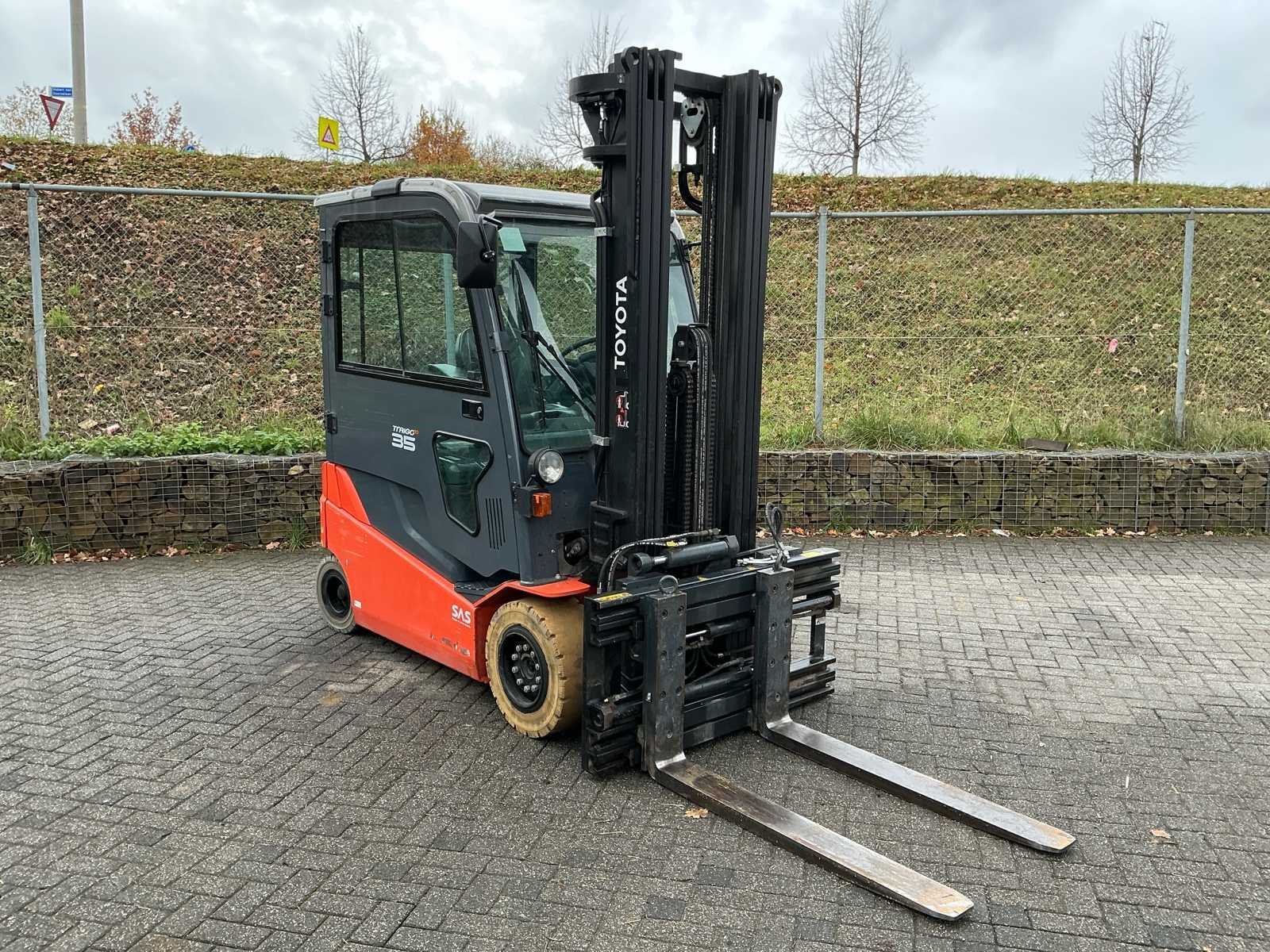 Voorzien van: volrubber non-markant banden, side-shift, hydraulisch verstelbare vorken, ruitenwissers, trekhaak, verwarmde achterruit, Grammer mechanisch geveerde stoel, mini-lever bediening, verwarming, noodstop, No Merk: Toyota Type: 8FBMT35 Bouwjaar: 2017 Serienummer: 8FBMT36-11589 Brandstof: Elektrisch Mast: Triplex Soort band: Volrubber Aantal wielen: 4 Afgelezen urenstand: 1602 Side-shift: true Hydraulisch verstelbare lepels: true Triple mast: true Eigen gewicht: 6335kg Hefvermogen: 3500kg Lepellengte: 1200mm Vol rubber banden: true Minimale doorrijhoogte: 2600mm Totale afmeting L: 3800mm Totale afmeting Breedte: 1350mm Totale afmeting Hoogte: 2600mm