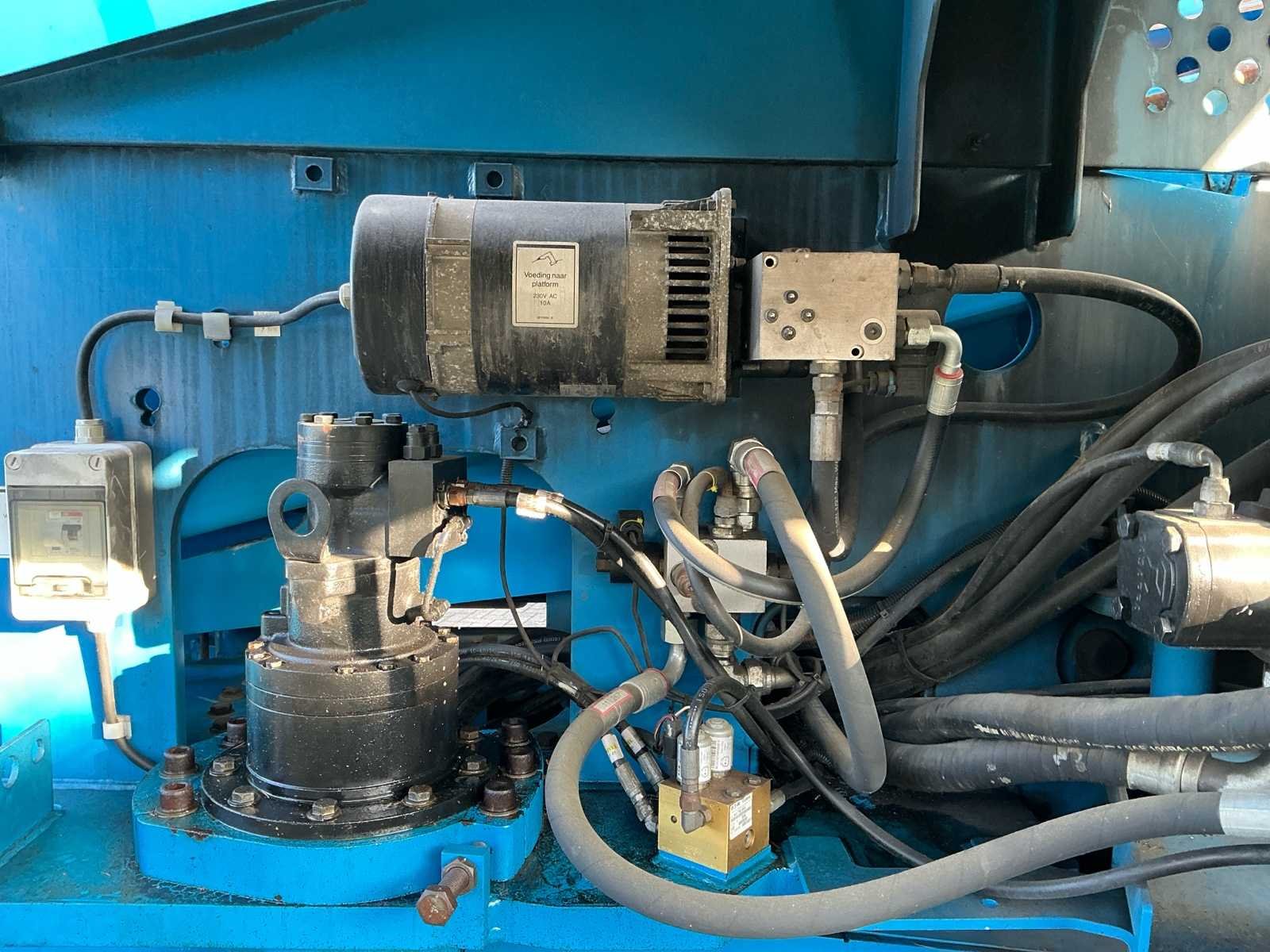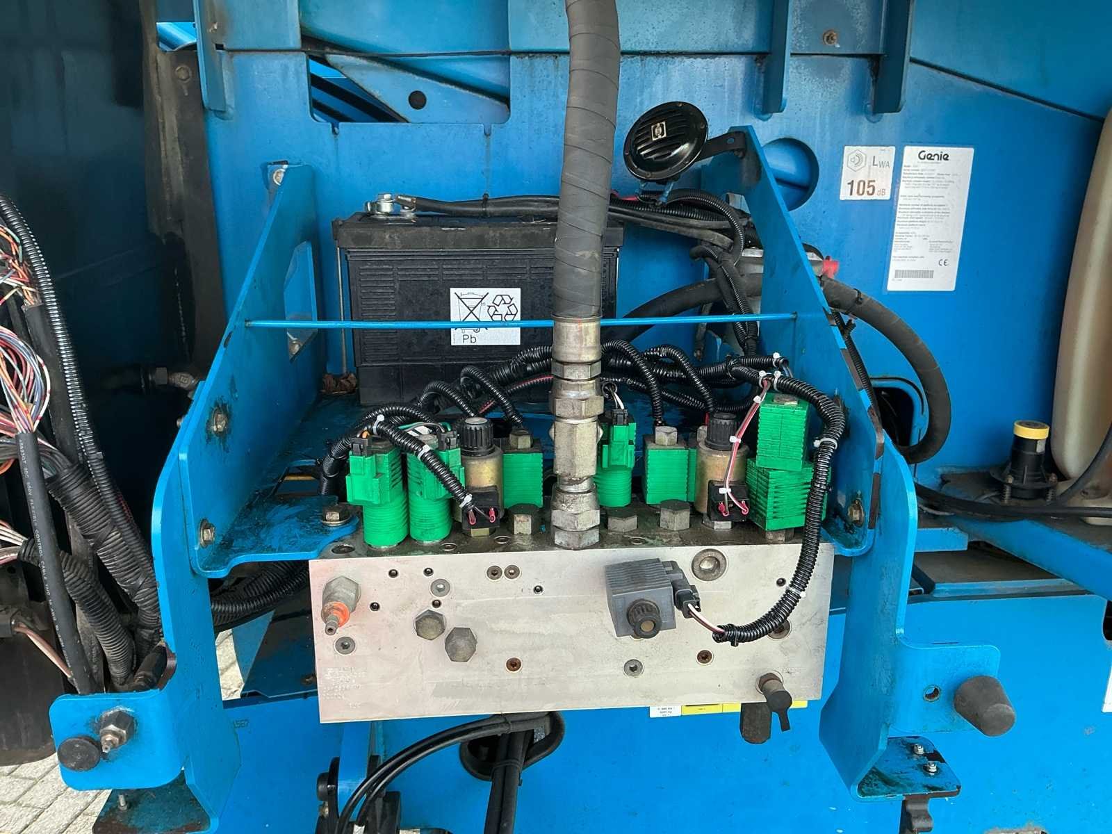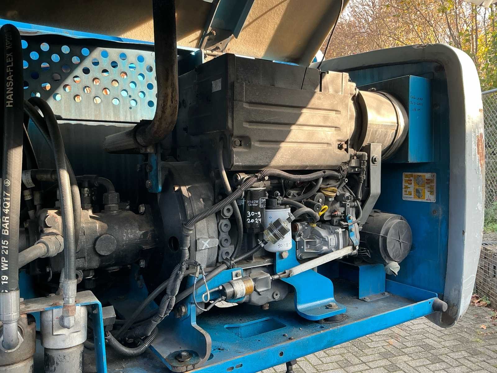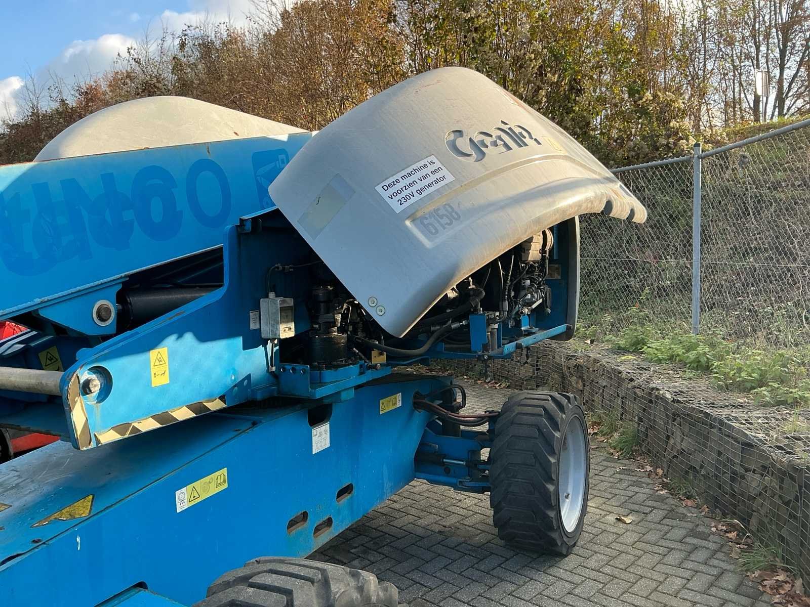Voorzien van: maximale werkhoogte (op banden) 21,81 m, horizontaal bereik maximaal 17,10 m, platform lengte 0,91 m, platform breedte 2,44 m, hefvermogen 227 kg, platformrotatie 160°, verticale giekrotatie 135° (+78° / -57°), 12 V DC proportioneel, RT schuimgevuld 355/55D 625, Deutz TD2011 L04i 4 cylinder turbo diesel 55 kW (74 hp), 4WD, 4WS, Hydraulische platformrotatie, proportionele joystickbediening, besturing met duimtuimelschakelaar, netsnoer naar platform, kantelalarm, dalings- en rijalarmen, urenteller, 360° continue draaitafelrotatie, wielmotoren met twee snelheden, 7 kVA hydraulische generator (240 V 50 Hz), uitlaatdemper met dieselkatalysator, 240 V stroomvoorziening naar platform. No Merk: Genie Type: S-65 Bouwjaar: 2011 Serienummer: S6011-21567 Diesel: true Telescoop hoogwerker: true Werkhoogte: 21800mm Horizontale rijkwijdte: 17100mm Plateau afm. l: 2440mm Plateau afm. b: 910mm Platform capaciteit: 227kg Afgelezen urenstand: 638 Eigen gewicht: 10089kg