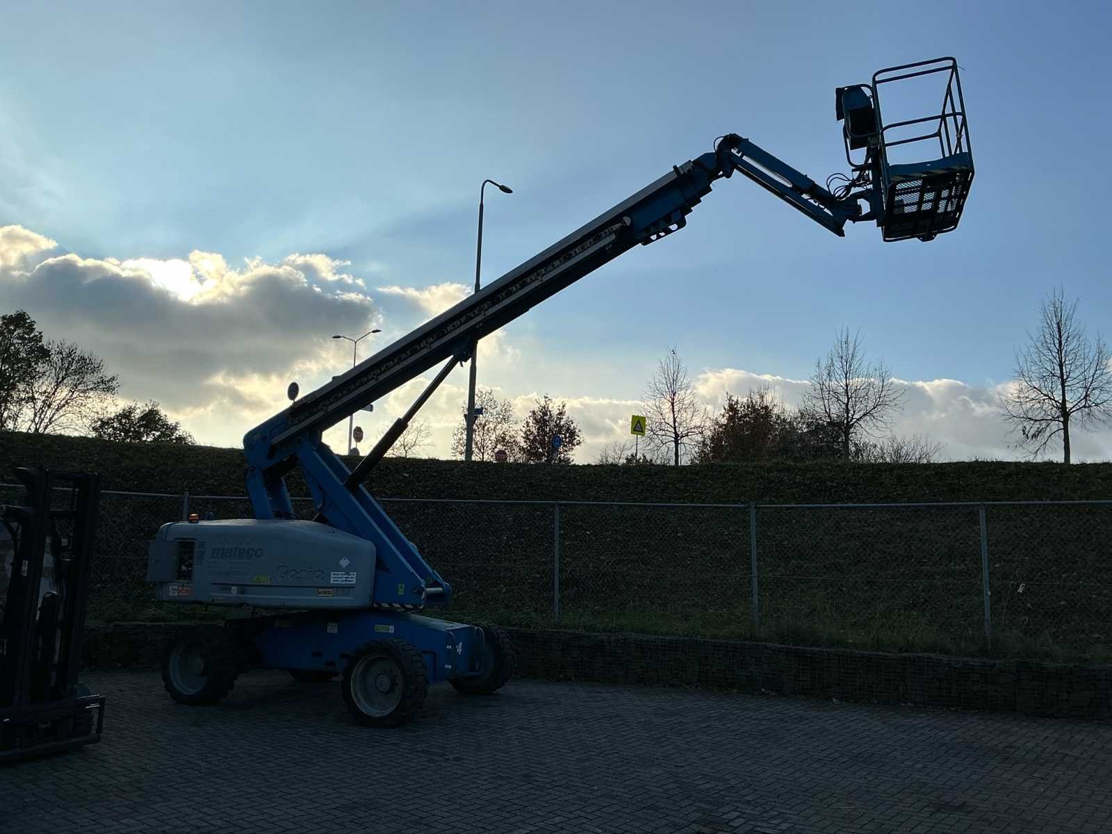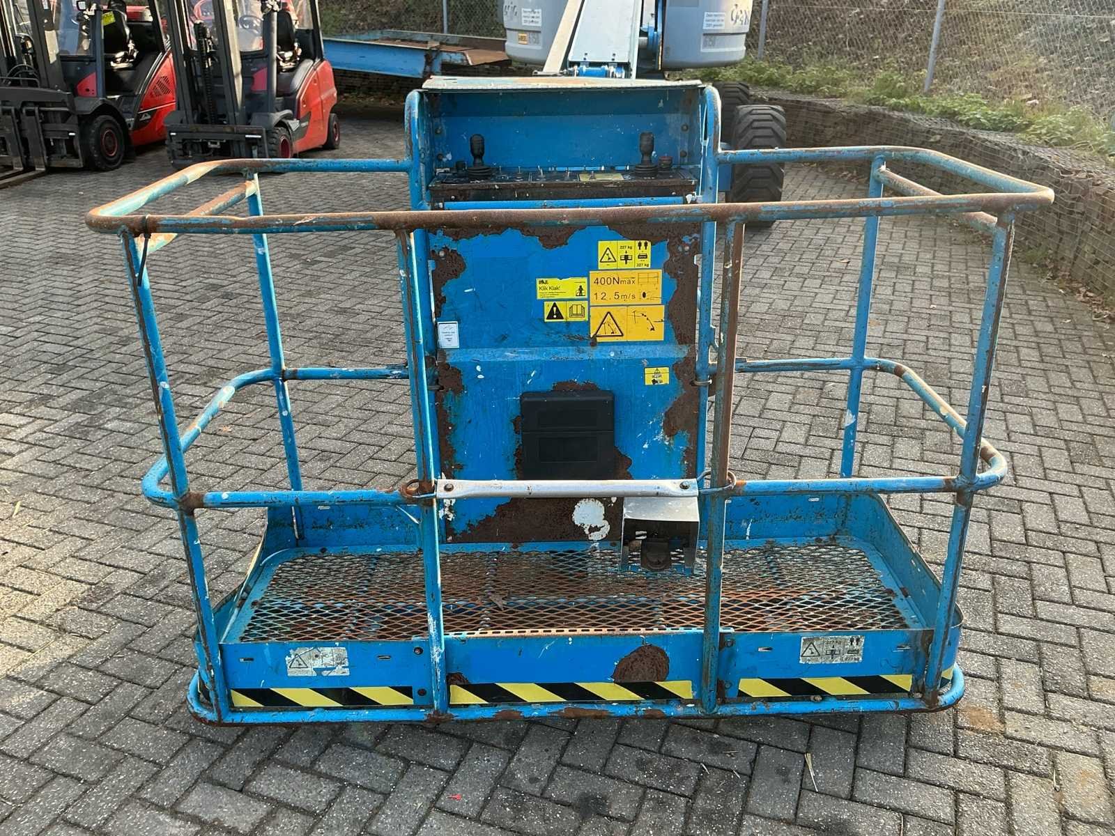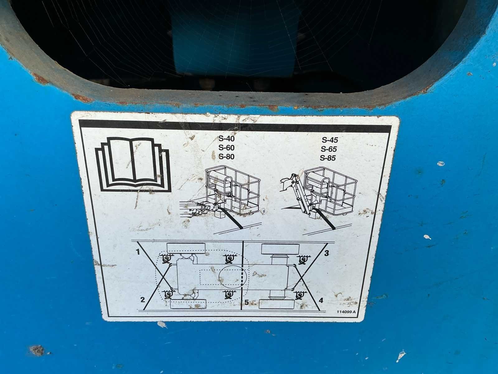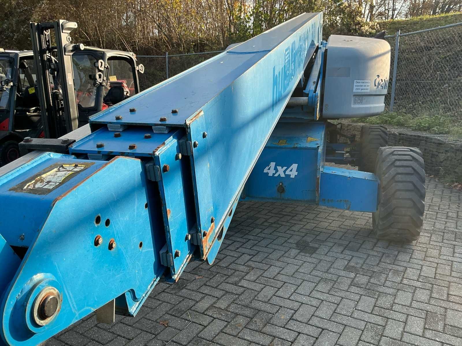 Voorzien van: maximale werkhoogte (op banden) 21,81 m, horizontaal bereik maximaal 17,10 m, platform lengte 0,91 m, platform breedte 2,44 m, hefvermogen 227 kg, platformrotatie 160°, verticale giekrotatie 135° (+78° / -57°), 12 V DC proportioneel, RT schuimgevuld 355/55D 625, Deutz TD2011 L04i 4 cylinder turbo diesel 55 kW (74 hp), 4WD, 4WS, Hydraulische platformrotatie, proportionele joystickbediening, besturing met duimtuimelschakelaar, netsnoer naar platform, kantelalarm, dalings- en rijalarmen, urenteller, 360° continue draaitafelrotatie, wielmotoren met twee snelheden, 7 kVA hydraulische generator (240 V 50 Hz), uitlaatdemper met dieselkatalysator, 240 V stroomvoorziening naar platform. No Merk: Genie Type: S-65 Bouwjaar: 2011 Serienummer: S6011-21567 Diesel: true Telescoop hoogwerker: true Werkhoogte: 21800mm Horizontale rijkwijdte: 17100mm Plateau afm. l: 2440mm Plateau afm. b: 910mm Platform capaciteit: 227kg Afgelezen urenstand: 638 Eigen gewicht: 10089kg