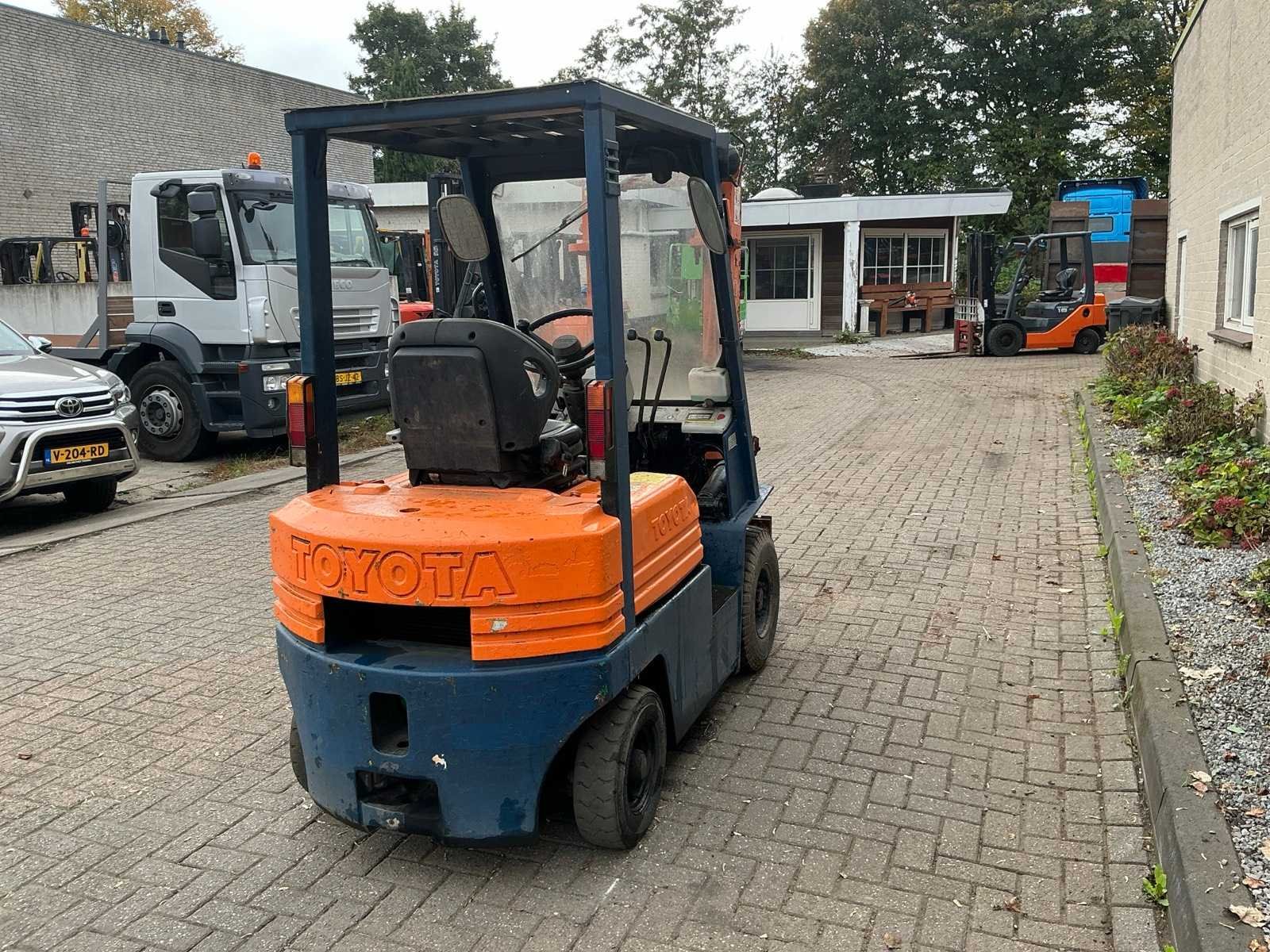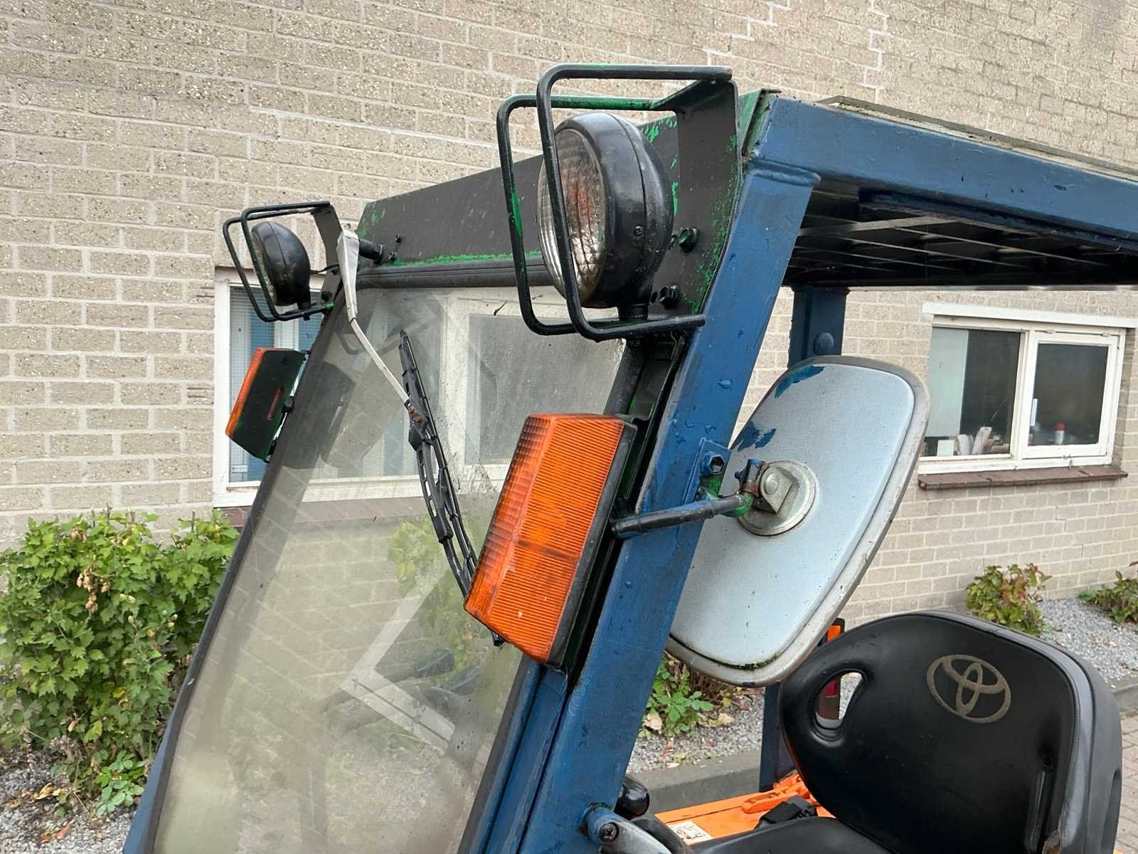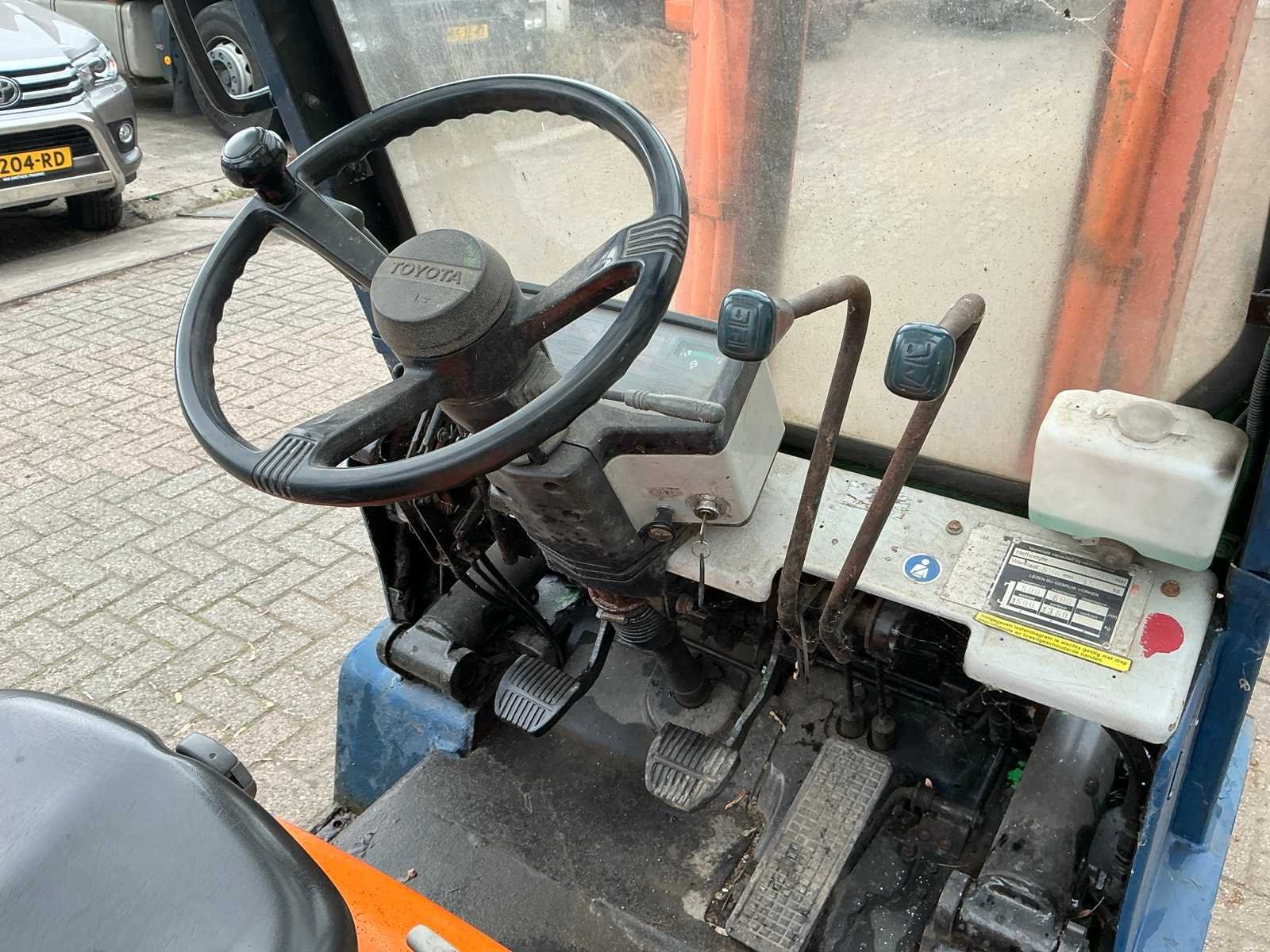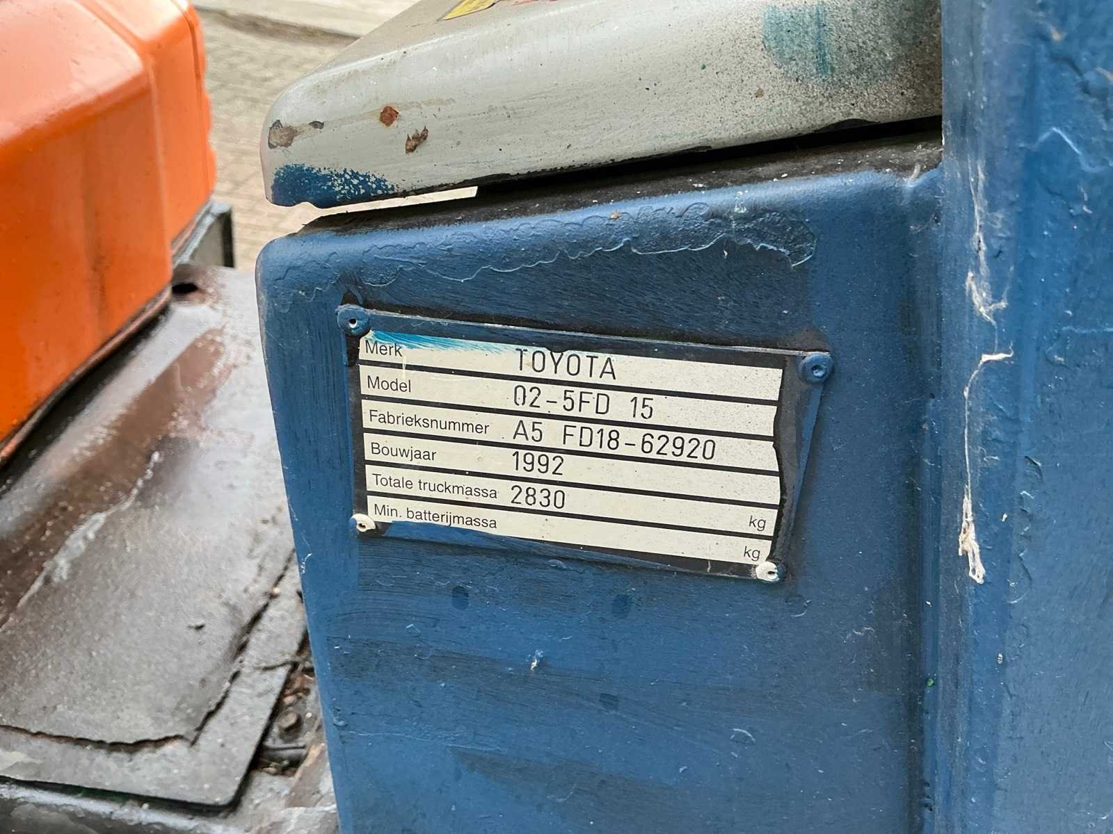 Voorzien van: werkverlichting, verlichting, spiegels, ruitenwisser, magneet in lepels, beschermende kooi, gordel Nee Merk: Toyota Type: 02-5FD 15 Bouwjaar: 1992 Serienummer: A5 FD18-62920 Brandstof: Diesel Mast: Duplex Soort band: Luchtbanden Aantal wielen: 4 Afgelezen urenstand: 9046 Duplex mast: true Eigen gewicht: 2830kg Hefvermogen: 1500kg Lepellengte: 890mm Max. hefhoogte: 3000mm Luchtbanden: true Totale afmeting L: 2900mm Totale afmeting Breedte: 1020mm Totale afmeting Hoogte: 2020mm Diesel: true