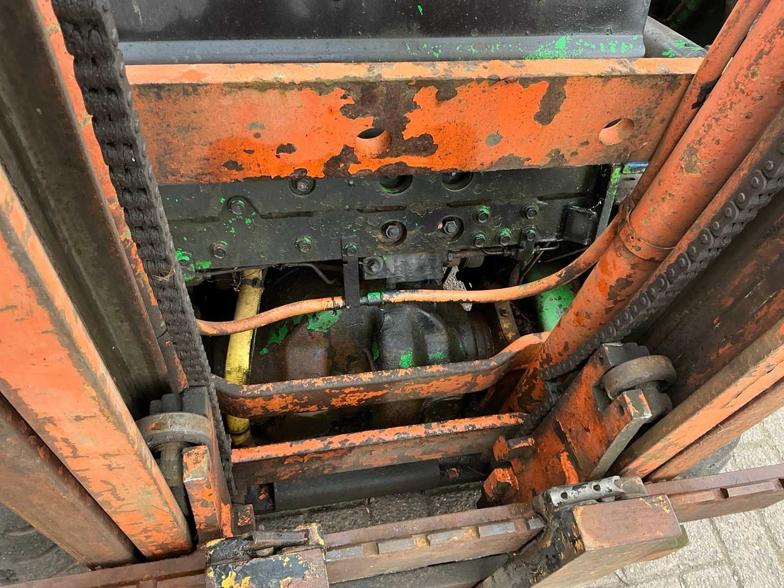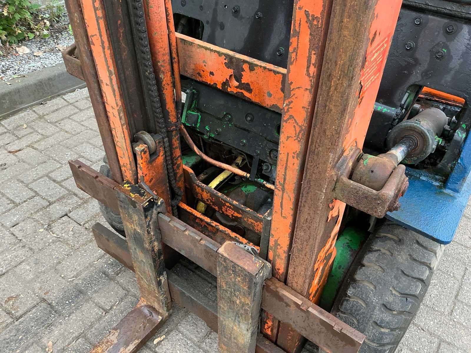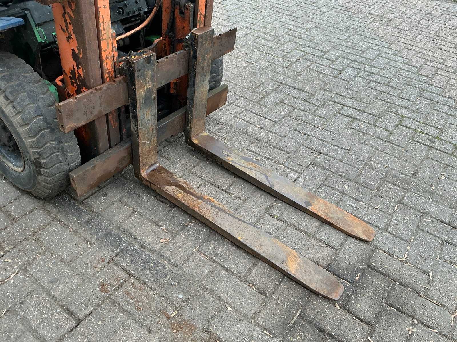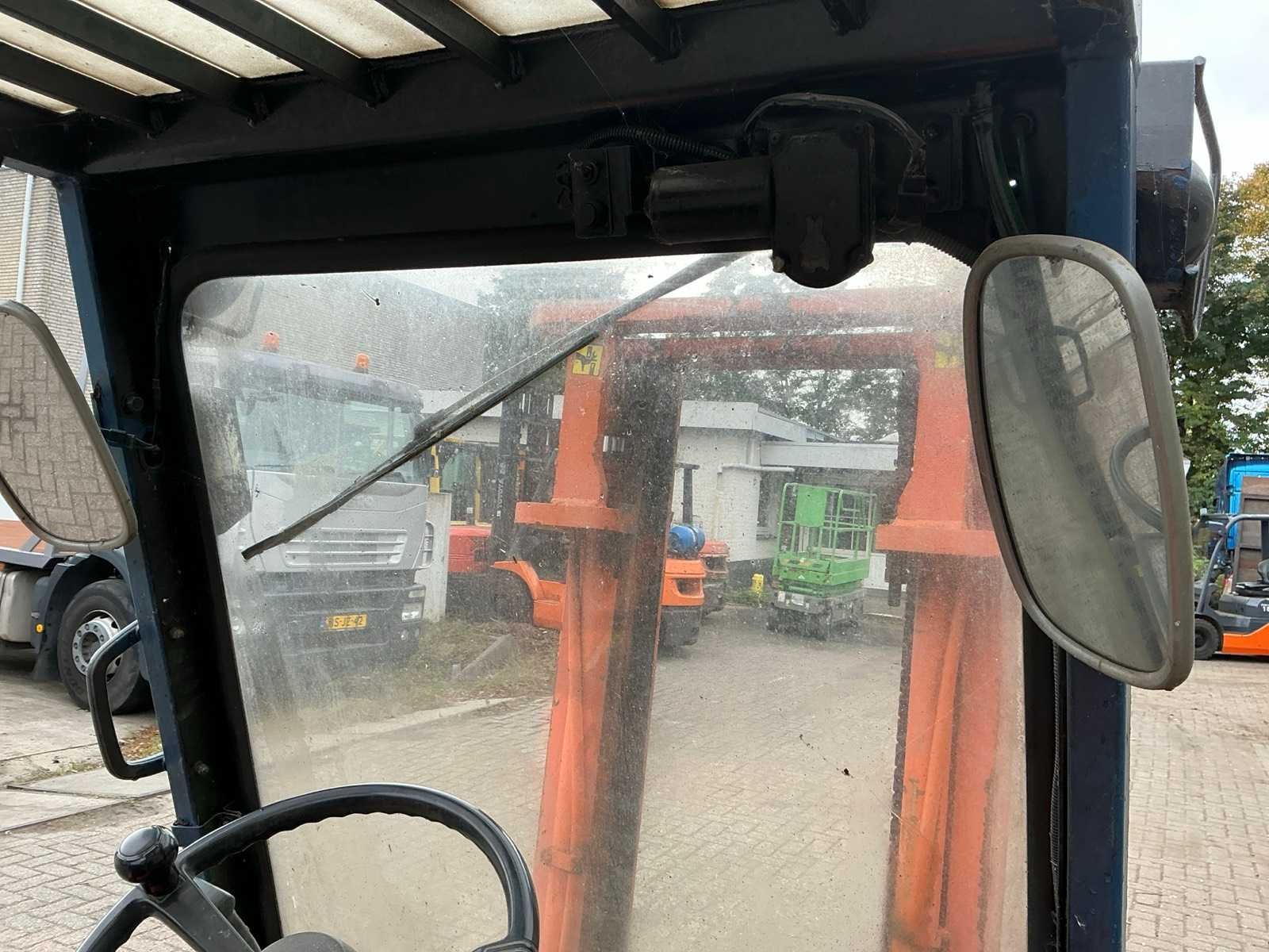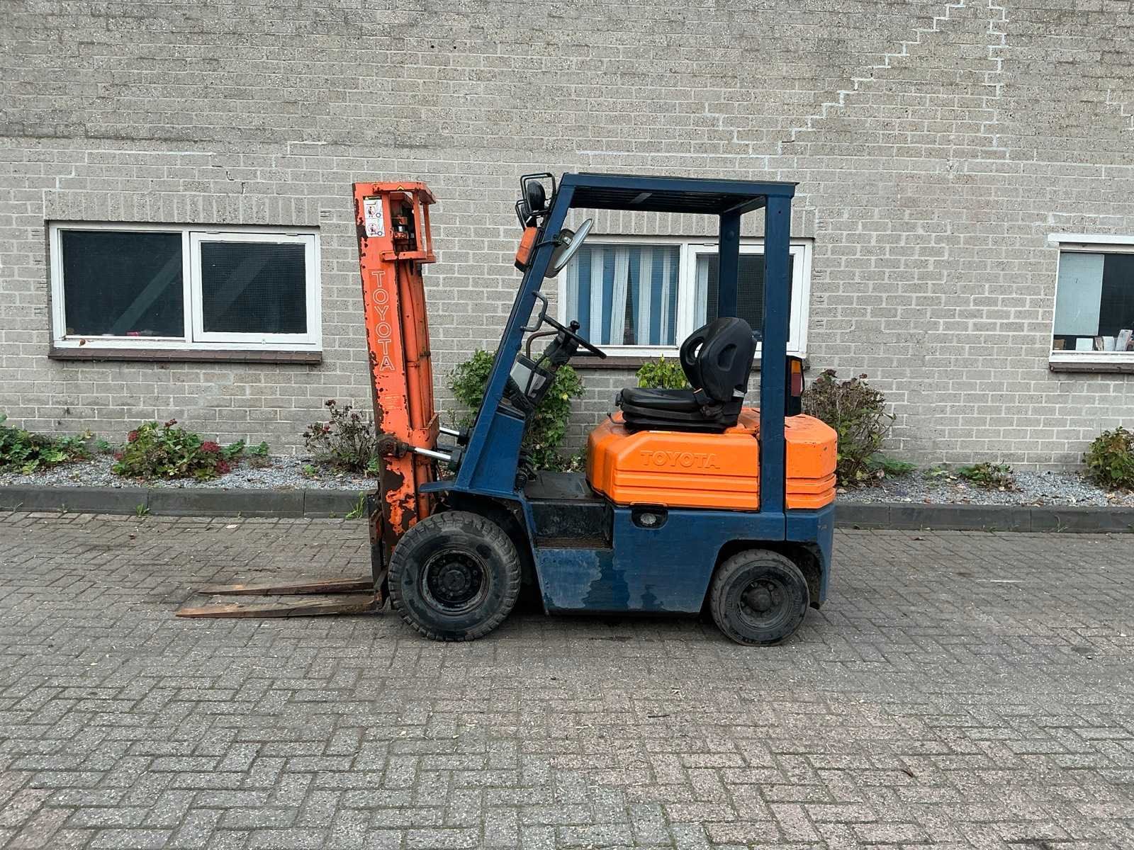 Voorzien van: werkverlichting, verlichting, spiegels, ruitenwisser, magneet in lepels, beschermende kooi, gordel Nee Merk: Toyota Type: 02-5FD 15 Bouwjaar: 1992 Serienummer: A5 FD18-62920 Brandstof: Diesel Mast: Duplex Soort band: Luchtbanden Aantal wielen: 4 Afgelezen urenstand: 9046 Duplex mast: true Eigen gewicht: 2830kg Hefvermogen: 1500kg Lepellengte: 890mm Max. hefhoogte: 3000mm Luchtbanden: true Totale afmeting L: 2900mm Totale afmeting Breedte: 1020mm Totale afmeting Hoogte: 2020mm Diesel: true