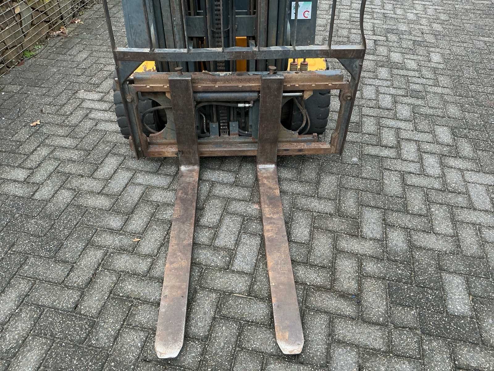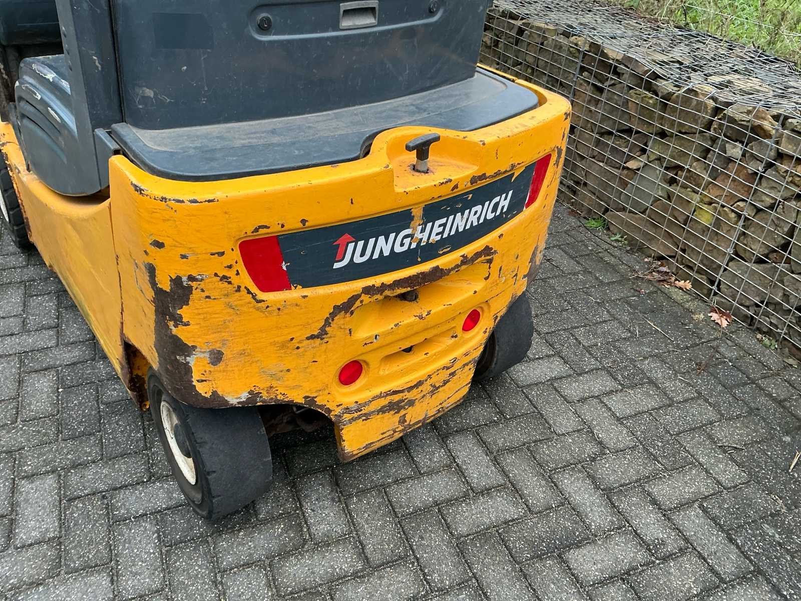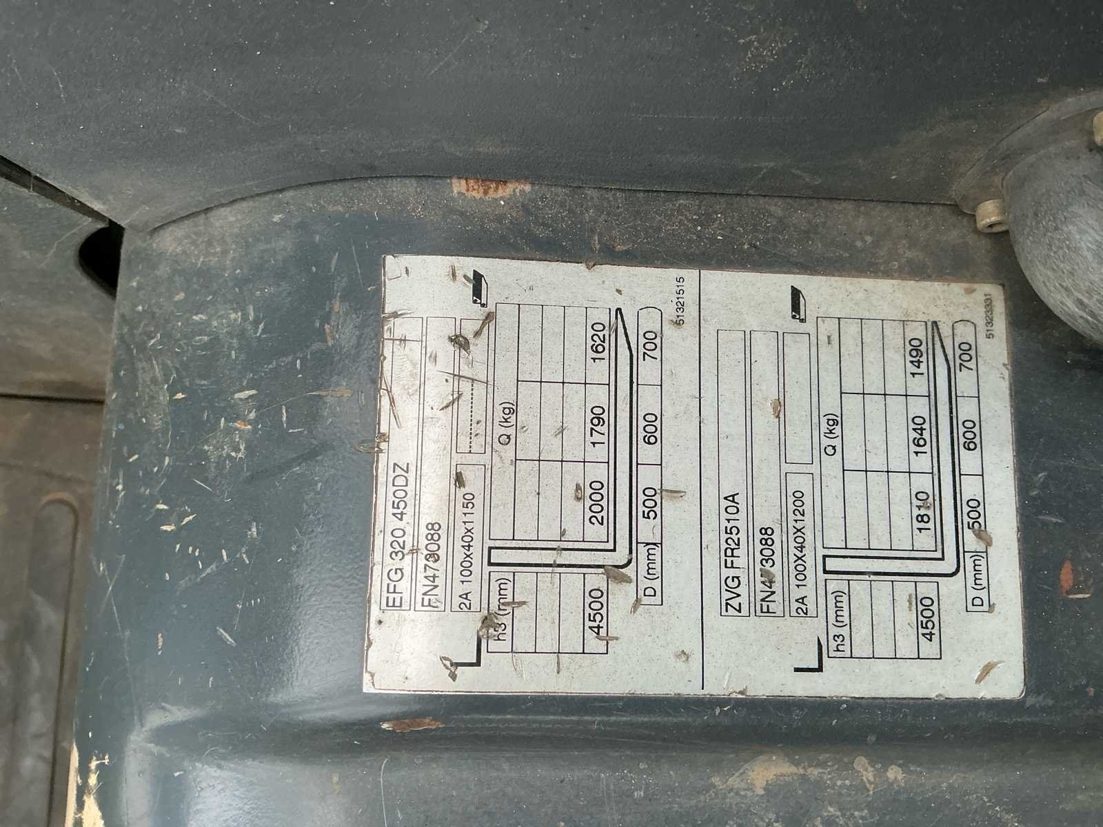 Voorzien van: triplex mast, side-shift, Grammer mechanisch geveerde stoel, aux. aansluiting langs mast, mini-lever bediening op armleuning, trekhaak, werkkampen, automatische parkeerrem tegen terugrollen op hellingen, slijtagevrij regeneratief remmen met motorrem, verstelbare stuurkolom kan in hoogte en neiging worden versteld. No Merk: Jungheinrich Type: EFG 320 Serienummer: FN473088 Brandstof: Elektrisch Mast: Triplex Soort band: Volrubber Aantal wielen: 4 Afgelezen urenstand: 6414 Side-shift: true Triple mast: true Hefvermogen: 2000kg Lepellengte: 1000mm Max. hefhoogte: 7000mm Vol rubber banden: true Minimale doorrijhoogte: 2100mm Totale afmeting L: 3300mm Totale afmeting Breedte: 1150mm Totale afmeting Hoogte: 2100mm