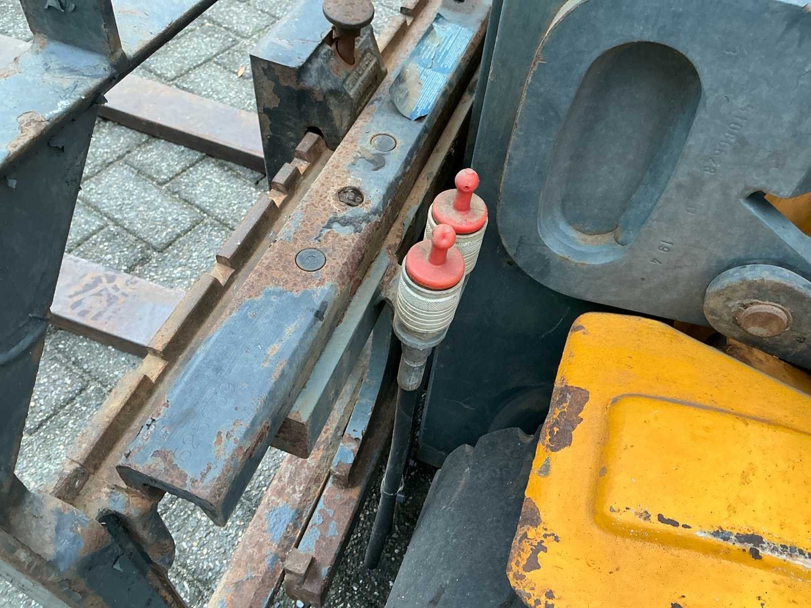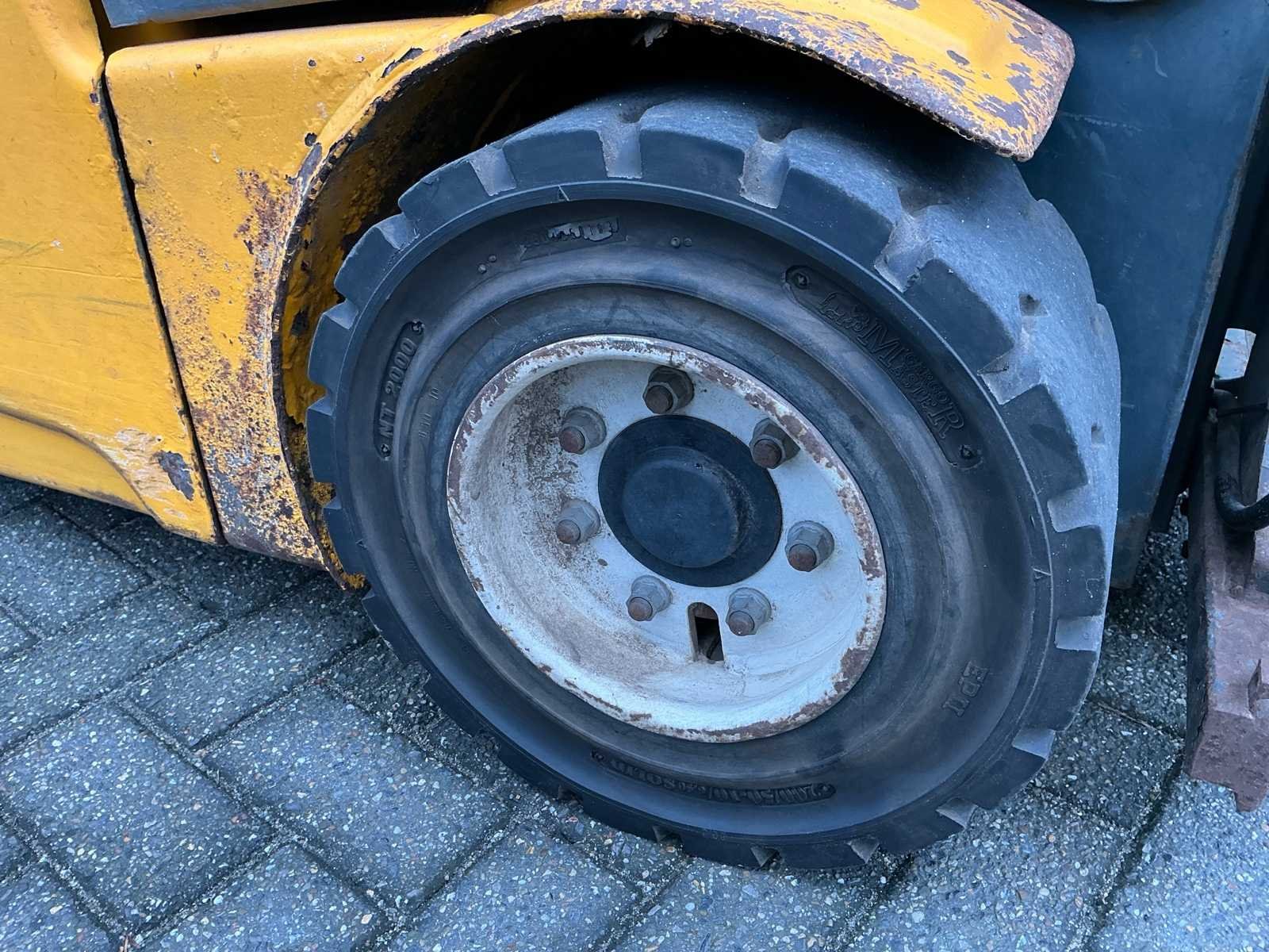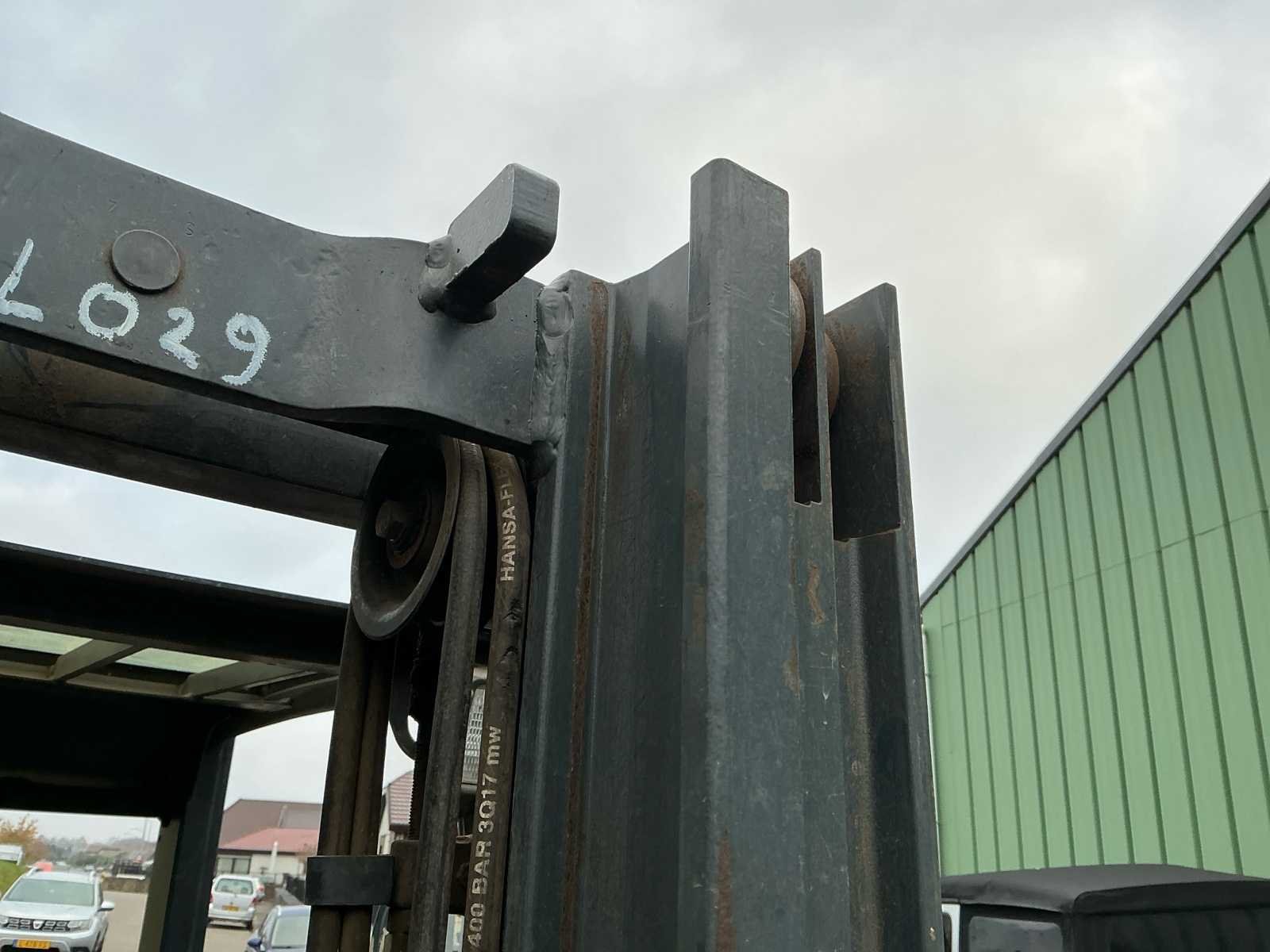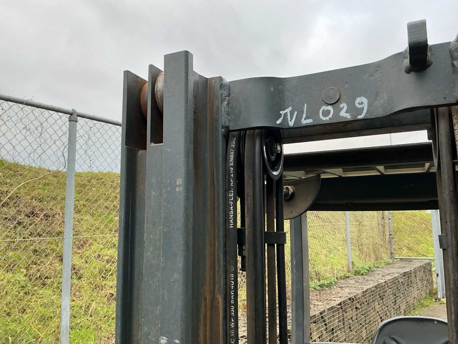 Voorzien van: triplex mast, side-shift, Grammer mechanisch geveerde stoel, aux. aansluiting langs mast, mini-lever bediening op armleuning, trekhaak, werkkampen, automatische parkeerrem tegen terugrollen op hellingen, slijtagevrij regeneratief remmen met motorrem, verstelbare stuurkolom kan in hoogte en neiging worden versteld. No Merk: Jungheinrich Type: EFG 320 Serienummer: FN473088 Brandstof: Elektrisch Mast: Triplex Soort band: Volrubber Aantal wielen: 4 Afgelezen urenstand: 6414 Side-shift: true Triple mast: true Hefvermogen: 2000kg Lepellengte: 1000mm Max. hefhoogte: 7000mm Vol rubber banden: true Minimale doorrijhoogte: 2100mm Totale afmeting L: 3300mm Totale afmeting Breedte: 1150mm Totale afmeting Hoogte: 2100mm