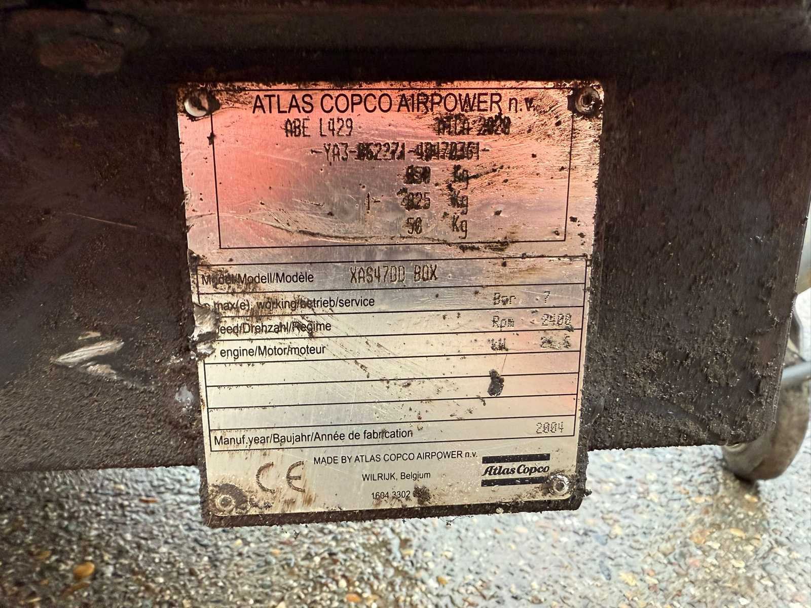 Voorzien van: stalen geluiddempende kap, opbergrek, luchtdroger, luchtkoeler, 2 cilinder Deutz dieselmotor Nee Merk: Atlas Copco Type: X-AS 47 DD Bouwjaar: 2004 Serienummer: YA3-862271-40470361 Mobiel: true Capaciteit.: 7bar Luchtstroom: 4000l/min Vermogen: 21kW Afgelezen urenstand: 3999hr Luchtdroger: true Totale afmeting L: 3700mm Totale afmeting Breedte: 1400mm Totale afmeting Hoogte: 1500mm