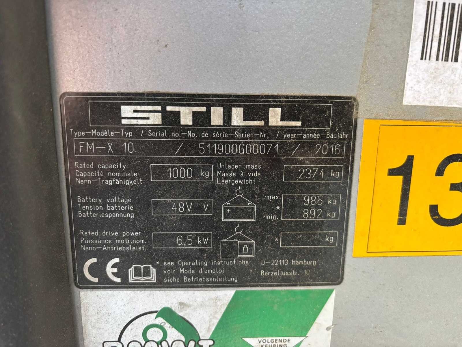 Nee Merk: Stihl Type: FM X 10 Bouwjaar: 2016 Serienummer: 511900G00071 Brandstof: Elektrisch Soort band: Vol rubber Aantal wielen: 3 Afgelezen urenstand: 11988 Accu lader: true Duplex mast: true Eigen gewicht: 2374kg Hefvermogen: 1000kg Lepellengte: 1000mm Max. hefhoogte: 6530mm Minimale doorrijhoogte: 2700mm Totale afmeting L: 2500mm Totale afmeting Breedte: 1270mm